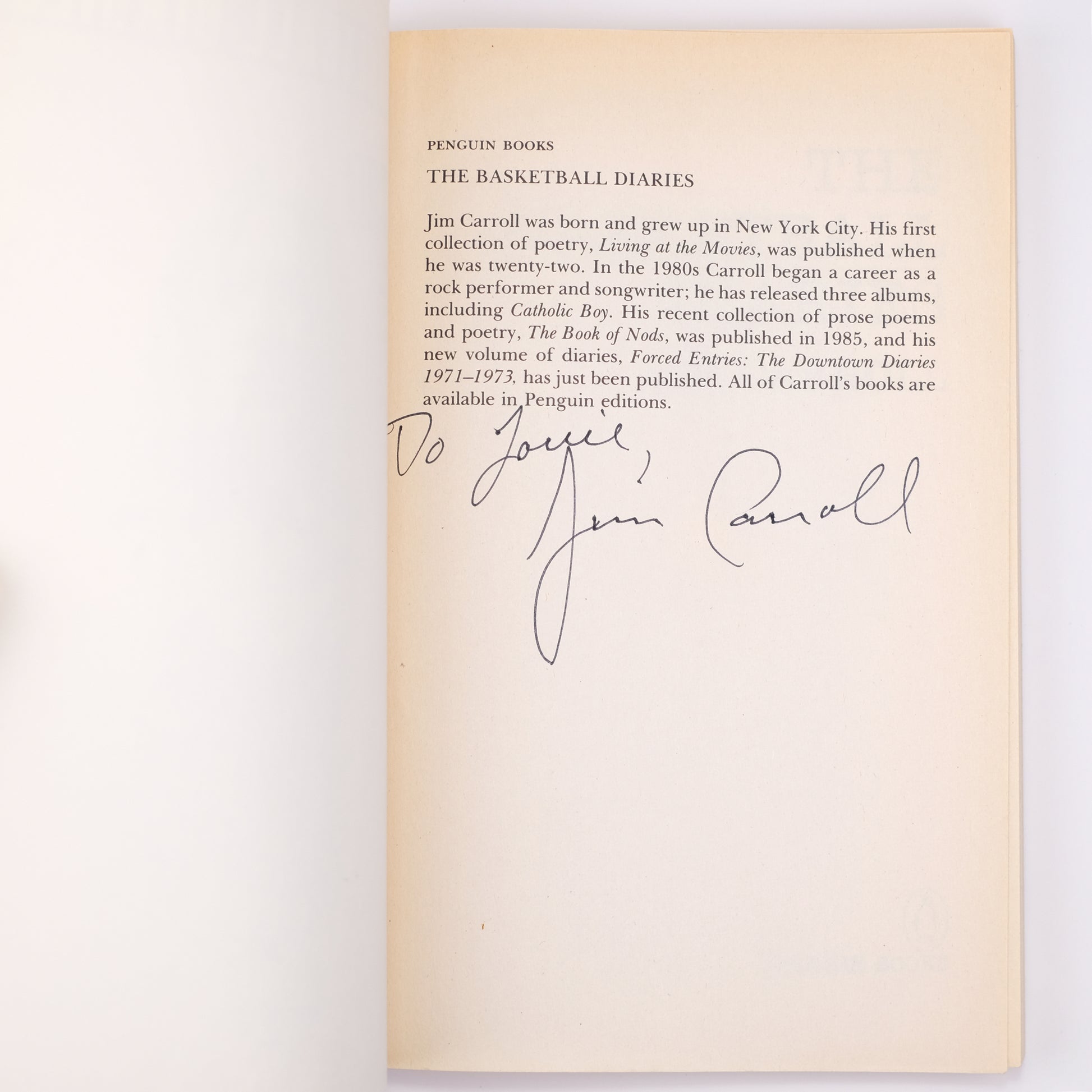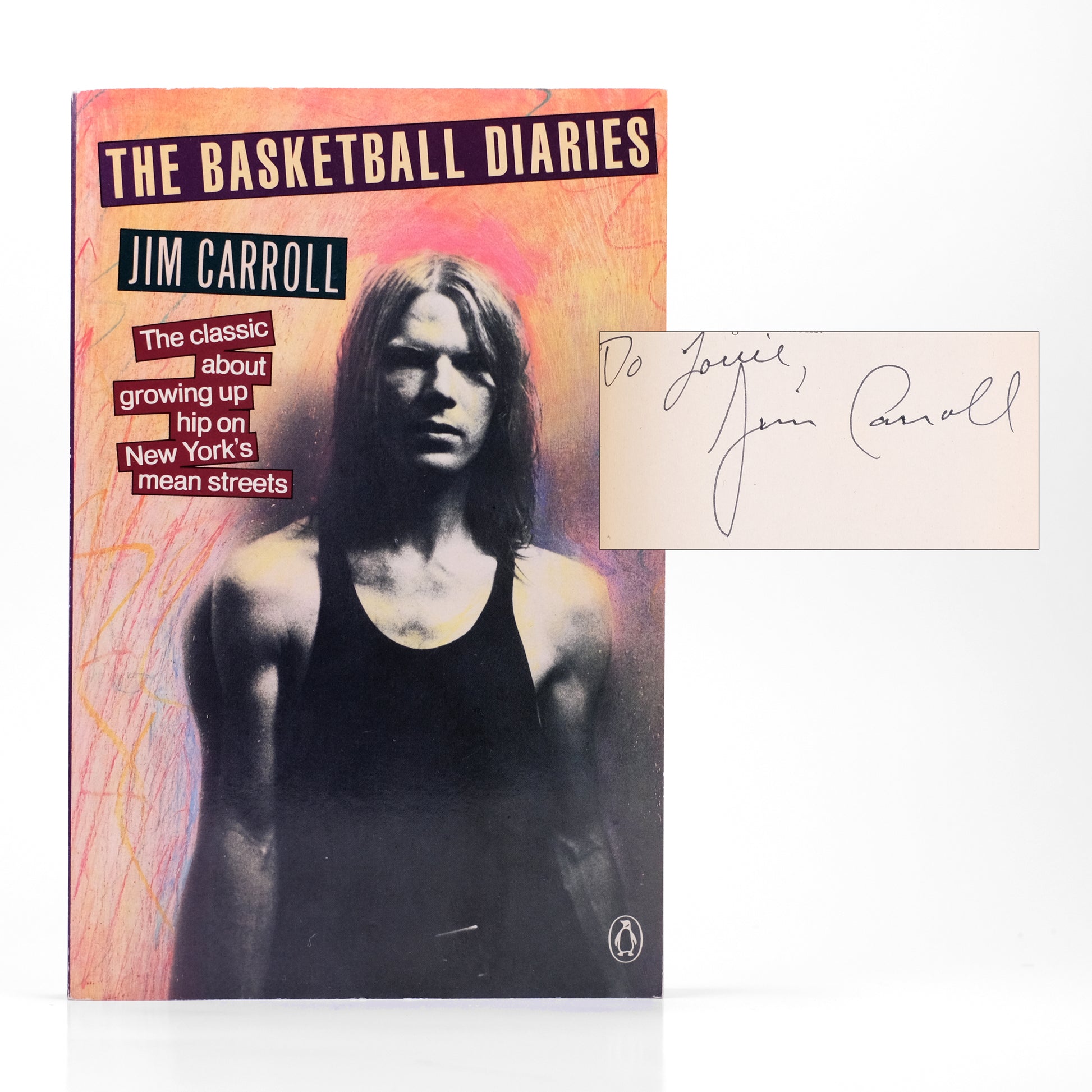 Inscribed reprint edition of Carroll’s landmark coming-of-age story, an edited collection of the diaries he kept as a teenager in 1960s New York City. NY: Penguin Books, 1987. SIGNED and inscribed by Carroll, "To Louie," on the front leaf. Perfect-bound in printed glossy wraps, 7-3/4 x 5 in. 210pp. About fine, with only the lightest of edge and corner wear.
