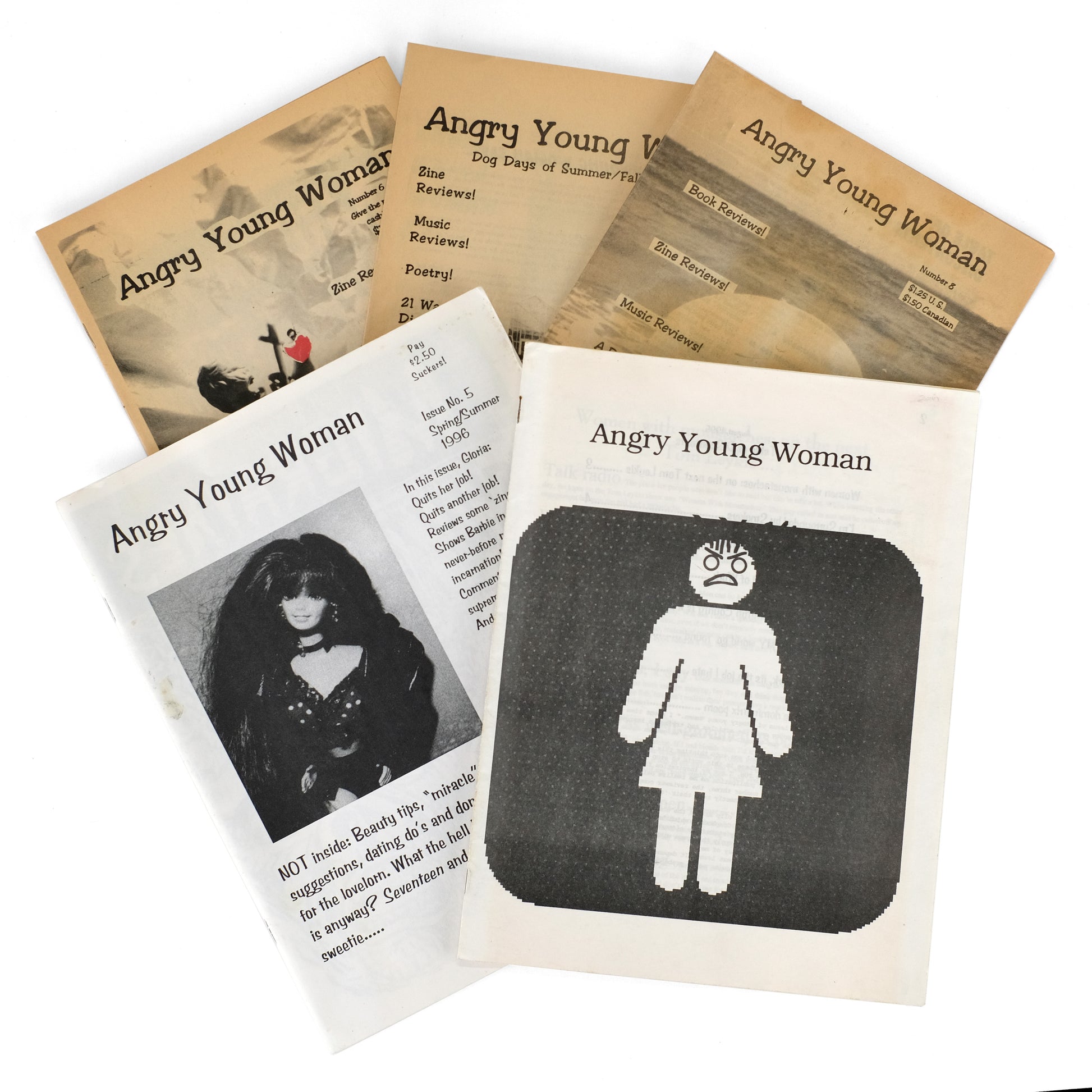Fort Wayne, IN: Angry Young Woman, 1995-1998. 5 vols. 19; 43; 30; 30; 30pp; b&w illus. 4to (Nos. 4 & 5: 8-1/2 x 11 in; Nos. 6-8, 7 x 10-1/2 in, newsprint). Saddle-stapled in self wraps. Scattered cover soiling and corner wear; nos. 6-8 toned throughout; altogether good to very good.