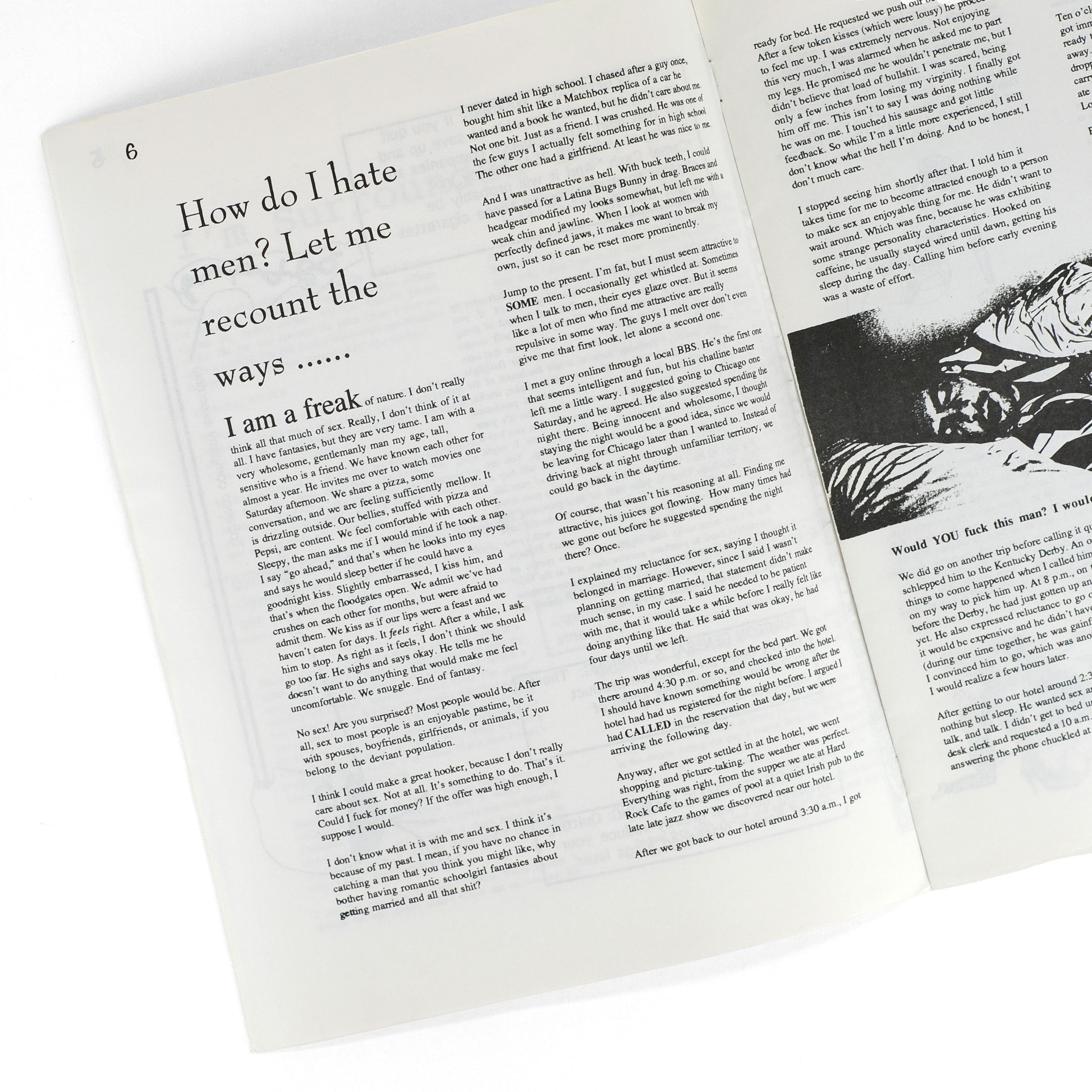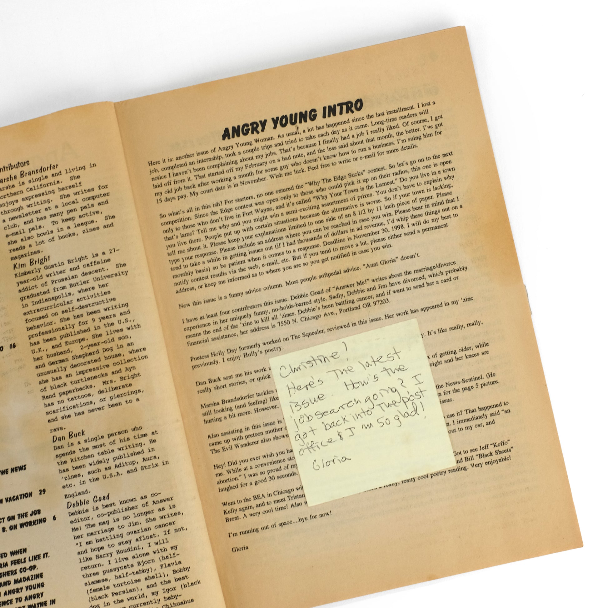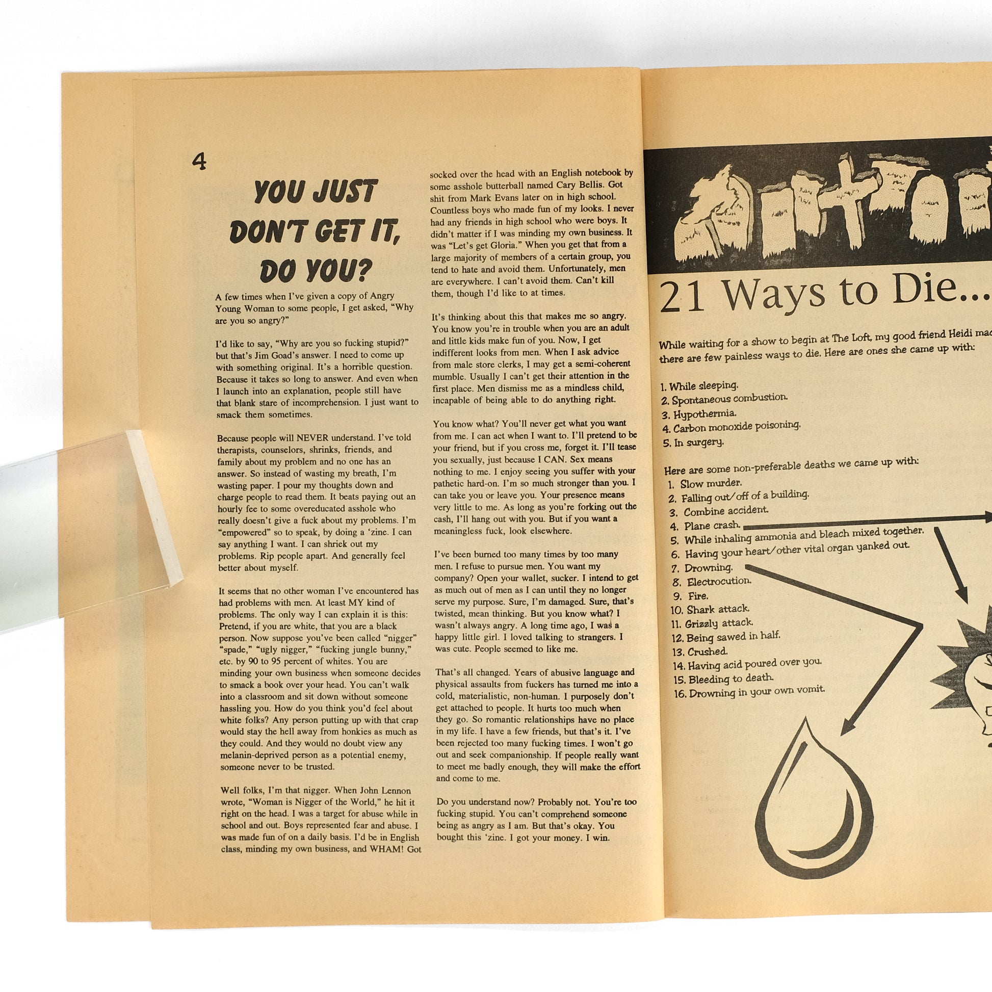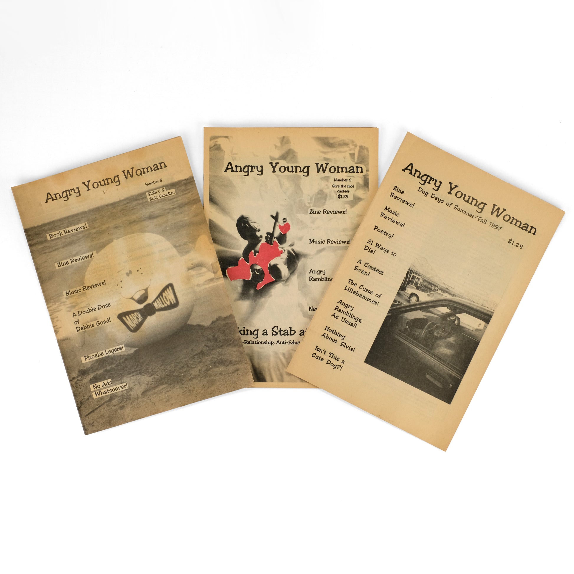 Final five (of eight total) issues of this lively feminist zine, produced by Gloria Diaz while living in Fort Wayne, Indiana as a post-college twentysomething. True to its title, much of the zine is dedicated to rants against such personal and societal irritants as men ("How do I hate men? Let me recount the ways..." in #4), sexism ("Barbie as Riot Grrrl" in #5), work ("Last Days in Hell: I quit my job at the newspaper," in #5) , smokers, higher education, white supremacy, etc. With much space also dedicated to zine and music reviews, band interviews (The Migraines, Sweet Baby Onion, Phoebe Legere); with black-and-white illustrations and photographs throughout. Contents principally the work of Diaz, but with additional contributors including Sharon Hart ("Rush Limpballs Gets Castrated" in #5), Debbie Goad ("Animals Are Better Than People," in #6), Kimberly J. Bright ("The Politics of Condom Use" in #6) , Marsha Brandsdorfer ("Aging and Vanity" in #8), et al. Diaz has acknowledged as a key influence on Angry Young Woman Jim and Debbie Goad's seminal (and notorious) early 1990s zine, Answer Me!, as well as the punk-inflected feminism of the Riot Grrrl movement. OCLC reports three institutions holding copies: Columbia, Michigan, and Wisconsin-Milwaukee. $400