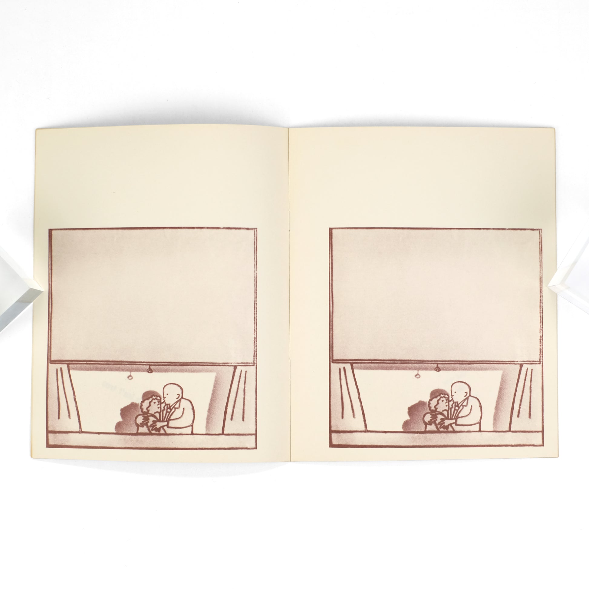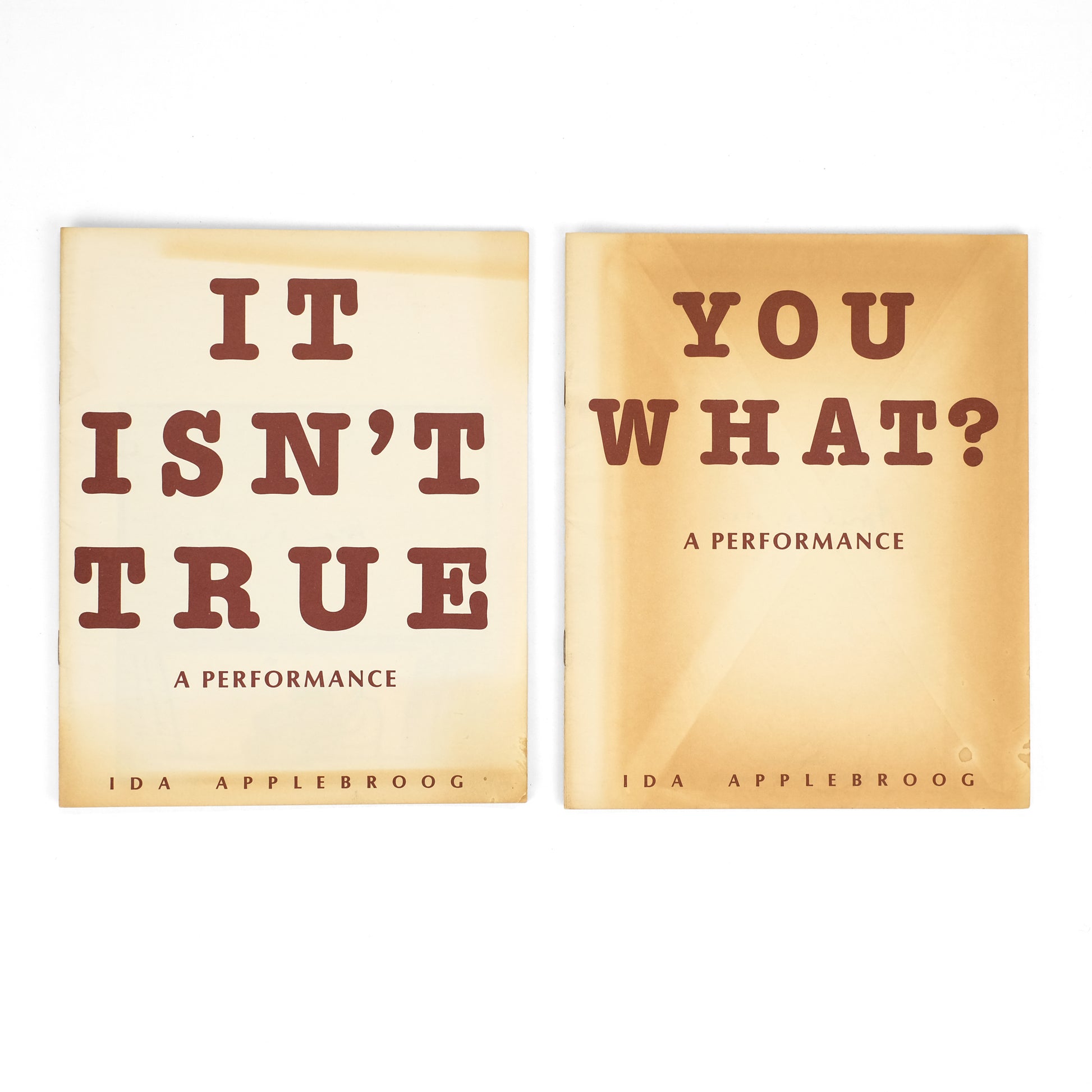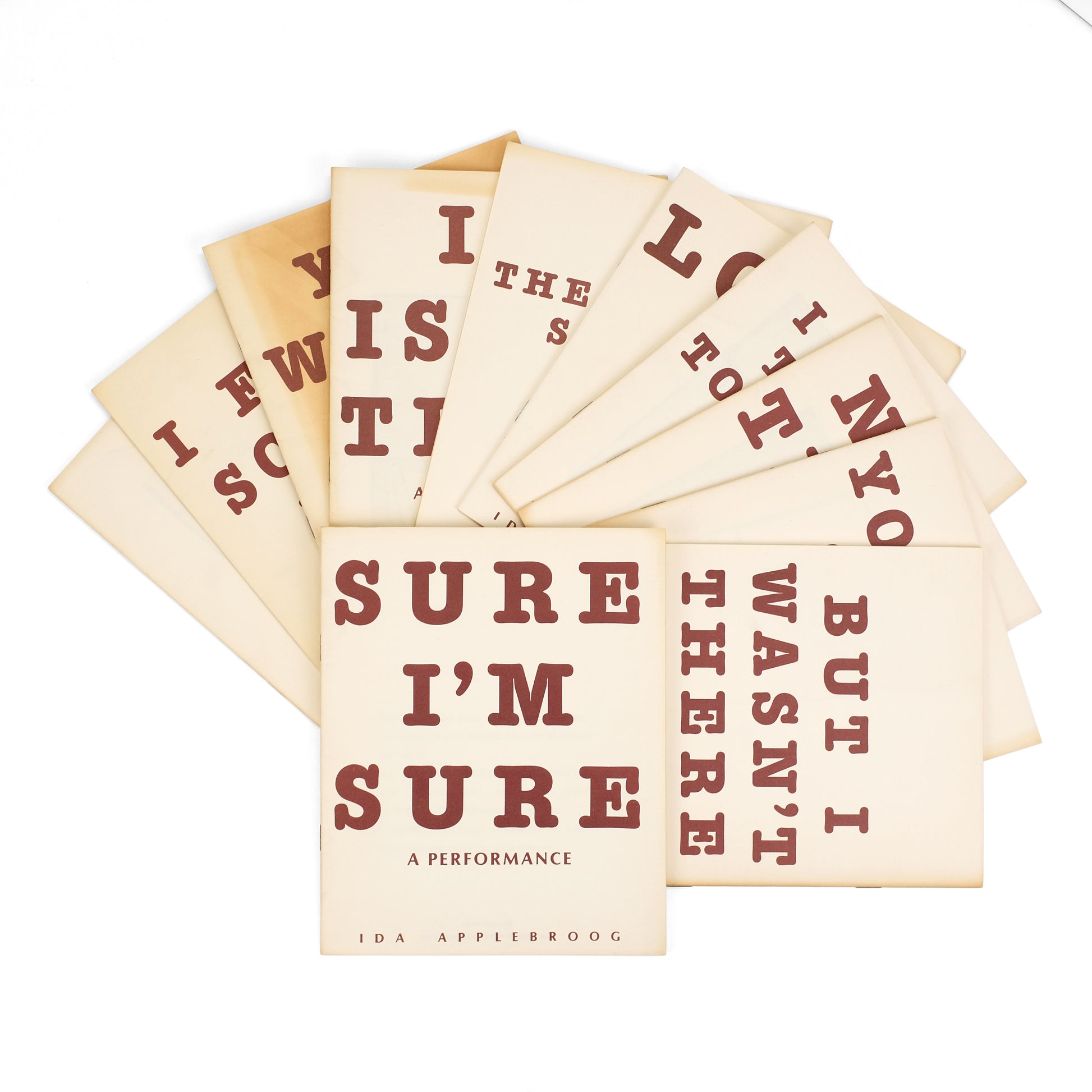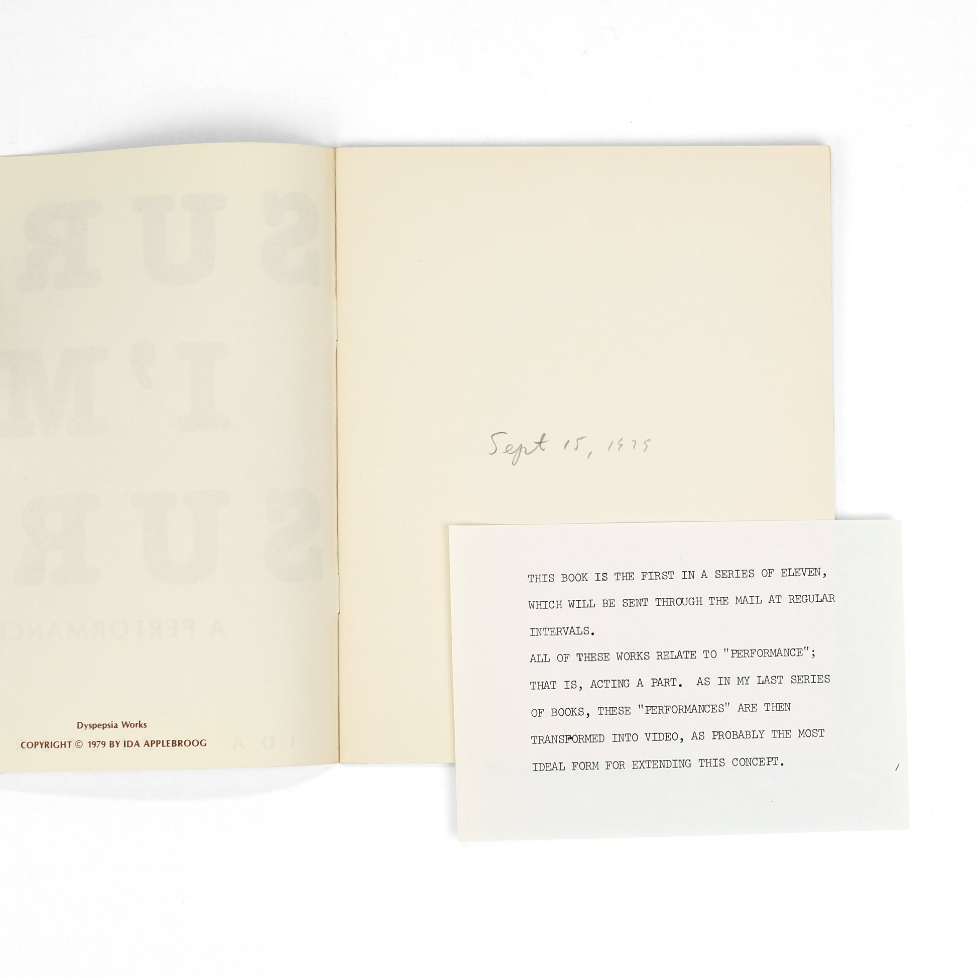 Laid into the first volume of this set is a typed slip of paper, in which Applebroog introduces the project: "This book is the first in a series of eleven, which will be sent through the mail at regular intervals. All of these works relate to "performance"; that is, acting a part. As in my last series of books, these "performances" are then transformed into video, as probably the most ideal form for extending this concept." The titles, in order: Sure I'm Sure, But I Wasn't There, You'll See, Now Then, I Pretend to Know, Look At Me, The Sweet Smell of Sage, It Isn't True, You What?, I Feel Sorry for You, [Untitled/"The End"].