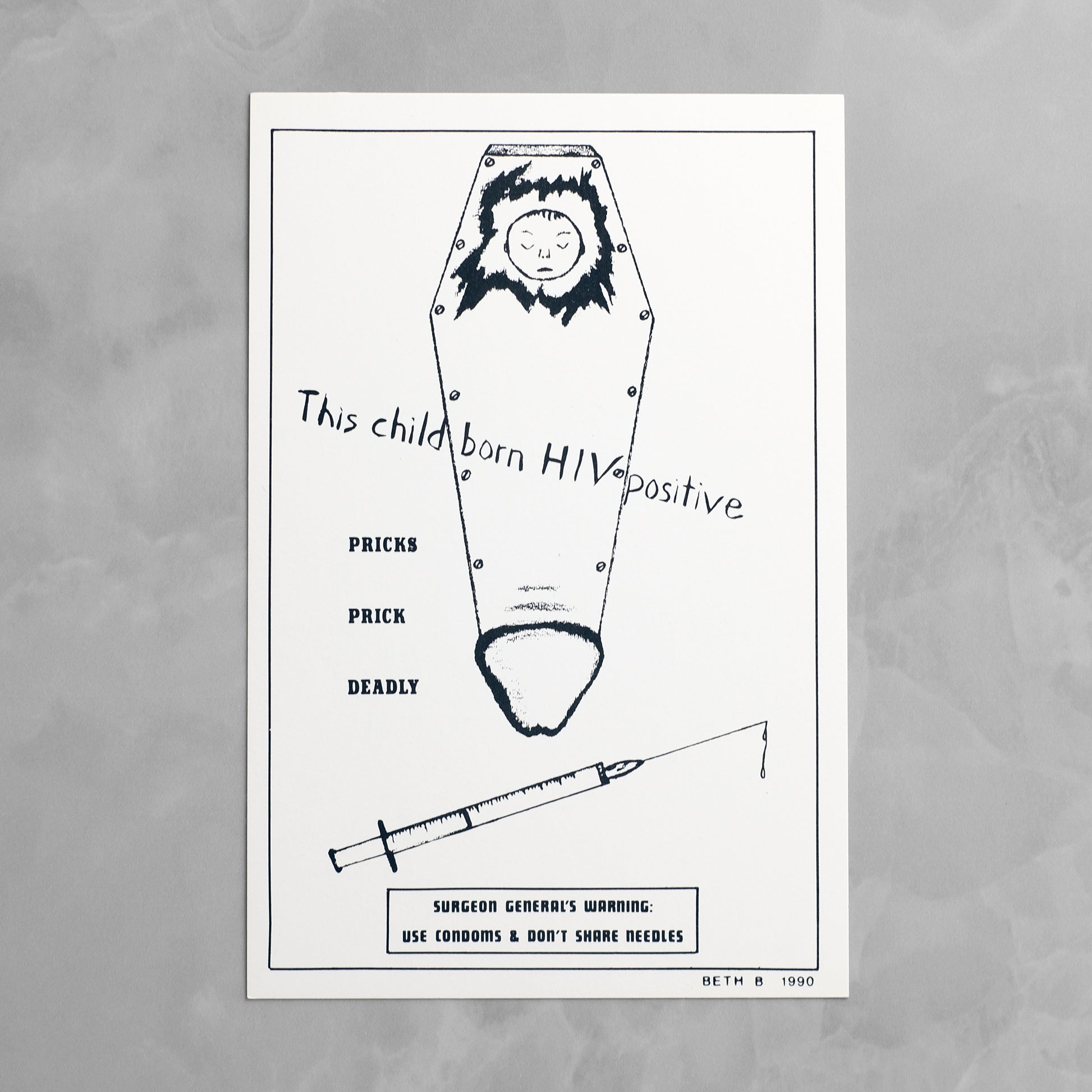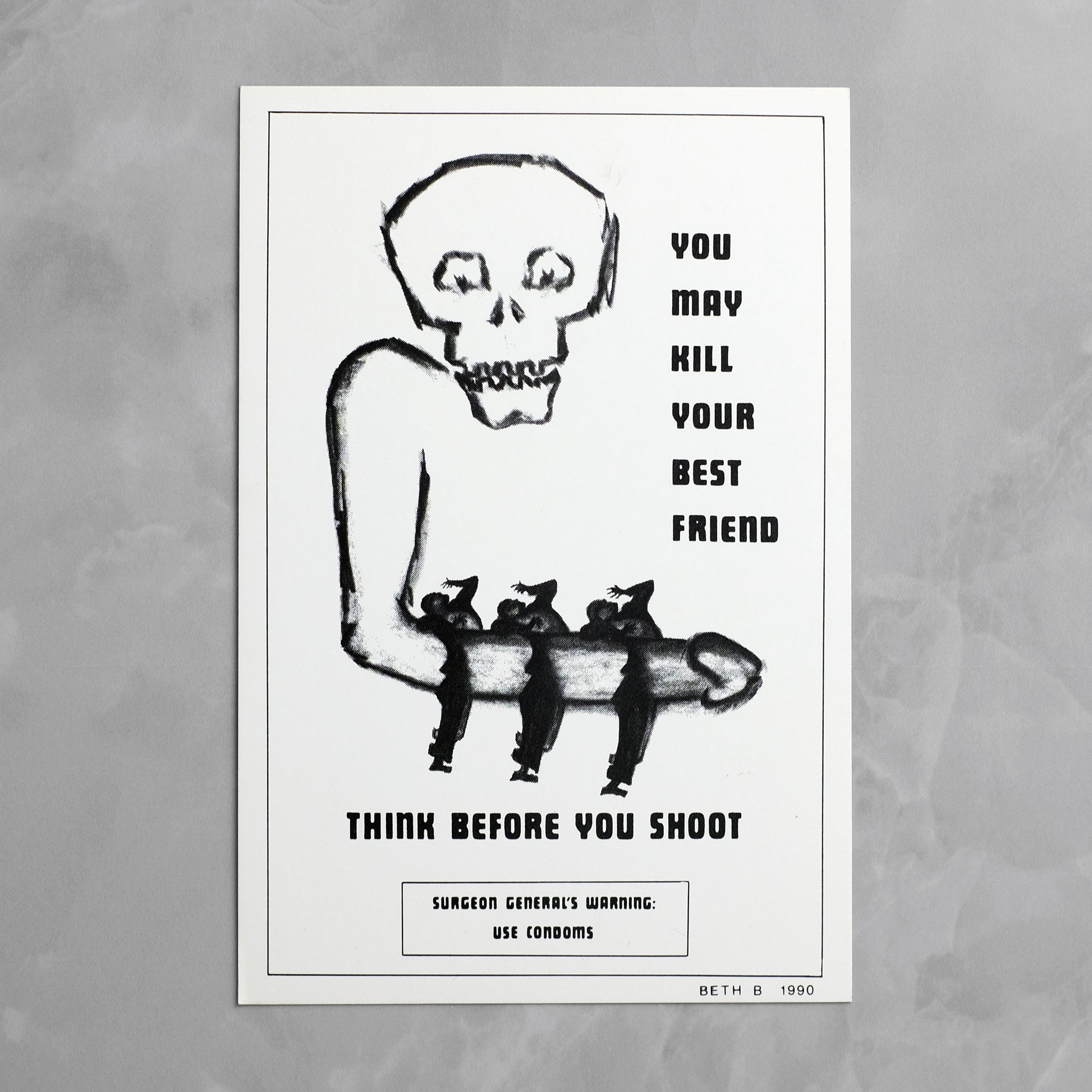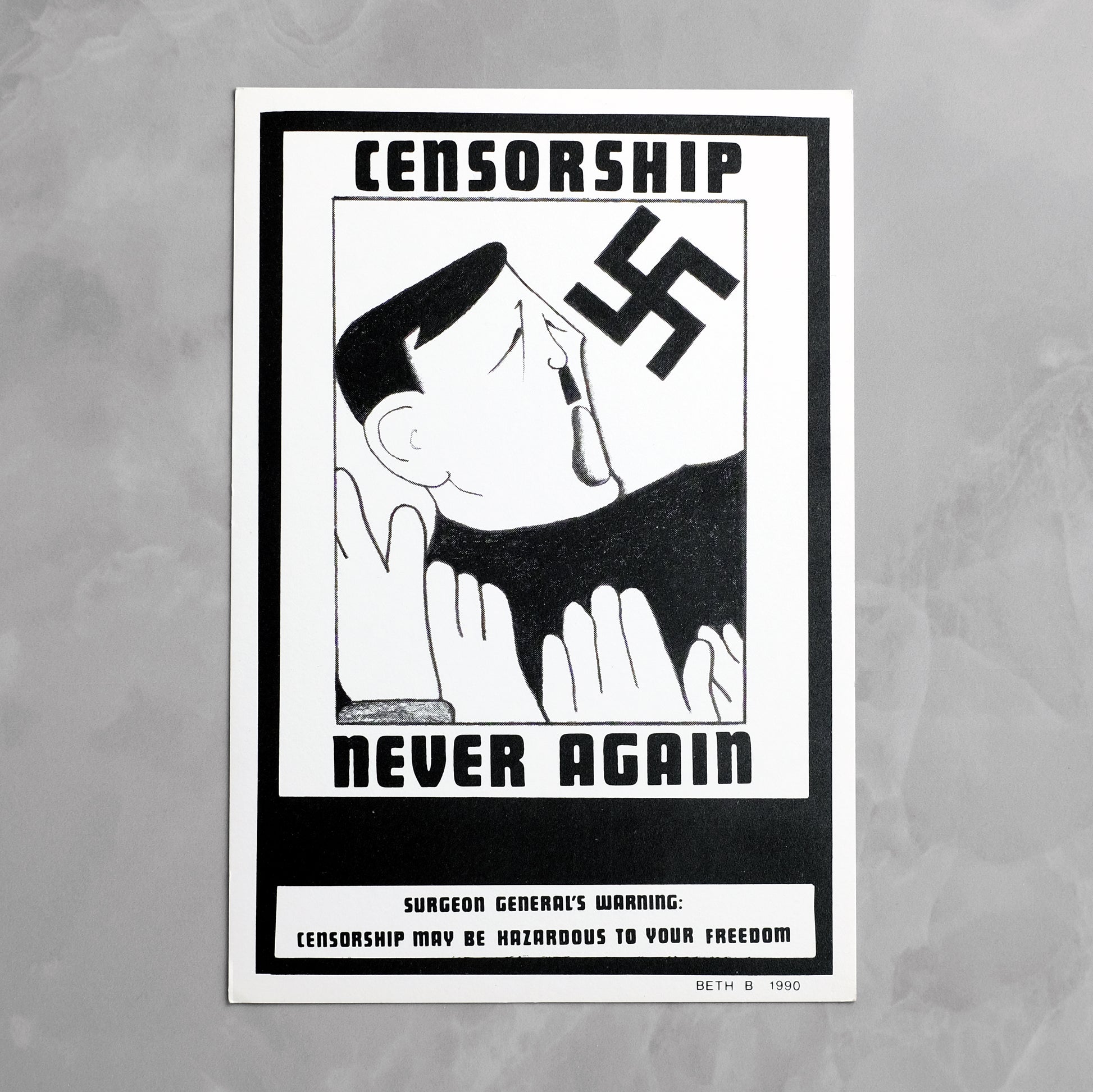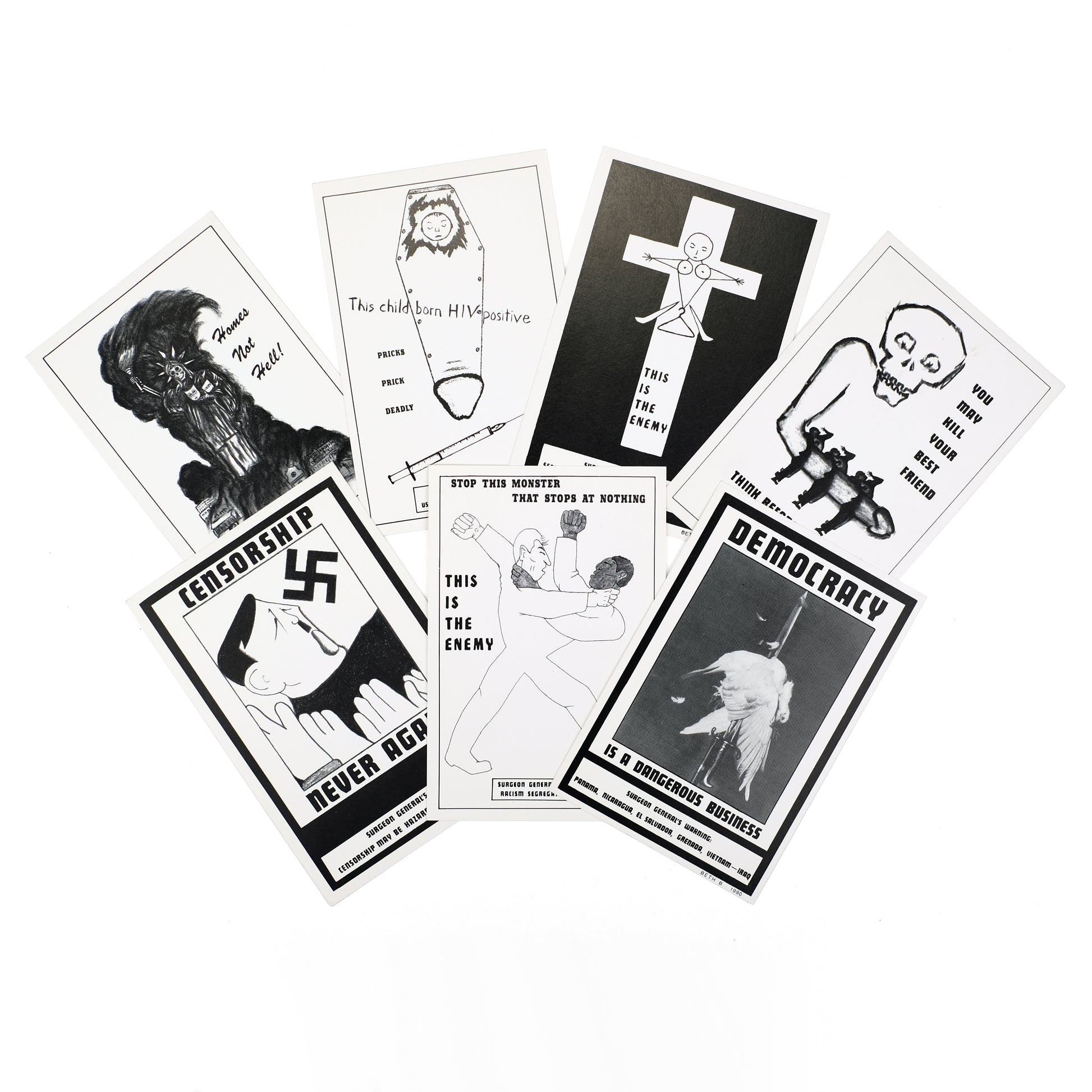 Complete set of seven "Surgeon General's Warning" postcards by New York artist and No Wave filmmaker Beth B (b. 1955). Animated by the same punk-inflected social satire that informs much of her work, the series utilizes imagery drawn from pop culture and 20th century propaganda to address such issues as AIDS, abortion, censorship, and racism. Also produced as a series of posters, which debuted over the course of seven weeks at various New York locations; reportedly, copies of the postcard versions were mailed to various religious, political, and conservative leaders. A scarce example of this ephemeral series; OCLC locates only a single holding of the postcard set, at MoMA.