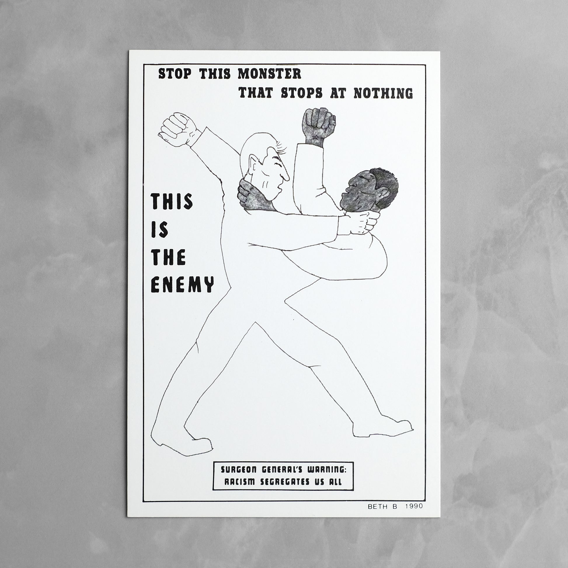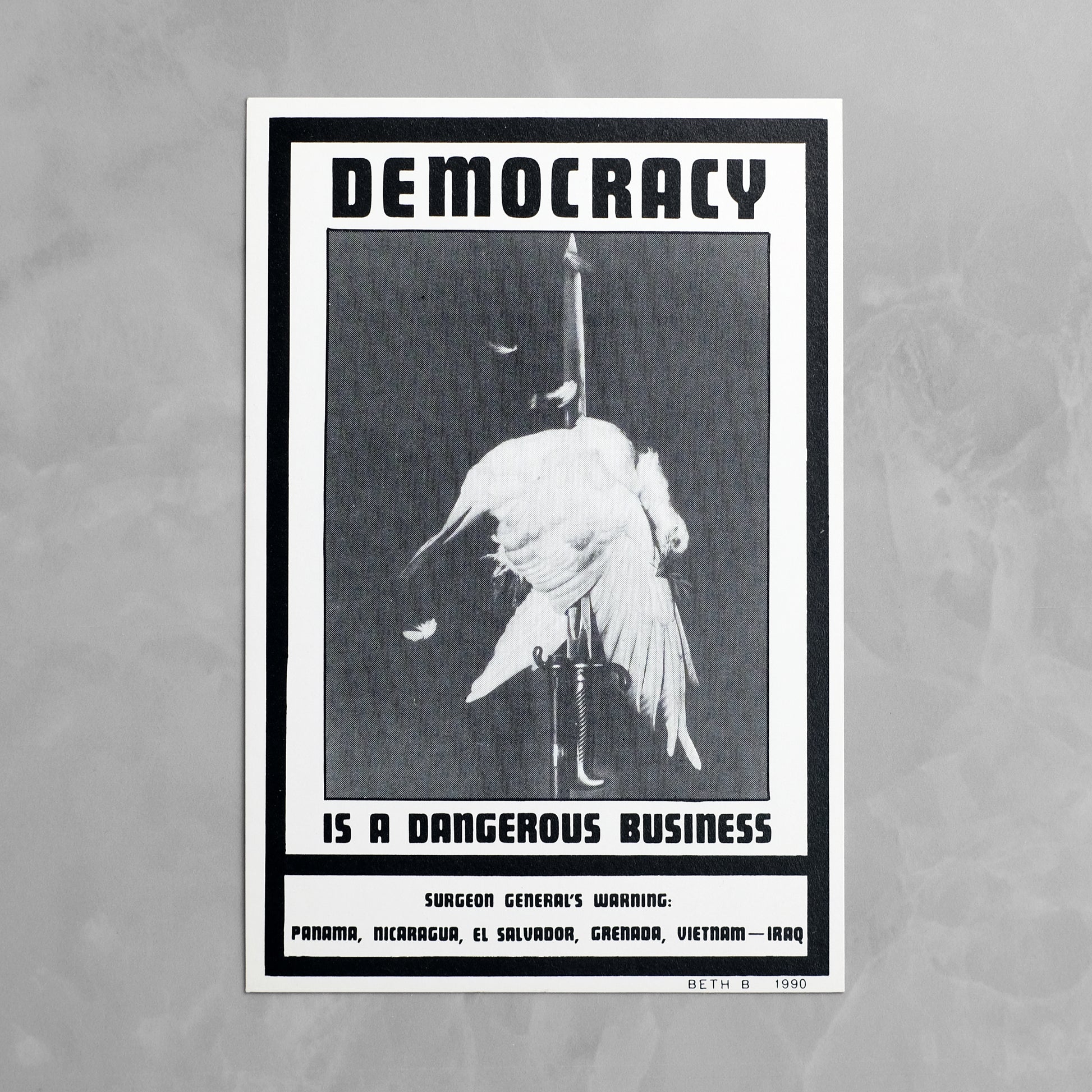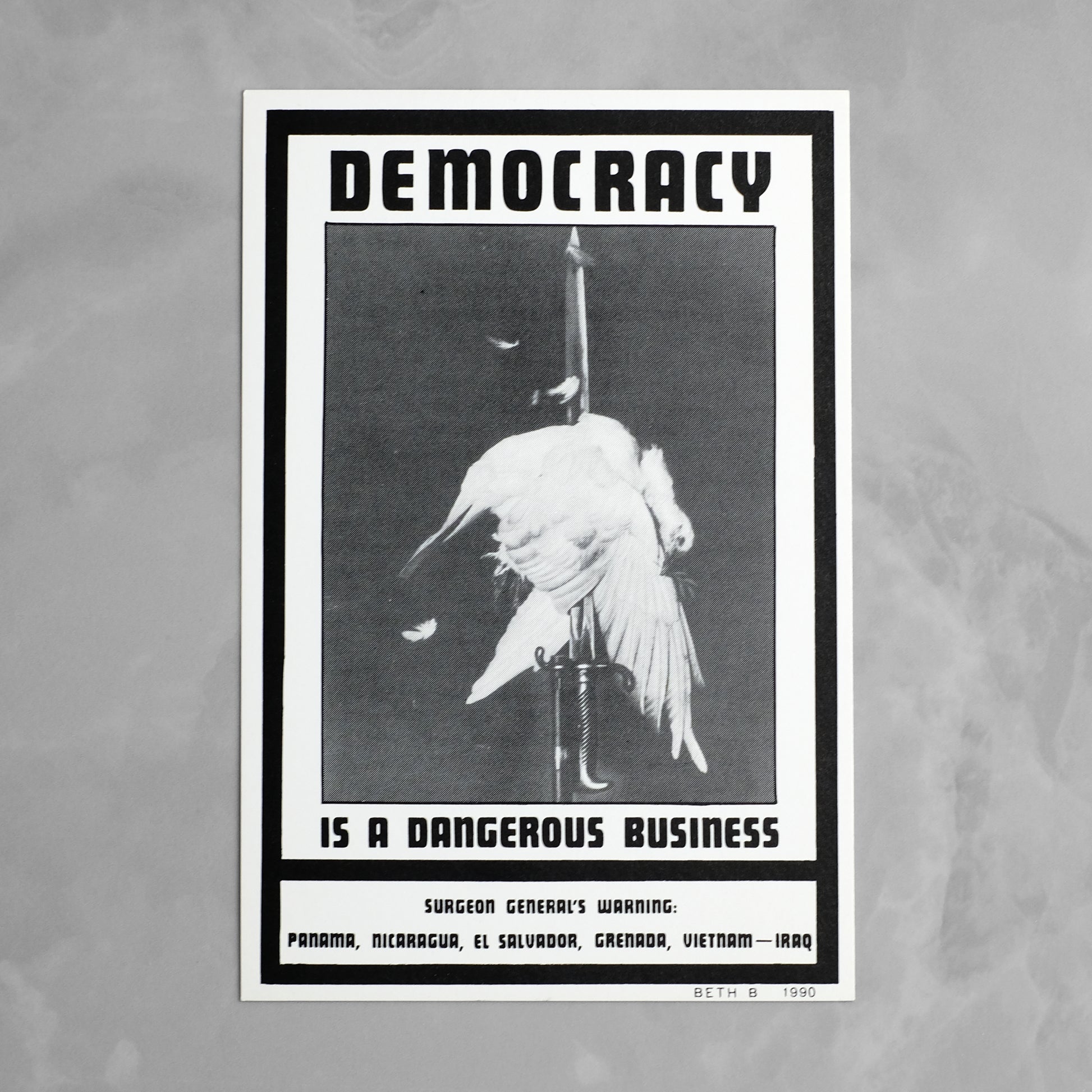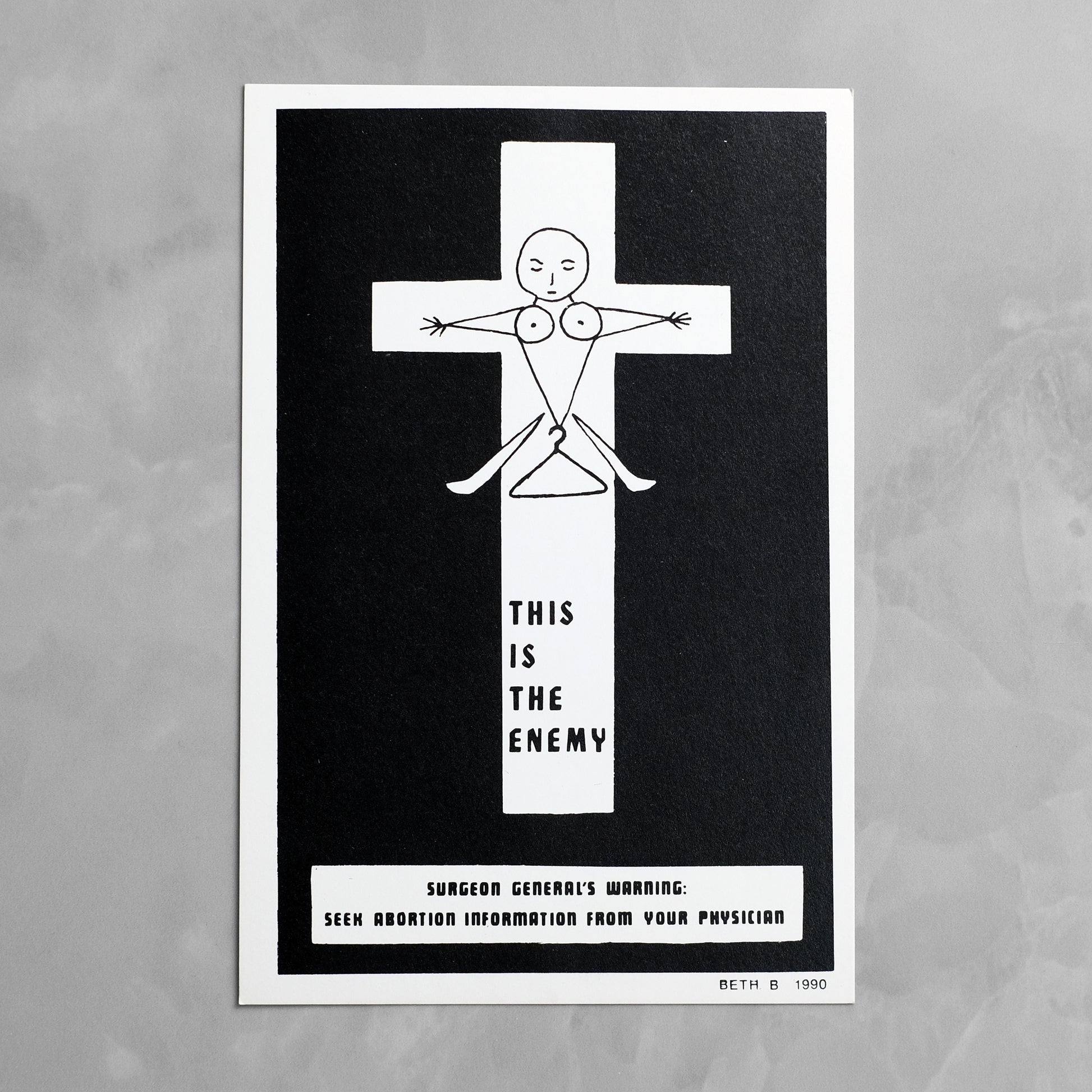Complete set of seven "Surgeon General's Warning" postcards by New York artist and No Wave filmmaker Beth B (b. 1955). Animated by the same punk-inflected social satire that informs much of her work, the series utilizes imagery drawn from pop culture and 20th century propaganda to address such issues as AIDS, abortion, censorship, and racism. Also produced as a series of posters, which debuted over the course of seven weeks at various New York locations; reportedly, copies of the postcard versions were mailed to various religious, political, and conservative leaders. A scarce example of this ephemeral series; OCLC locates only a single holding of the postcard set, at MoMA.