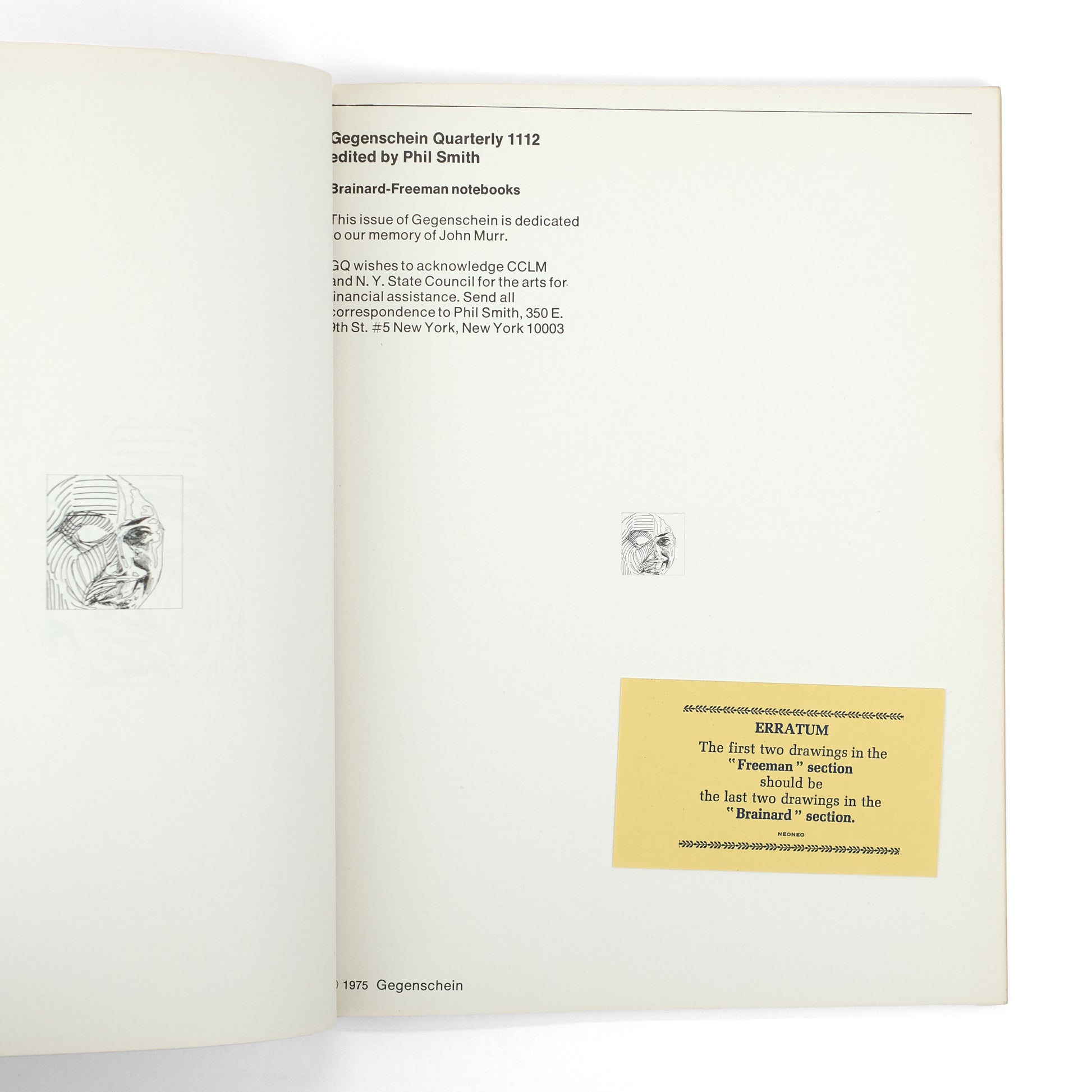 Selections of drawings and texts from the notebooks of American artists Joe Brainard and Herm Freeman, with respective introductions by John Ashbery and Phil Demeyes. Edited by Phil Smith, and issued as Gegenschein Quarterly 1112.