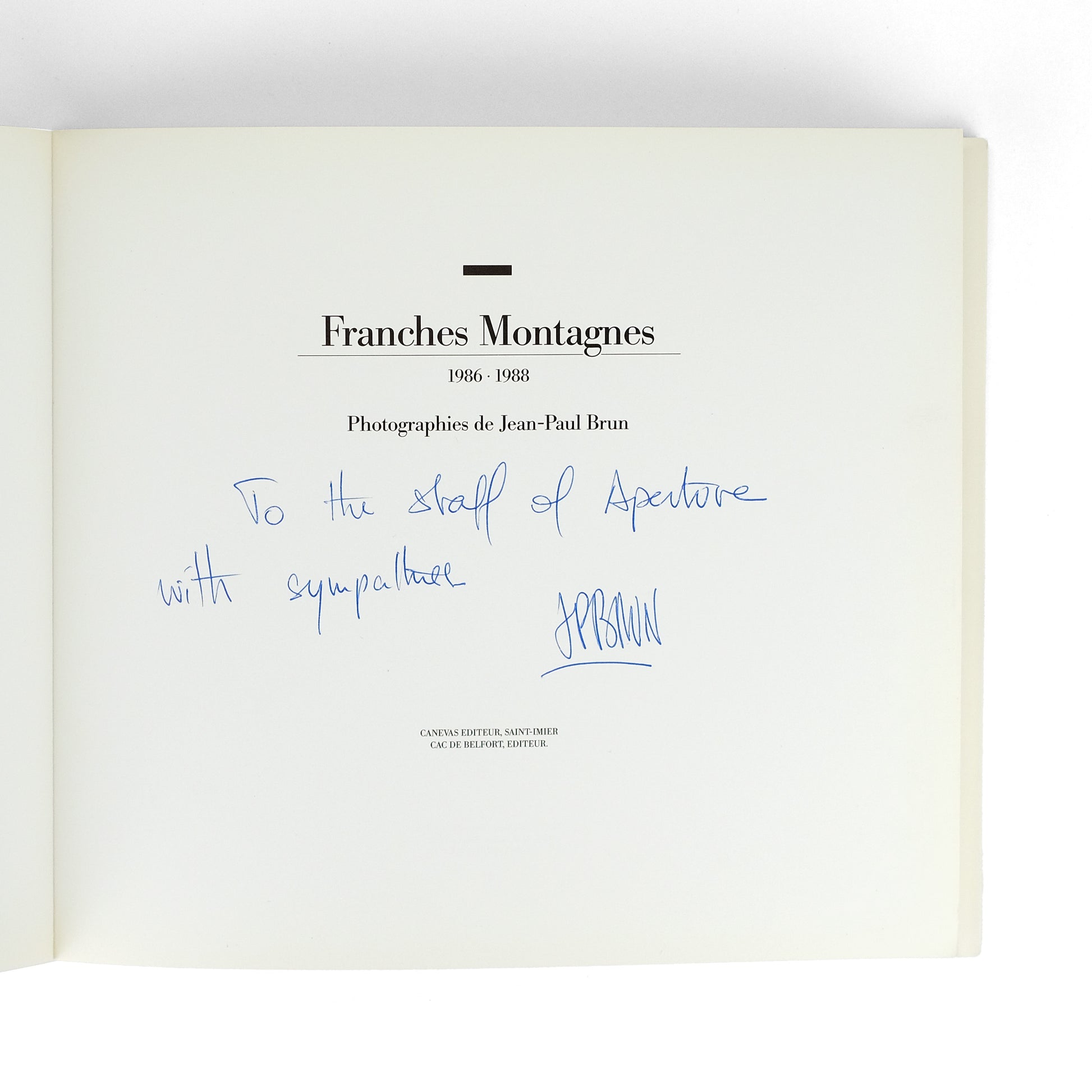 Saint-Imier: Canevas Editeur, 1989. 43pp; color plates. Oblong 8vo. Plain boards with exposed cloth spine, photo-plate mounted to front board. Some light wear and abrasions to boards, else near fine. Signed and inscribed by Brun to title page: "To the staff of Aperture with sympathies."