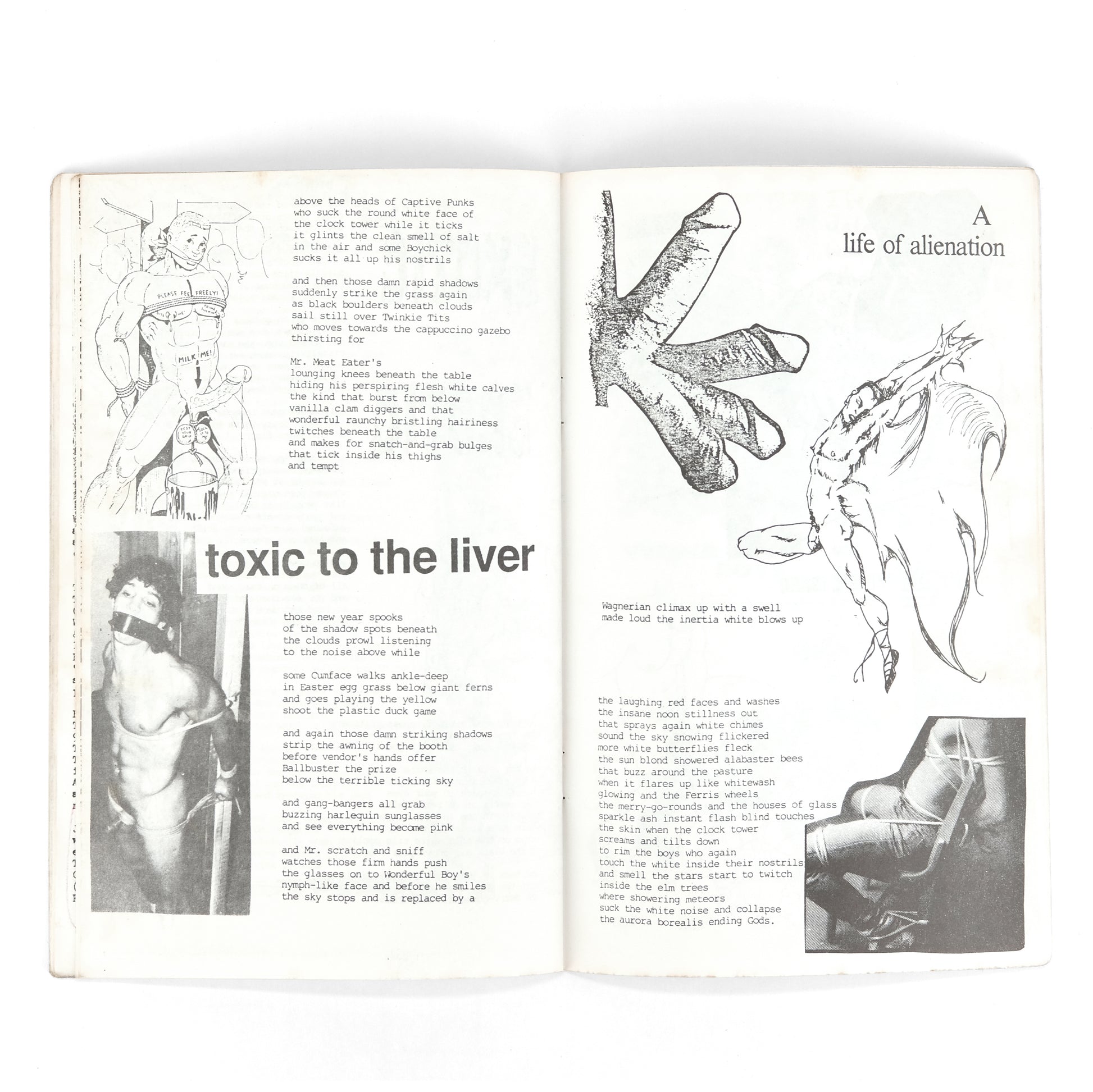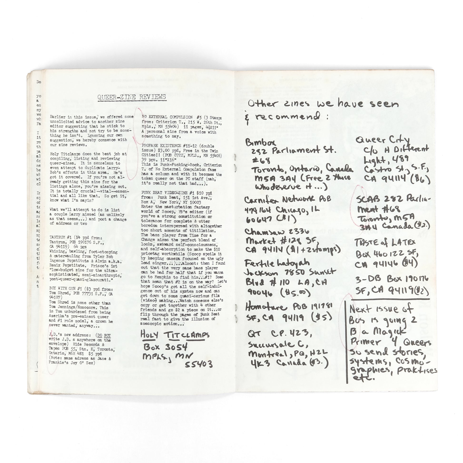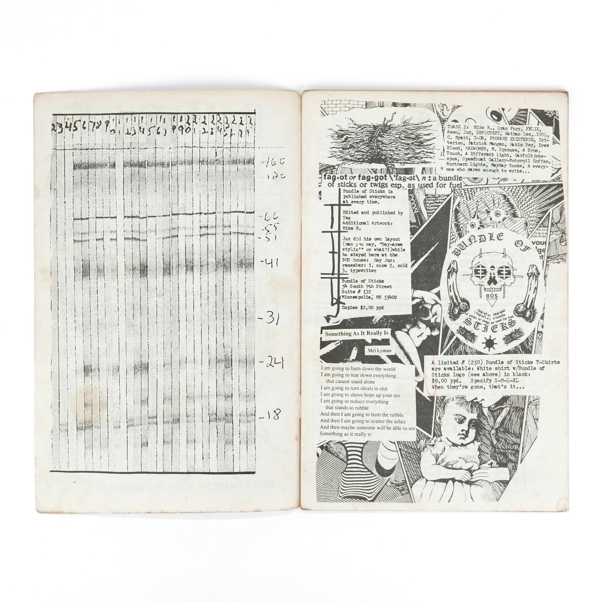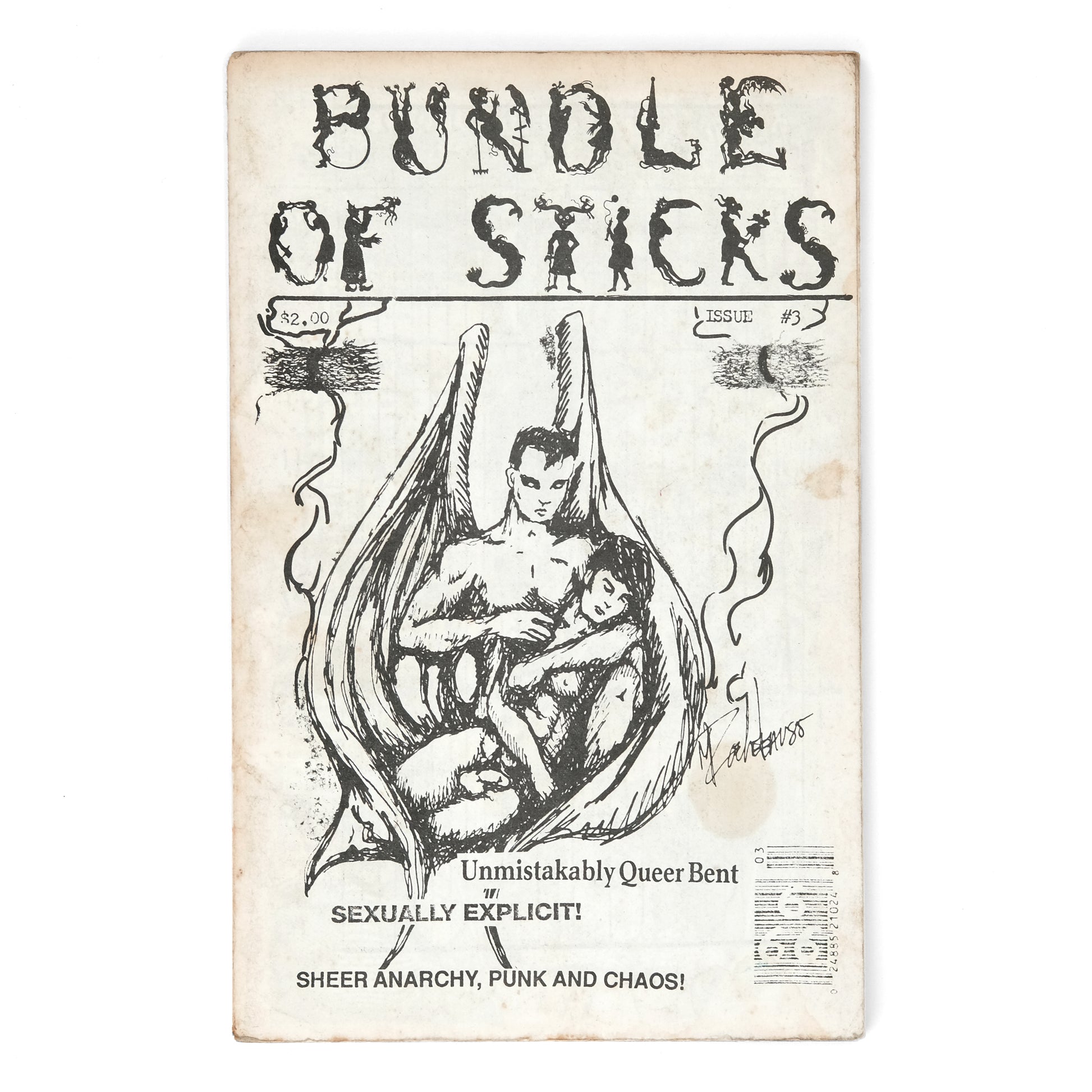 Third issue of this Minneapolis queer zine, its title a play on the historical meaning of the word "faggot;" edited and published by John Tomars under his Teg pseudonym. Contents, by Teg and others, include letters (one from Toronto queer zinester Johnny Noxzema); poems; articles and first-person narratives ("Penises of the Animal Kingdom," "Nervous Gender," "Gender Straightjacket," "Obituary Policy"); an essay on pornography by Hakim Bey; queer zine reviews; etc. Illustrated throughout with black-and-white photo-reproductions, drawings, etc. Not in OCLC. Bronson & Aarons, Queer Zines v1, pp. 44-45.