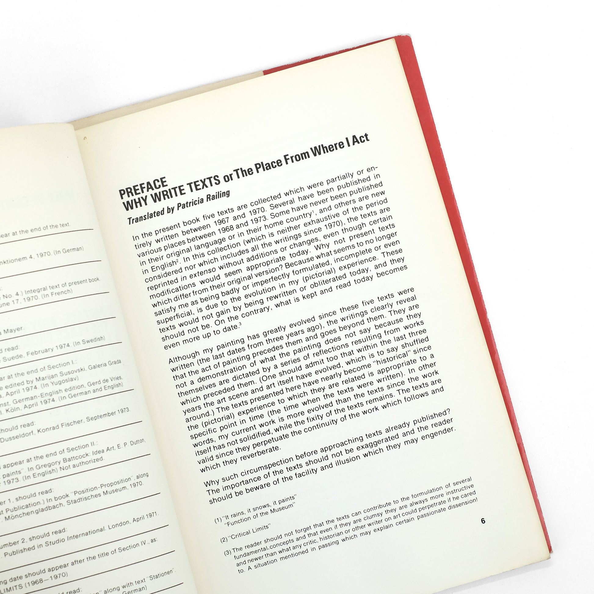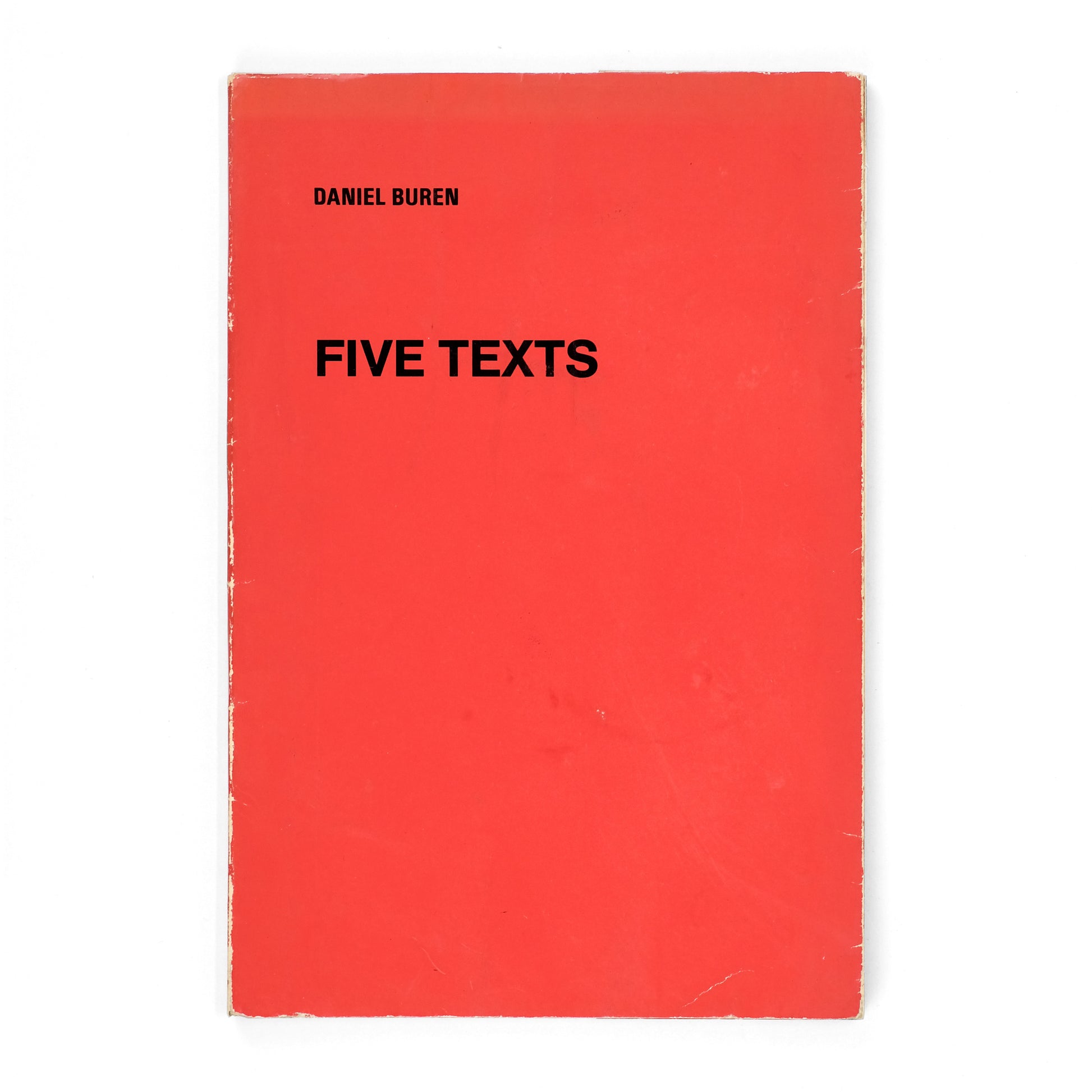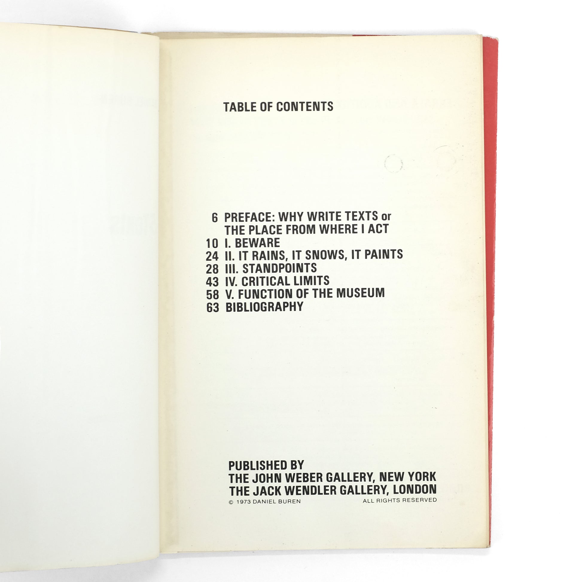 Collection of five essays on various conceptual, formal, and art-historical questions by French conceptual artist and painter Daniel Buren (b. 1938). Texts written "partially or entirely" between 1967 and 1970, with several previously published. Preface by Buren; bibliography at rear. Texts translated by various hands.