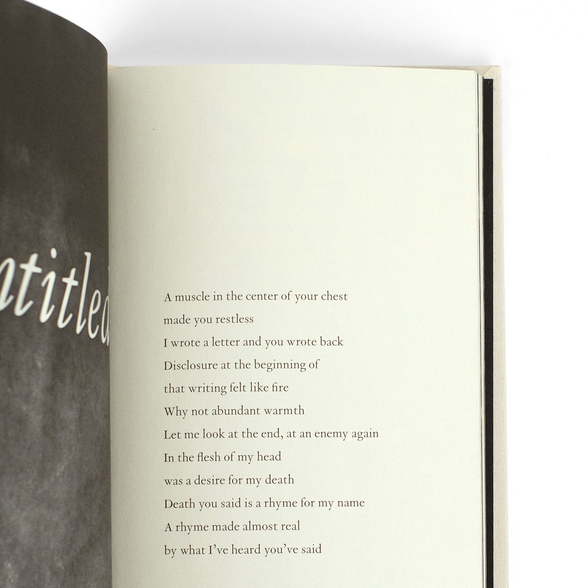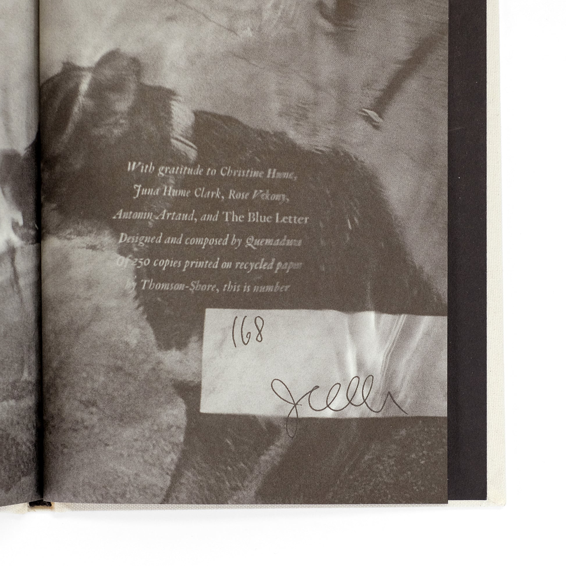 Limited edition bookwork combining poems, illustration, and design by American poet and book designer Jeff Clark (b. 1971). His final volume of original poems, also including his translation of Louis Aragon’s “Poem to Cry in Ruins.”