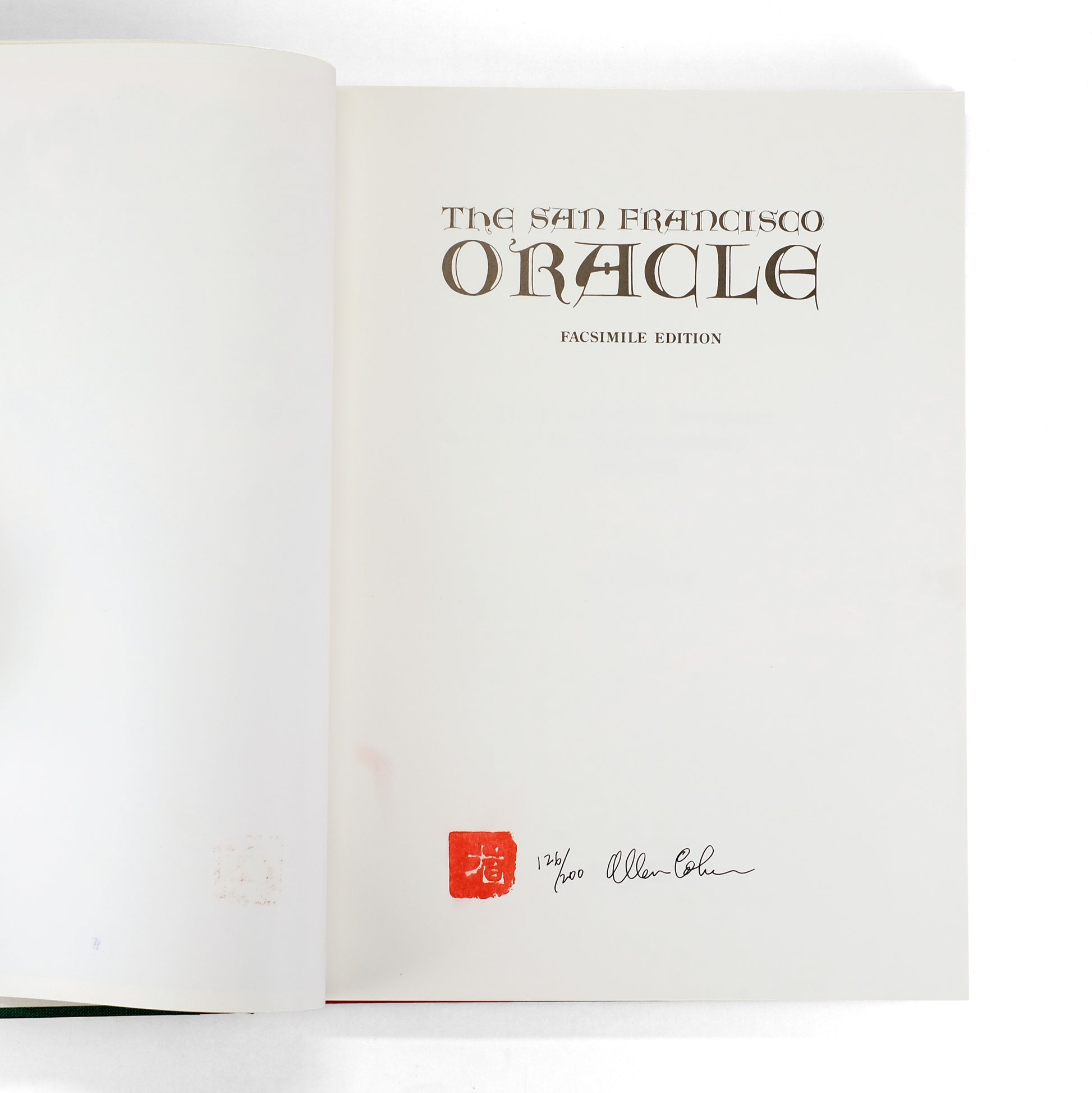Complete, full-color reproduction of all twelve issues of epochal psychedelic newspaper The San Francisco Oracle, a high-point of hippie-era underground publishing, originally issued from 1966-1968. This limited collector's edition numbered, stamped, and signed at title page by Cohen, with a color frontisplate signed by artist Rick Griffin. N.B. This collector's edition originally issued with a separate portfolio of twelve cover prints, here lacking, as common with copies in the secondary market.