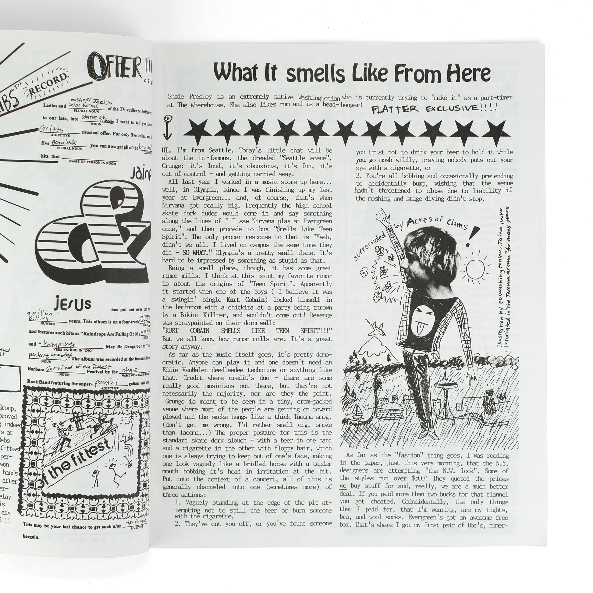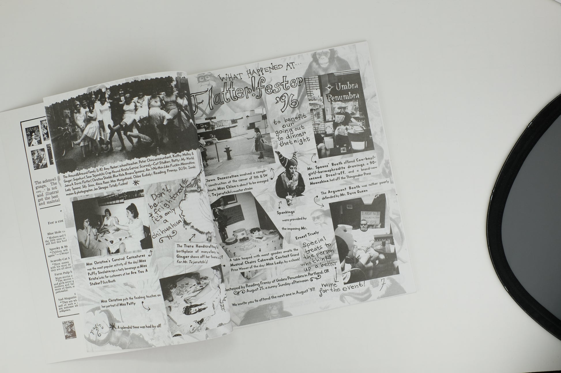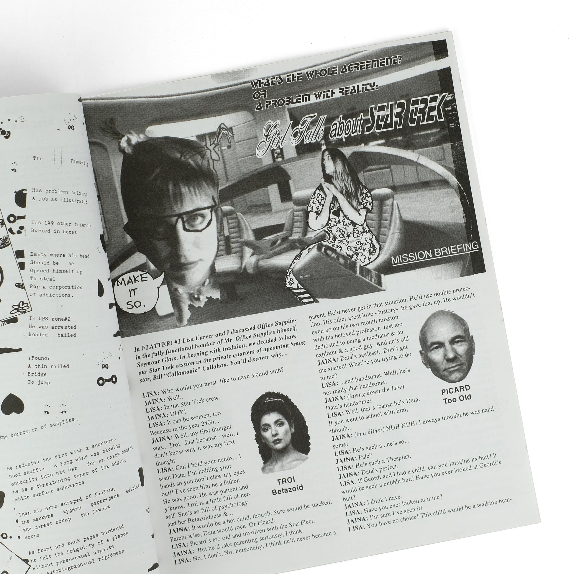 Complete nine-issue run of this wide-ranging 1990s zine, which explored topics including pop culture, alternative music, and sexuality through a humorous and frequently feminist lens. Davis was encouraged to start the zine by Rollerderby's Lisa Carver, who appears in interviews in Nos. 1 and 3 (the latter being a discussion on the relative desirability of characters from Star Trek: The Next Generation). The majority of issues arranged around a loose theme (e.g. "Community Breast," "Cults That Matter!", "Cakes and Spankings," etc), with contributions from Davis and numerous others. Contents include articles, reader letters, fiction and poetry, zine and music reviews, etc; all heavily illustrated with photographs, drawings, and comics (including contributions from Dan Clowes and Adrian Tomine); four issues with color center spreads, else entirely black-and-white. OCLC locates 10 institutions holding copies of Flatter.