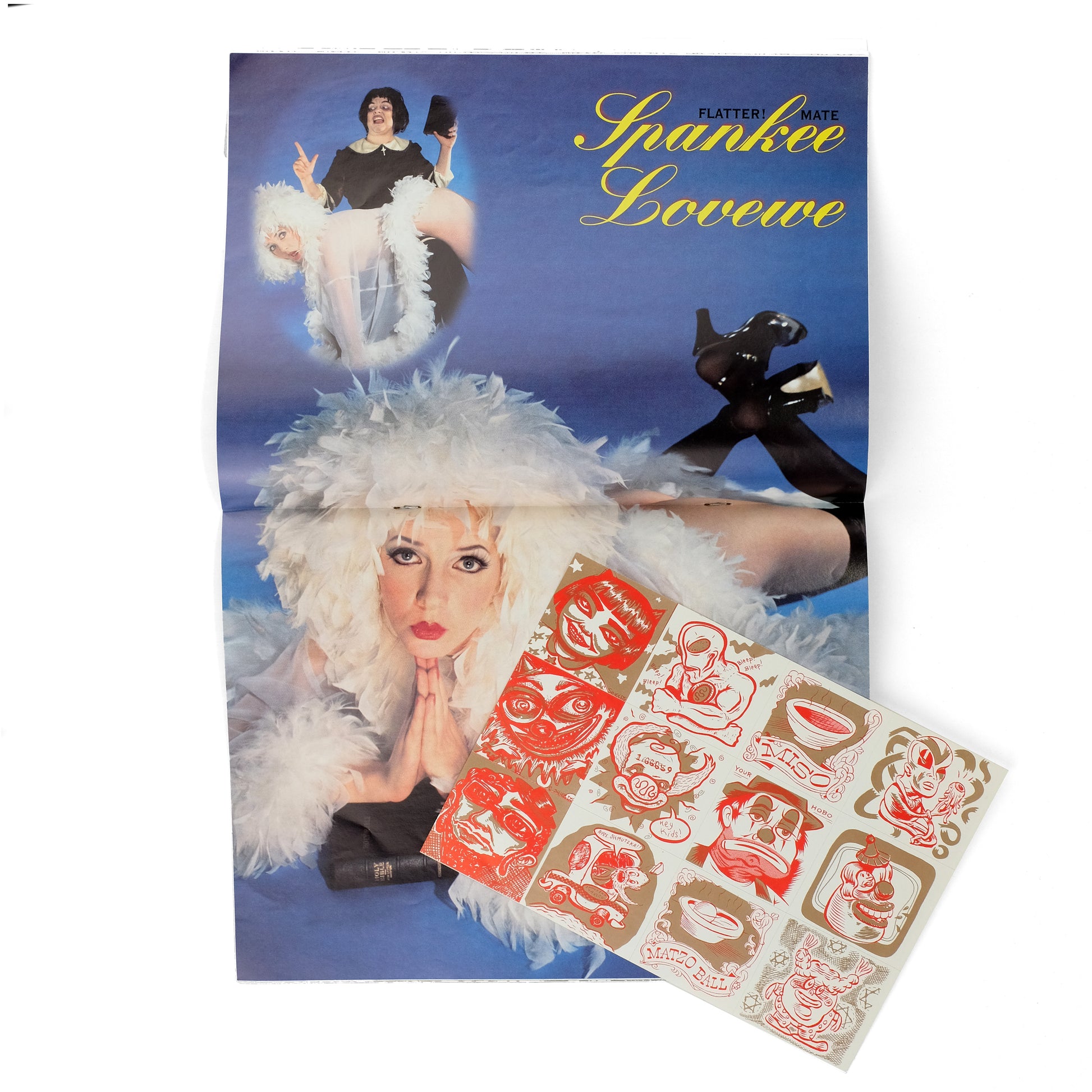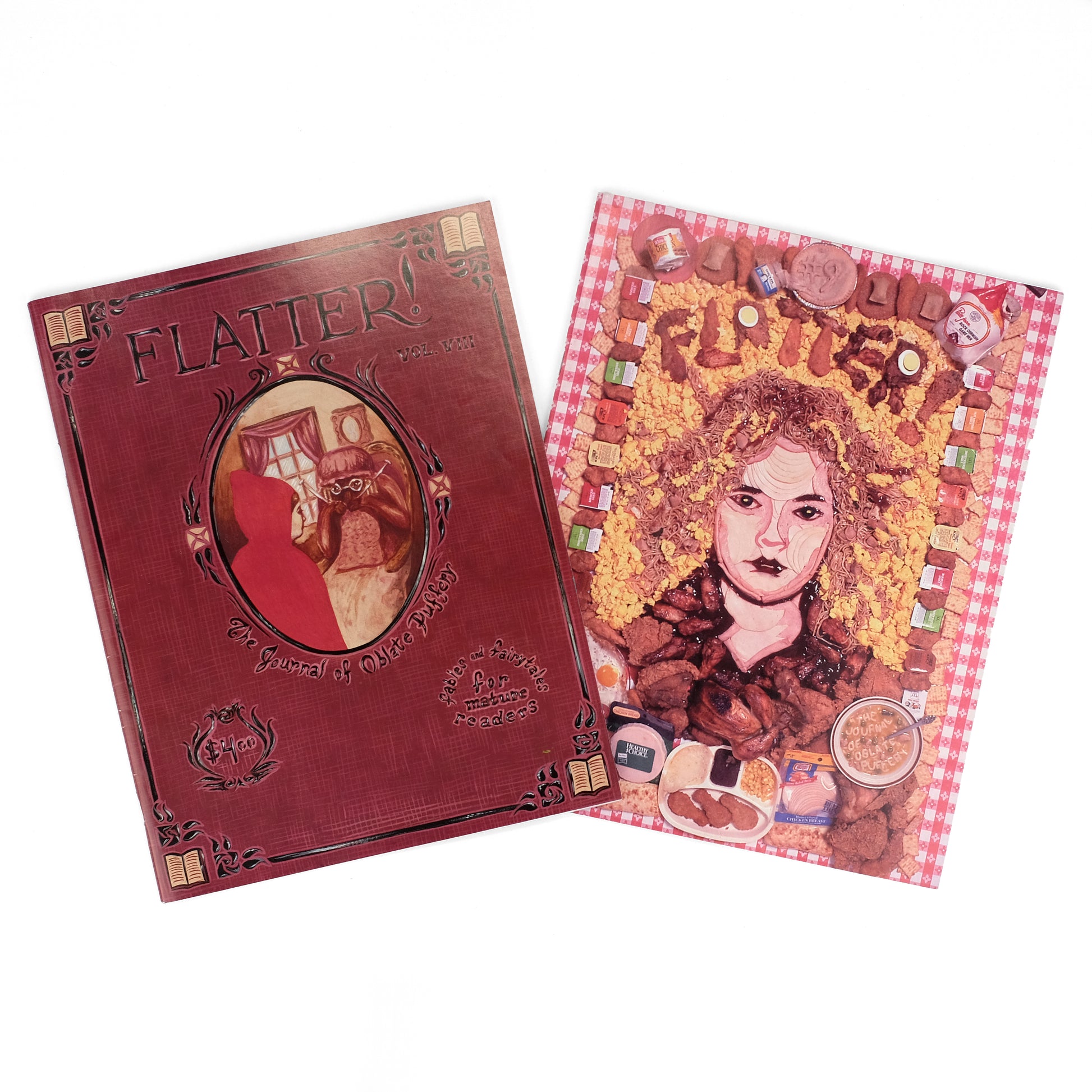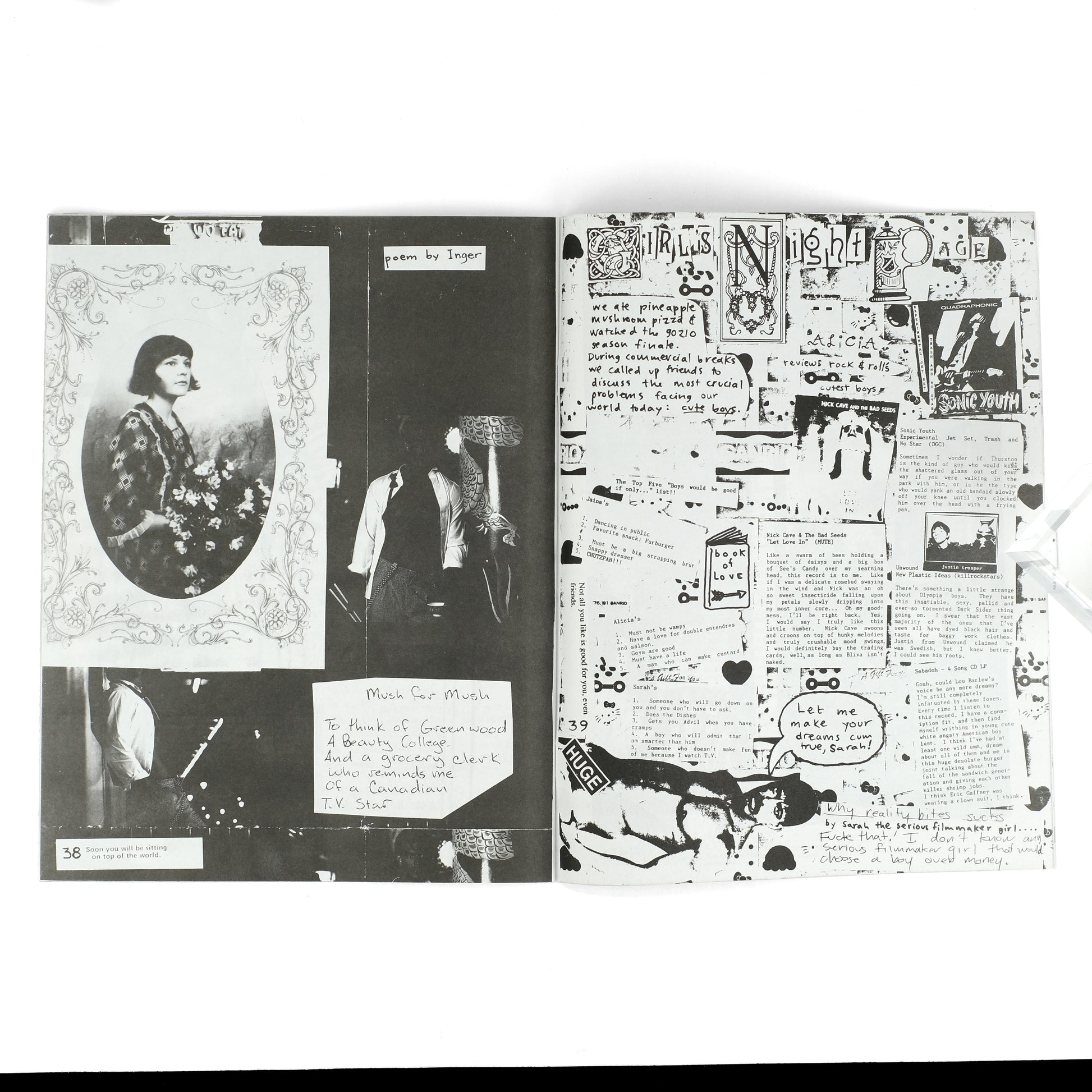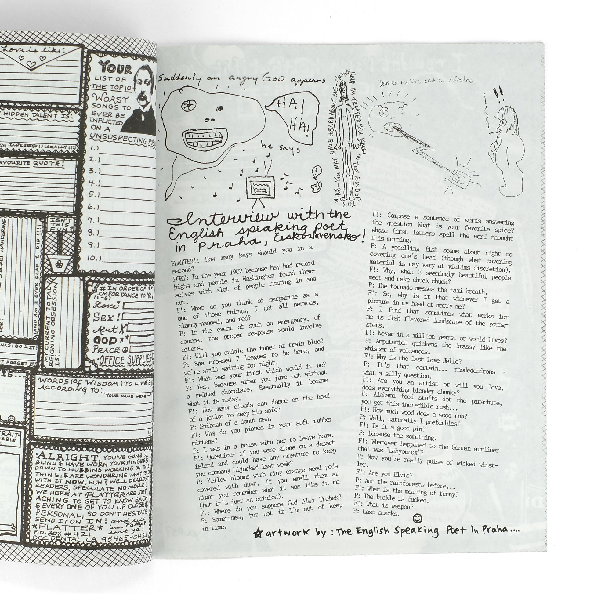Complete nine-issue run of this wide-ranging 1990s zine, which explored topics including pop culture, alternative music, and sexuality through a humorous and frequently feminist lens. Davis was encouraged to start the zine by Rollerderby's Lisa Carver, who appears in interviews in Nos. 1 and 3 (the latter being a discussion on the relative desirability of characters from Star Trek: The Next Generation). The majority of issues arranged around a loose theme (e.g. "Community Breast," "Cults That Matter!", "Cakes and Spankings," etc), with contributions from Davis and numerous others. Contents include articles, reader letters, fiction and poetry, zine and music reviews, etc; all heavily illustrated with photographs, drawings, and comics (including contributions from Dan Clowes and Adrian Tomine); four issues with color center spreads, else entirely black-and-white. OCLC locates 10 institutions holding copies of Flatter.