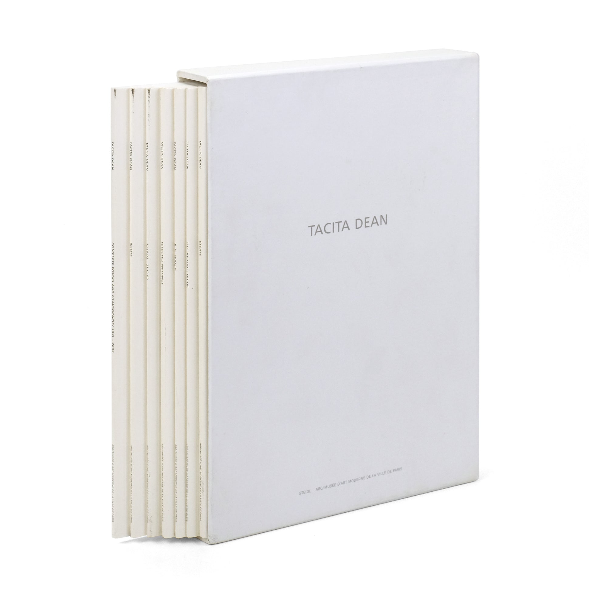 English-language edition of this set of seven illustrated booklets exploring various bodies of work by British artist Tacita Dean (b. 1965); published in conjunction with a 2003 exhibition of her work. Volumes titled: 13.10.02-21.12.02, Boots, Complete Works and Filmography 1991-2003, Selected Writings, The Russian Ending, W. G. Sebald, and Essays—the last containing texts by Laurence Bossé, Julia Garimorth, Rita Kersting, Jean-Luc Nancy, and Michael Newman.