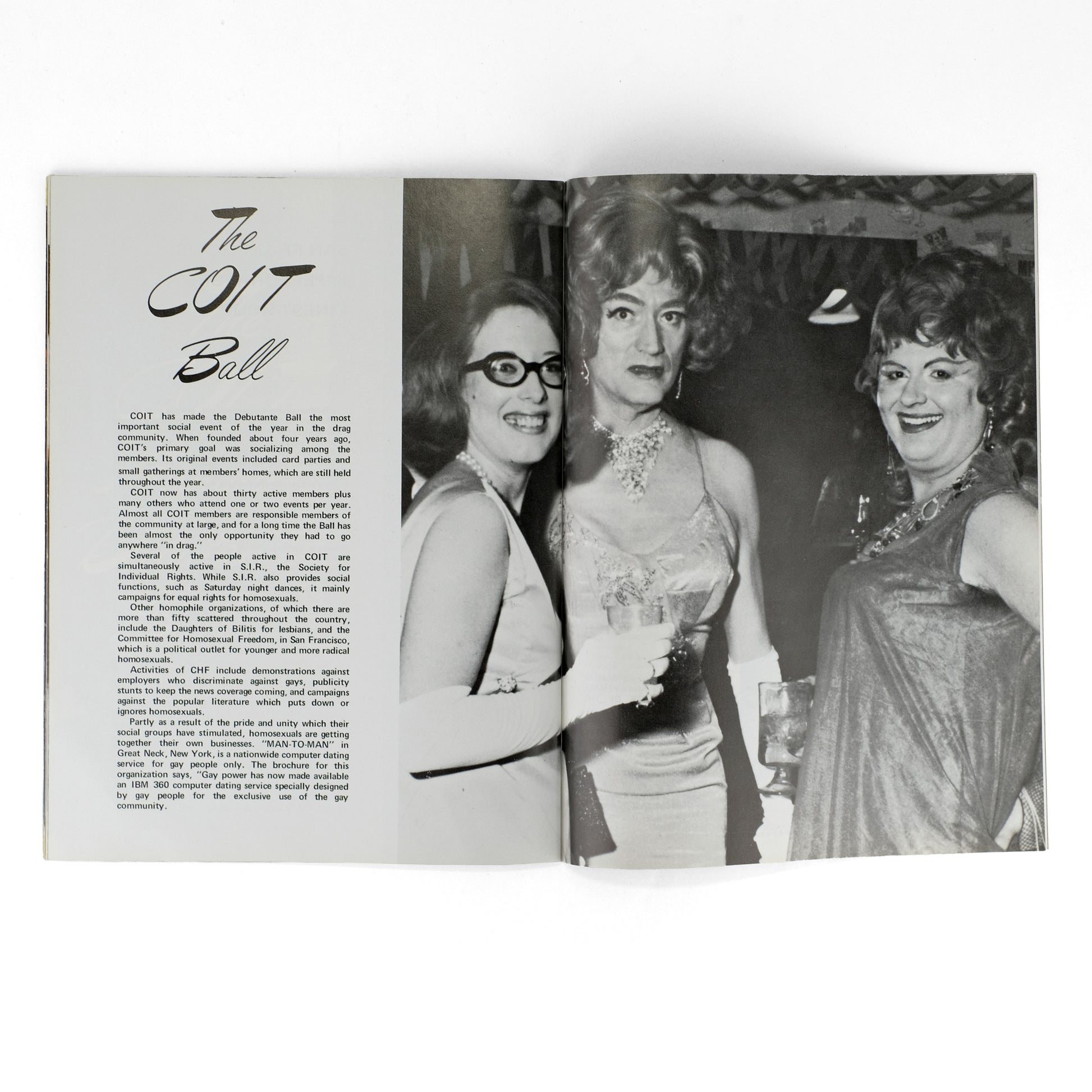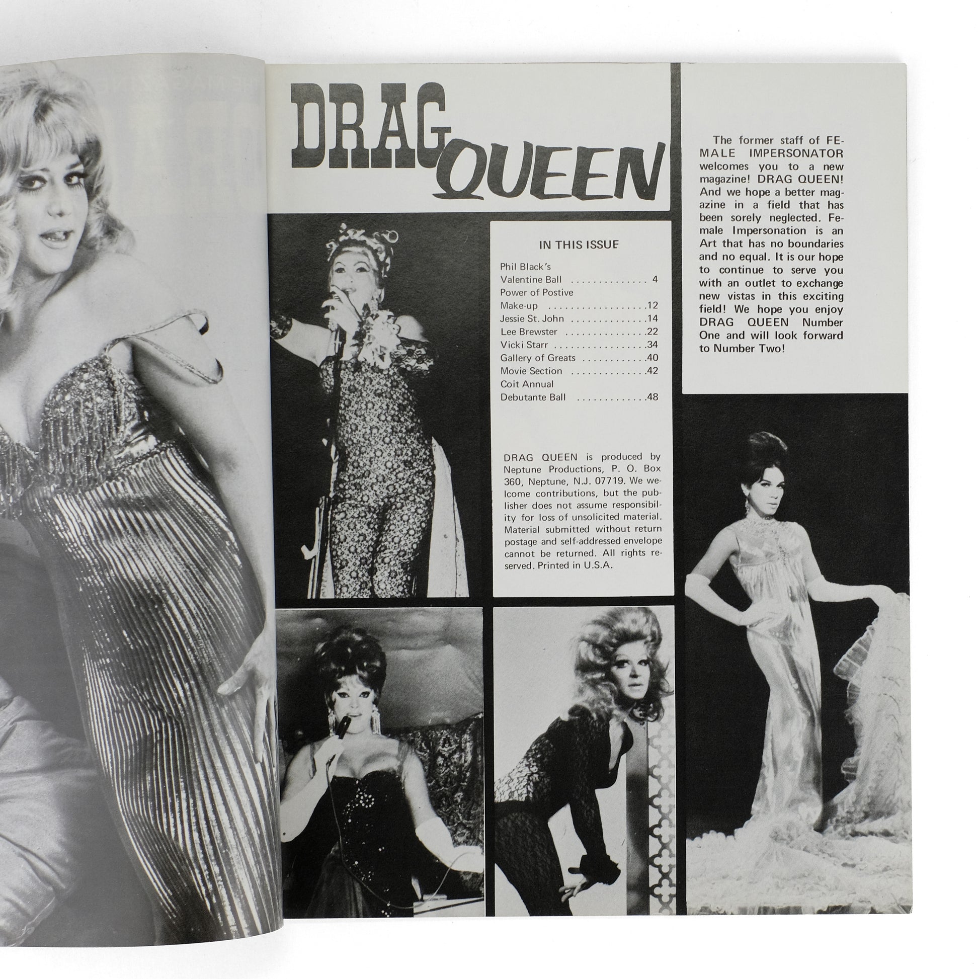 Nice copy of the first issue of this heavily illustrated photo-magazine of the drag community. With features documenting three different drag balls: Phil Black's Valentine Ball, Lee Brewster's Ball, and the COIT Annual Debutante Ball; profiles of drag performers Jessie St. John and Vicki Starr; an article, "The Power of Positive Make-Up by Robert Q. Mooney; a "Movie Section," with stills from various films, among them Christine Jorgenson Story; and reader letters (many with photos).
