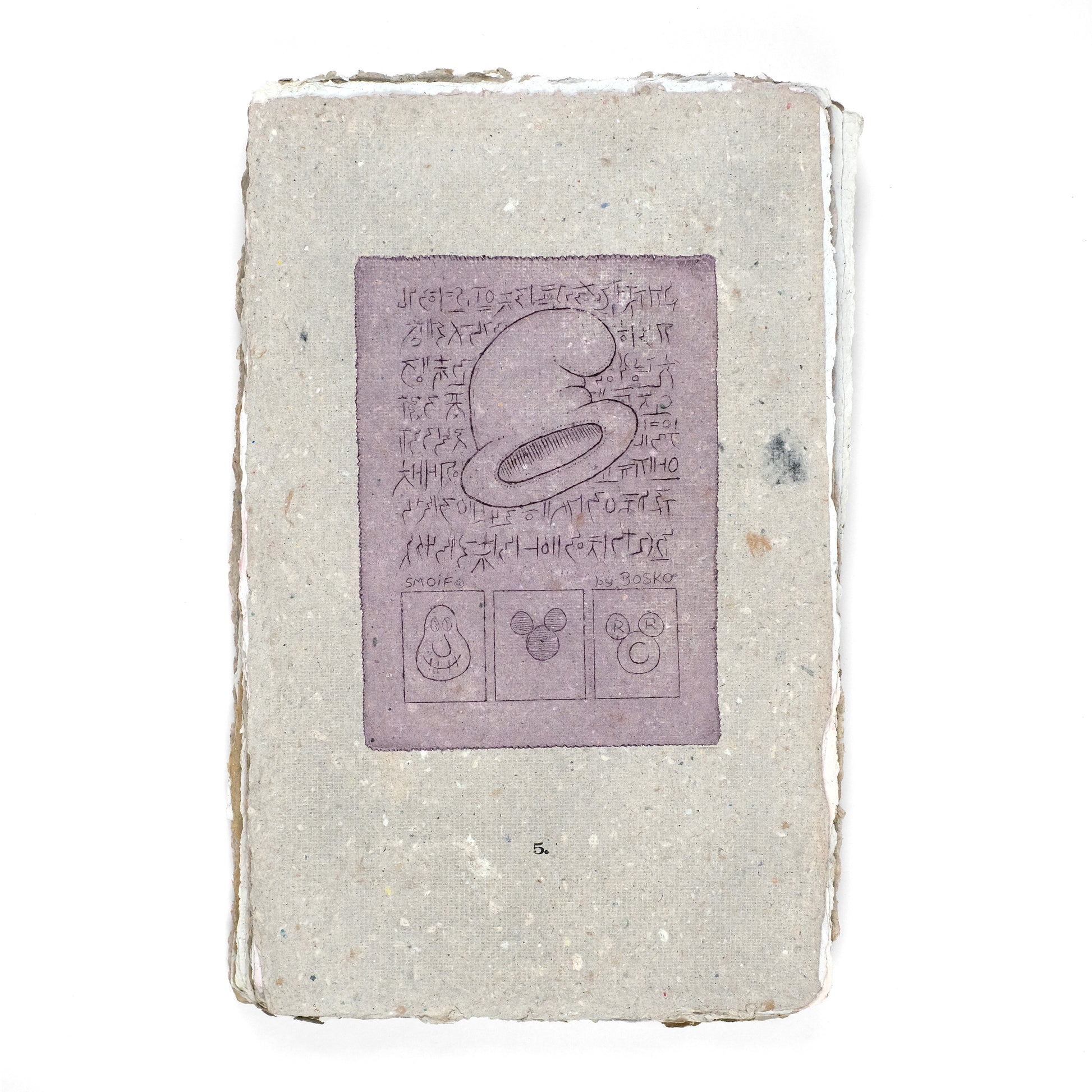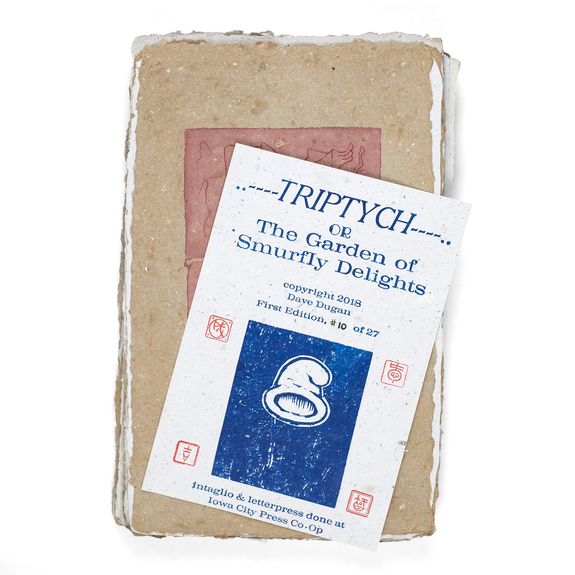 A tongue-in-cheek narrative artist's book concerning a painter, Dorothy, who is sued for depicting characters from The Smurfs in her work, retreats into a world of abstract pictorial language, and dies an unrecognized outsider visionary. Dugan, an Iowa-based cartoonist, printer, and papermaker long associated with the Iowa City Press Co-Op, where the present work was produced, is noted for his creative reuse of discarded materials—for instance, as here, using acrylic sheets as intaglio plates, and producing his own paper out of junk mail, bags, and other paper scraps. Though Dugan intended to house the full edition of Triptych in wooden boxes made from old fence slats, only a handful of copies received this treatment; the rest, including the present copy, being housed unceremoniously in reused rice bags. A delightful, pun-laced mashup of pop culture and art history, full of its own striking imagery; unrepresented in OCLC.