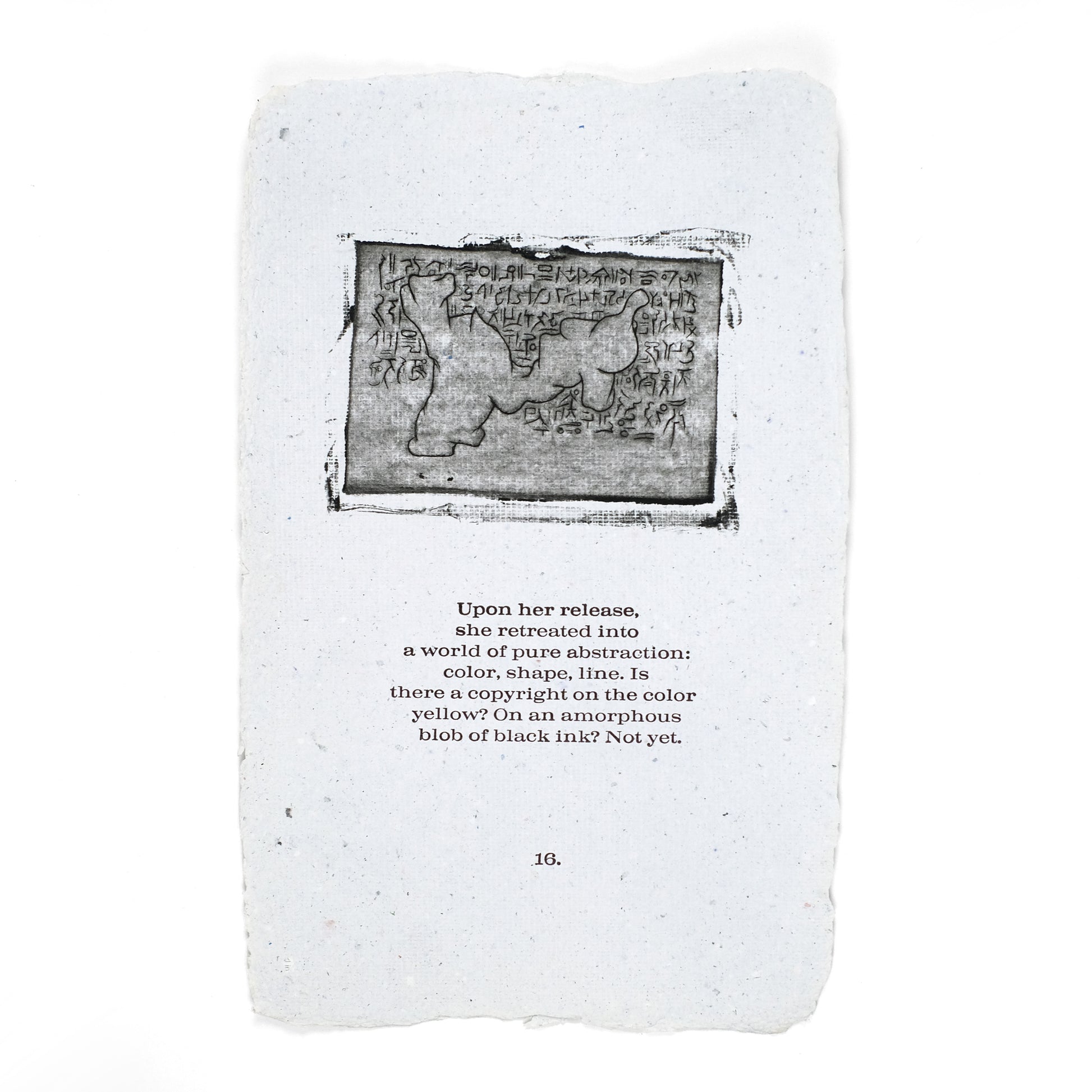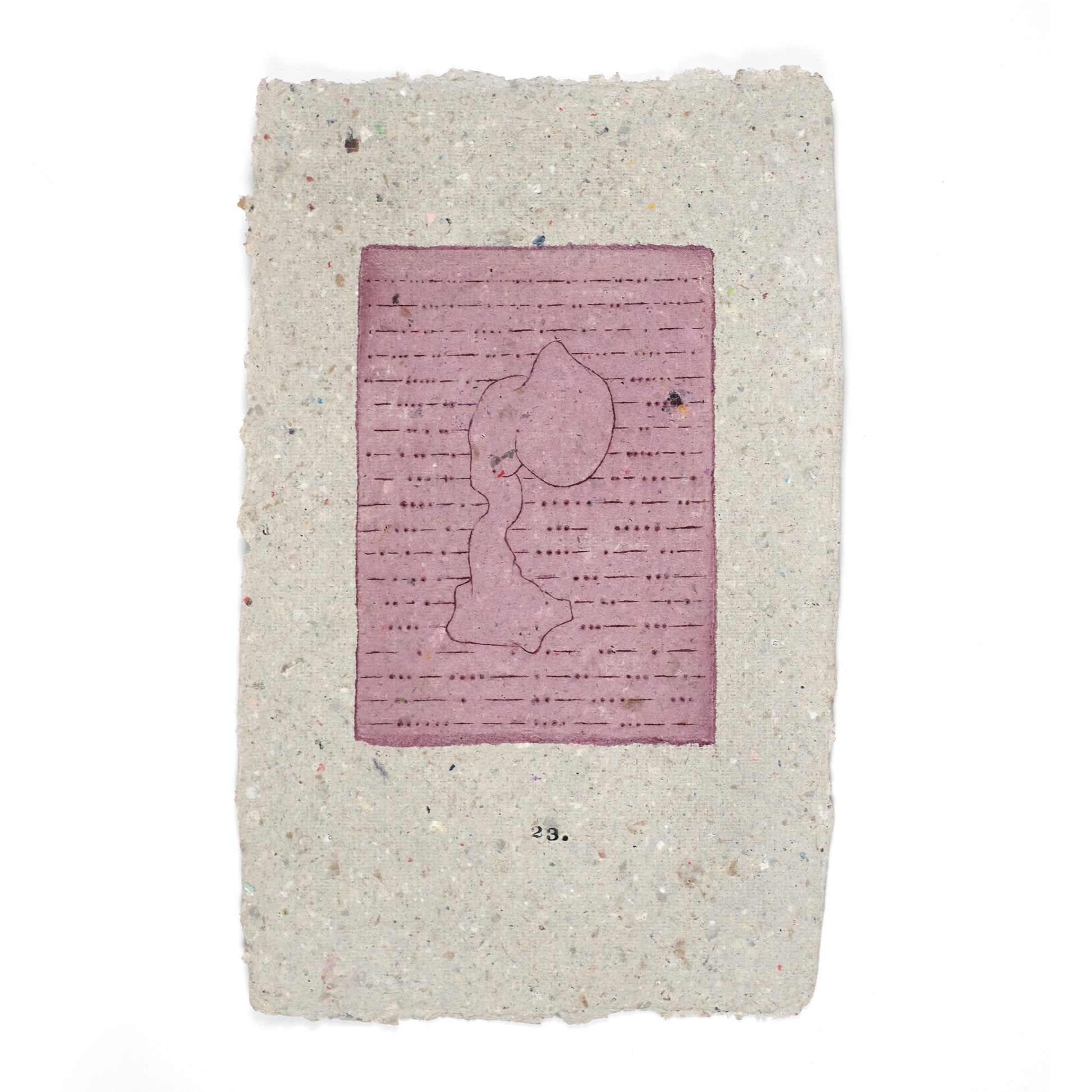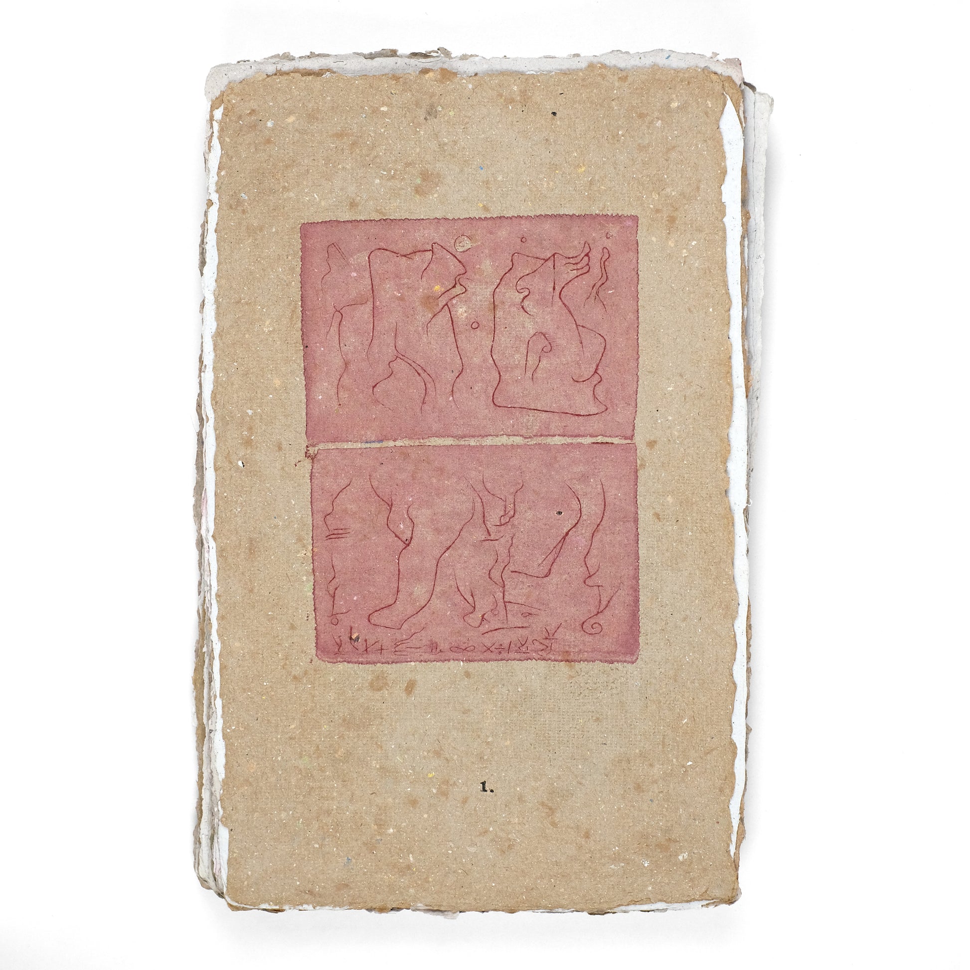Iowa City: Dave Dugan, 2018. First edition, no. 10 of 27 copies. 36 numbered handmade sheets, ~15-1/2 x 9-1/2 in, intaglio and letterpress printed to rectos only; with 11 x 7-3/8 title card. Some warping to the leaves (owing presumably to variations in thickness of the pulp during forming), else fine. Wrapped in large sheet of hand-made wastepaper secured with blue painter's tape, and housed in a Golden Phoenix-brand Thai Jasmine Rice bag.
