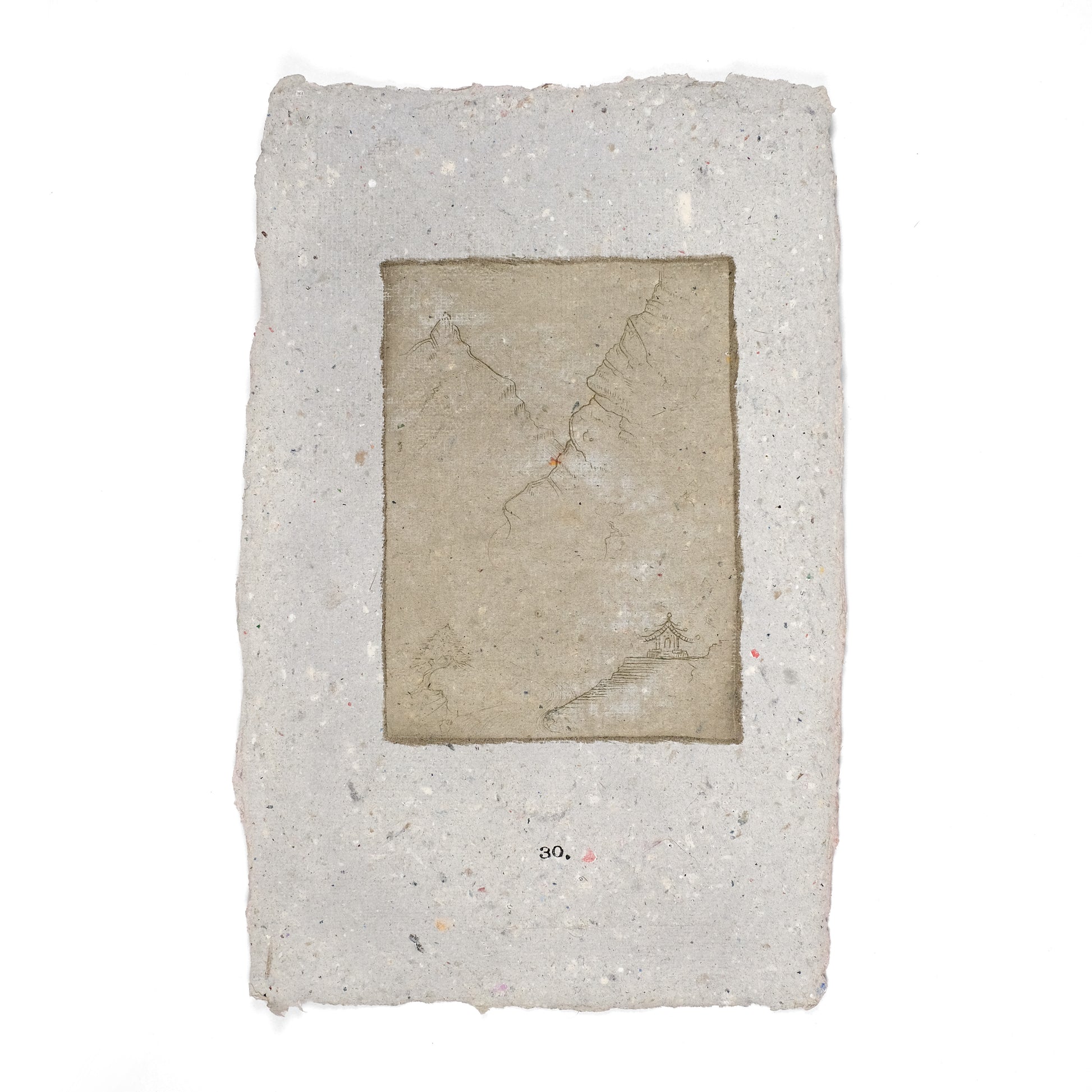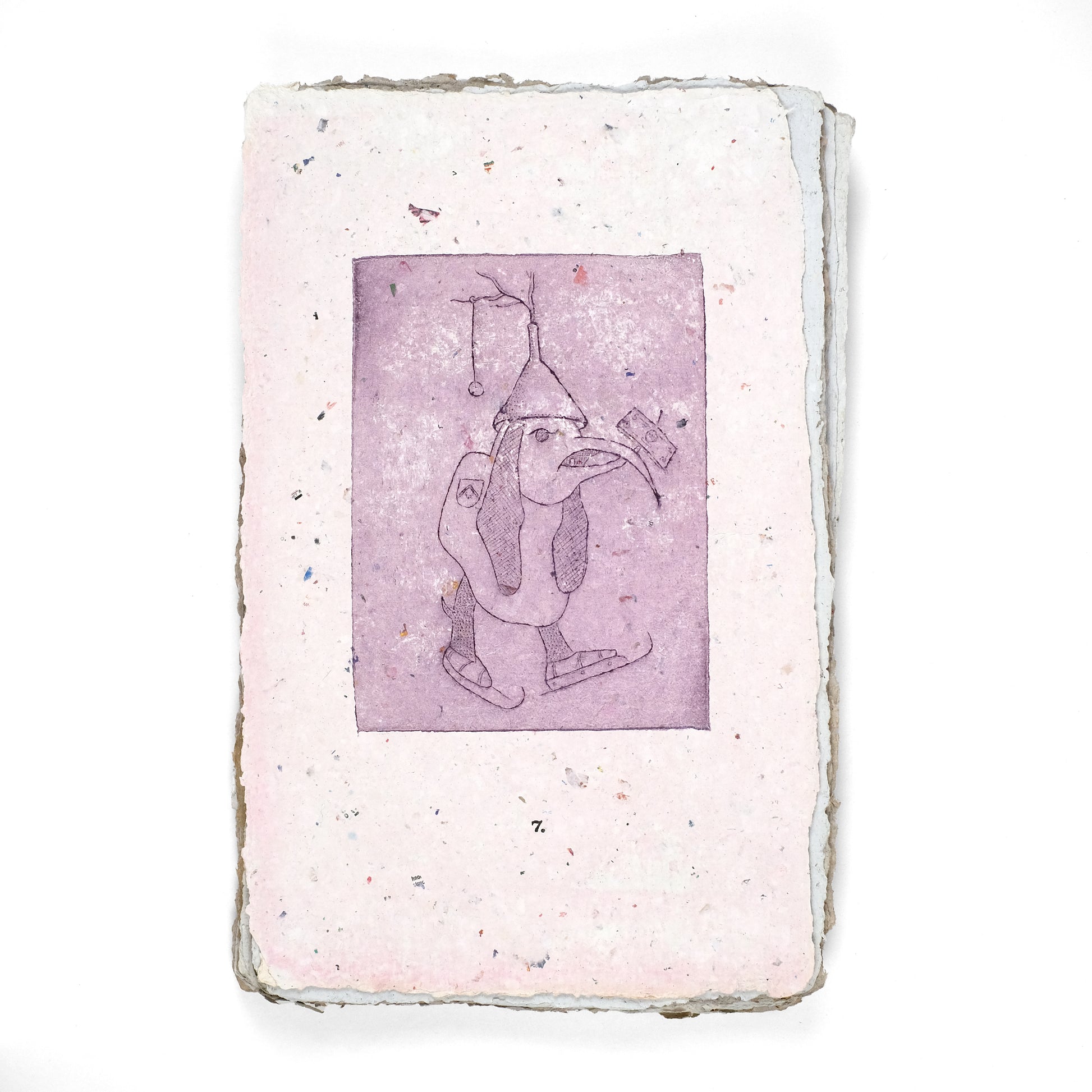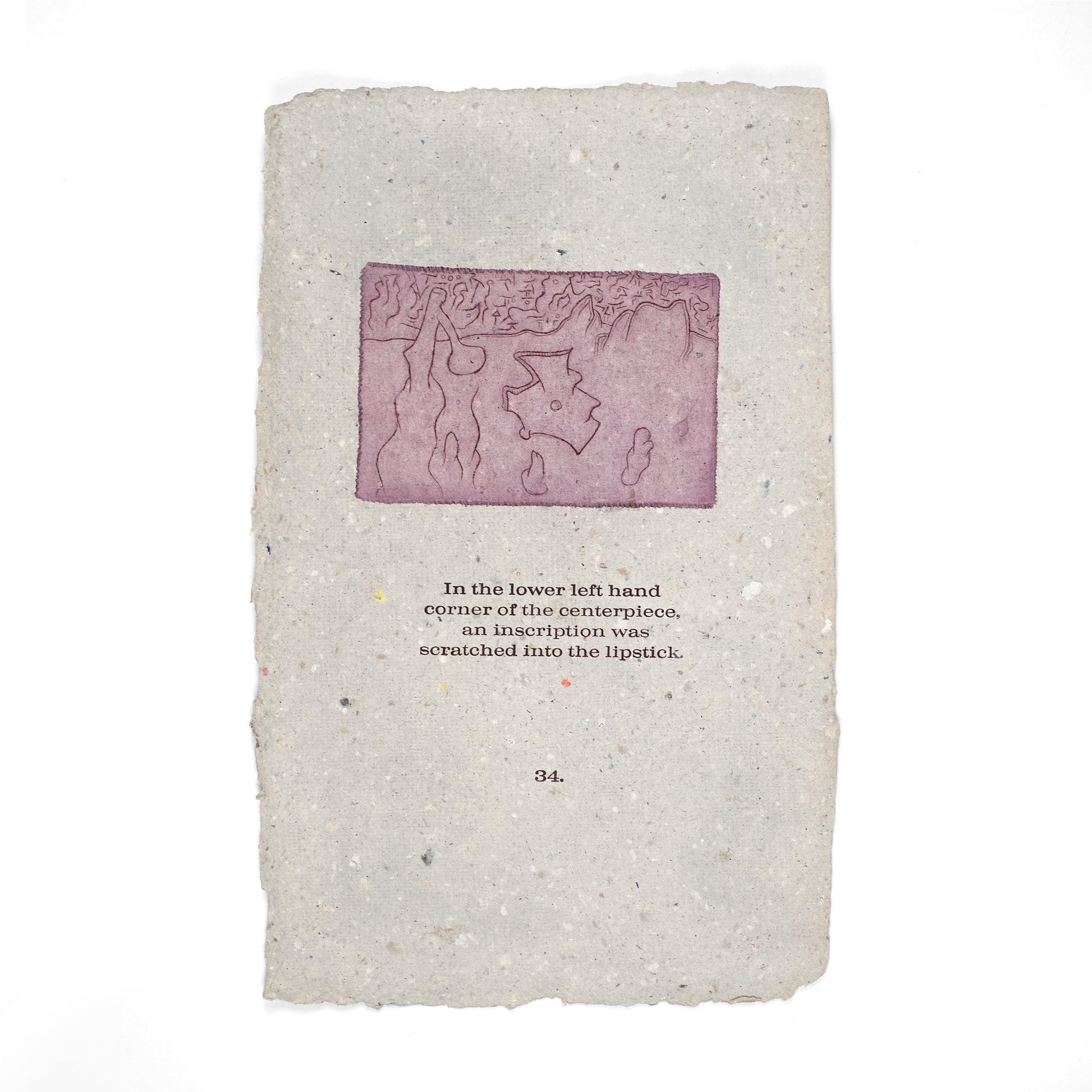 Iowa City: Dave Dugan, 2018. First edition, no. 10 of 27 copies. 36 numbered handmade sheets, ~15-1/2 x 9-1/2 in, intaglio and letterpress printed to rectos only; with 11 x 7-3/8 title card. Some warping to the leaves (owing presumably to variations in thickness of the pulp during forming), else fine. Wrapped in large sheet of hand-made wastepaper secured with blue painter's tape, and housed in a Golden Phoenix-brand Thai Jasmine Rice bag.