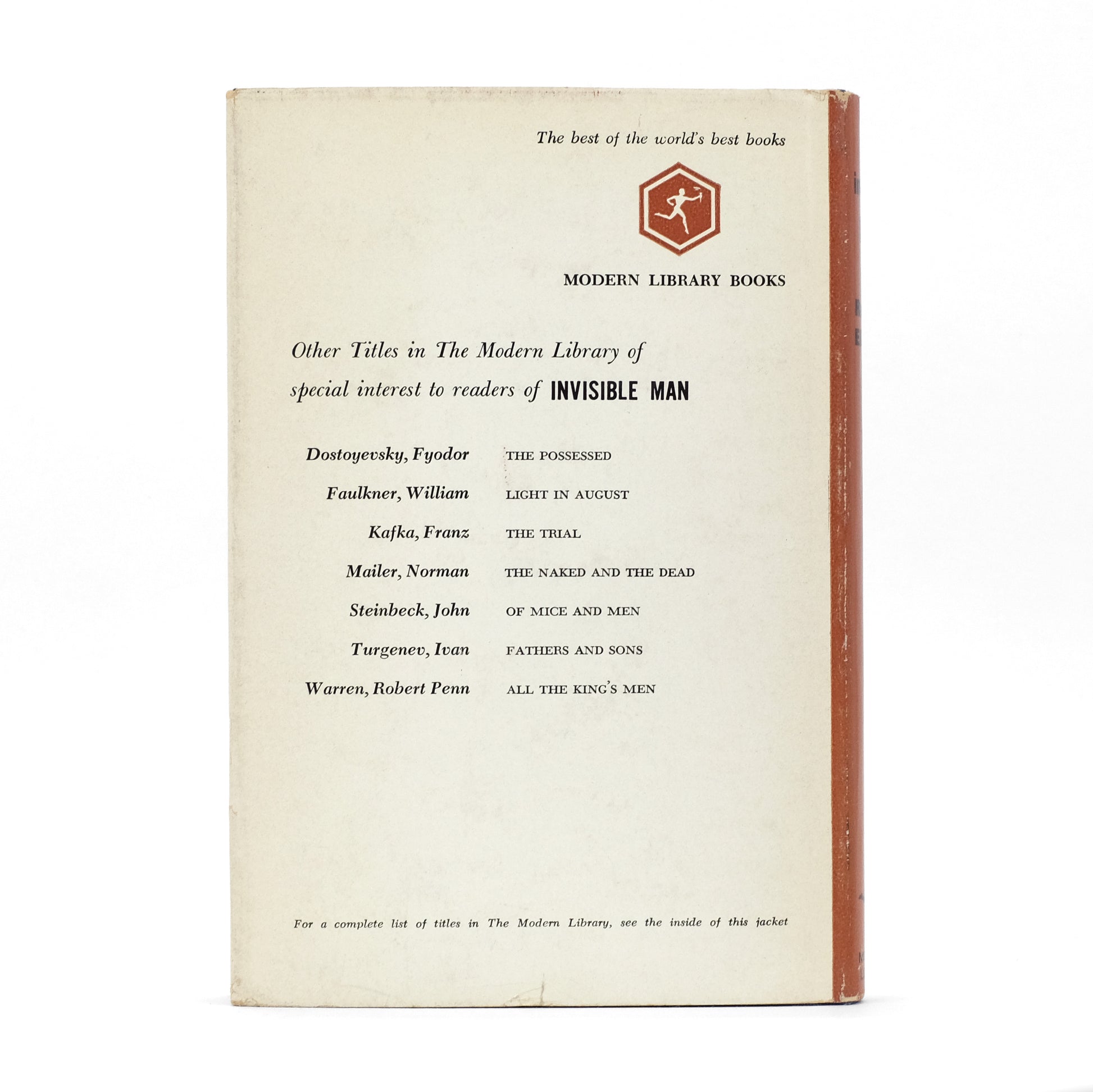 First Modern Library printing of Ralph Ellison's landmark 1952 novel, a poignant exploration of the Black experience in mid-century America. This copy with the following points marking it as the first ML printing of 1963: Style 11 binding, in blue cloth, with Rockwell Kent-designed endpapers; list of titles to jacket verso includes Ellison's Invisible Man but not Bernard Malamud's Two Novels, thus dating it to fall 1963. Nice copy. Toledano 338.1*