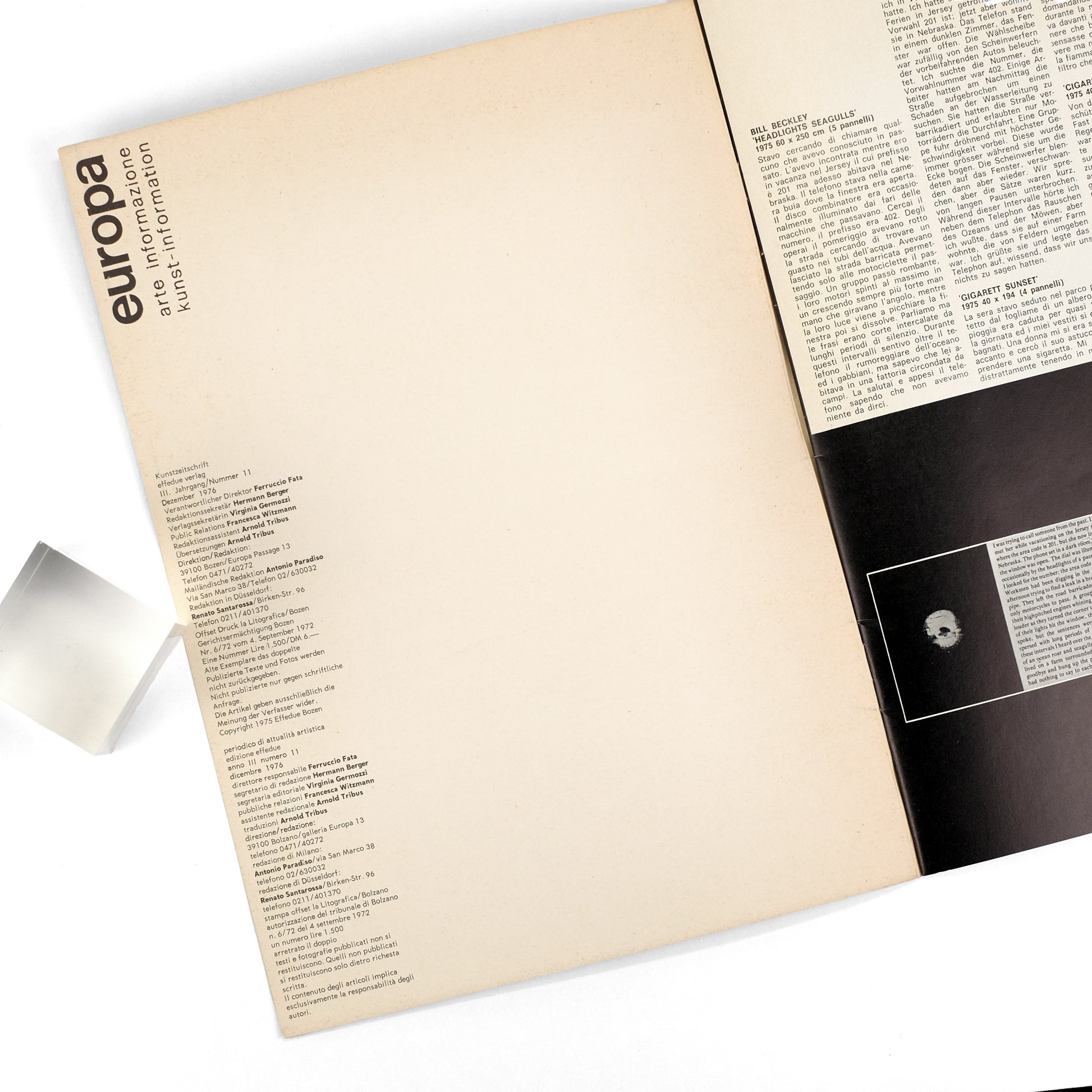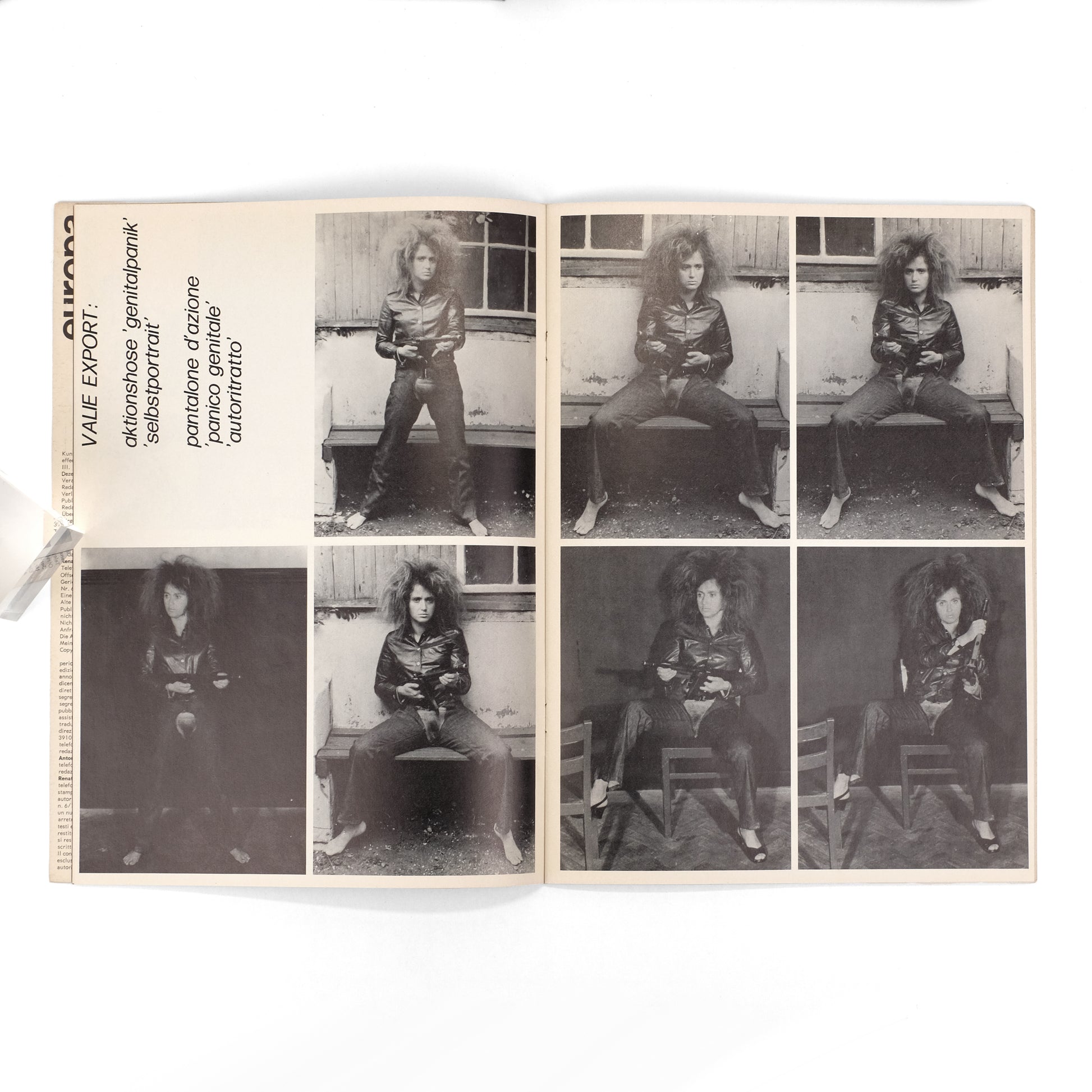Single issue of this Italian/German avant arts periodical. Notable for a cover and seven interior images documenting Austrian artist Valie Export's notorious feminist performance piece "Action Pants: Genital Panic," in which she wears a pair of crotchless pants and wields a machine gun. Also seven images from Export's "Homo Meter" performance, in which she walked into the ocean with loaves of bread tied around her ankles. Additionally covers works by artists Bill Beckley, Silva Guberti, Franco Guerzoni, Armando Marocco, Albert Mayr, Annette Messager, Davide Mosconi, Fried Rosenstock, and Gianni-Emilio Simonetti. All text in Italian and German.