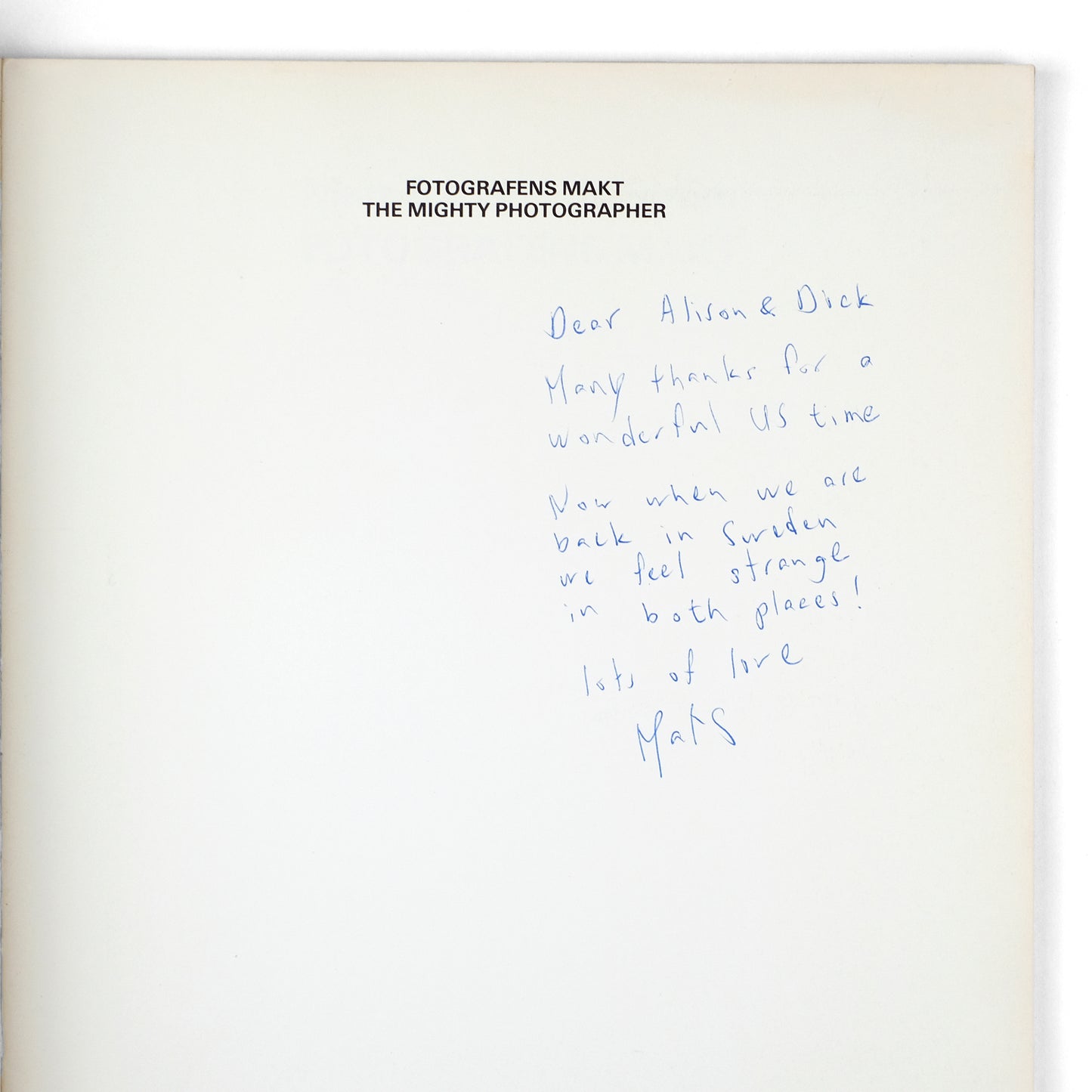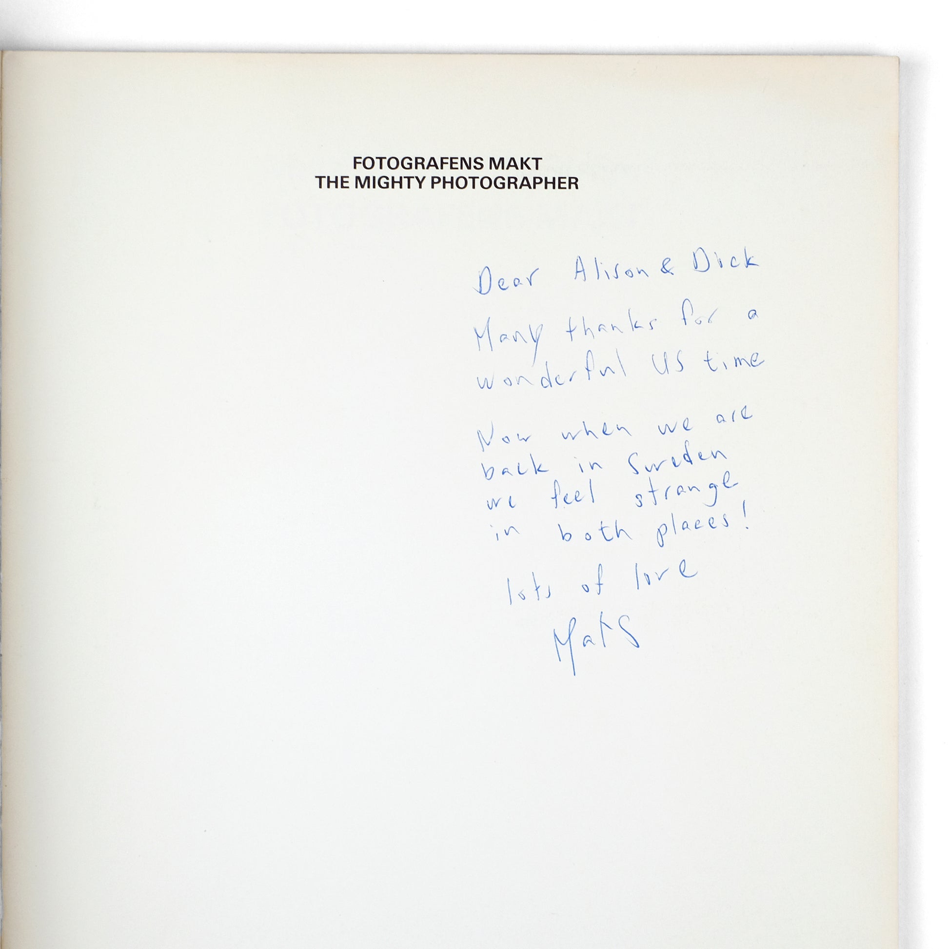 Presentation copy of this collection of photographs by Finnish sculptor-turned-photographer Carl-Erik Ström (b. 1938), whose conceptual work hinges, often humorously, on the interplay between images and their titles/texts. With an essay at rear by Lewis Carroll ("Photography Extraordinary"), and an introduction unpacking Ström's philosophical dimensions by Swedish artist and arts critic Mats B. (Mats Birger Rindeskär, 1951-2009), who has inscribed the volume to Fluxus artist and Something Else Press publisher Dick Higgins and his wife, artist Alison Knowles. All text in Swedish and English.