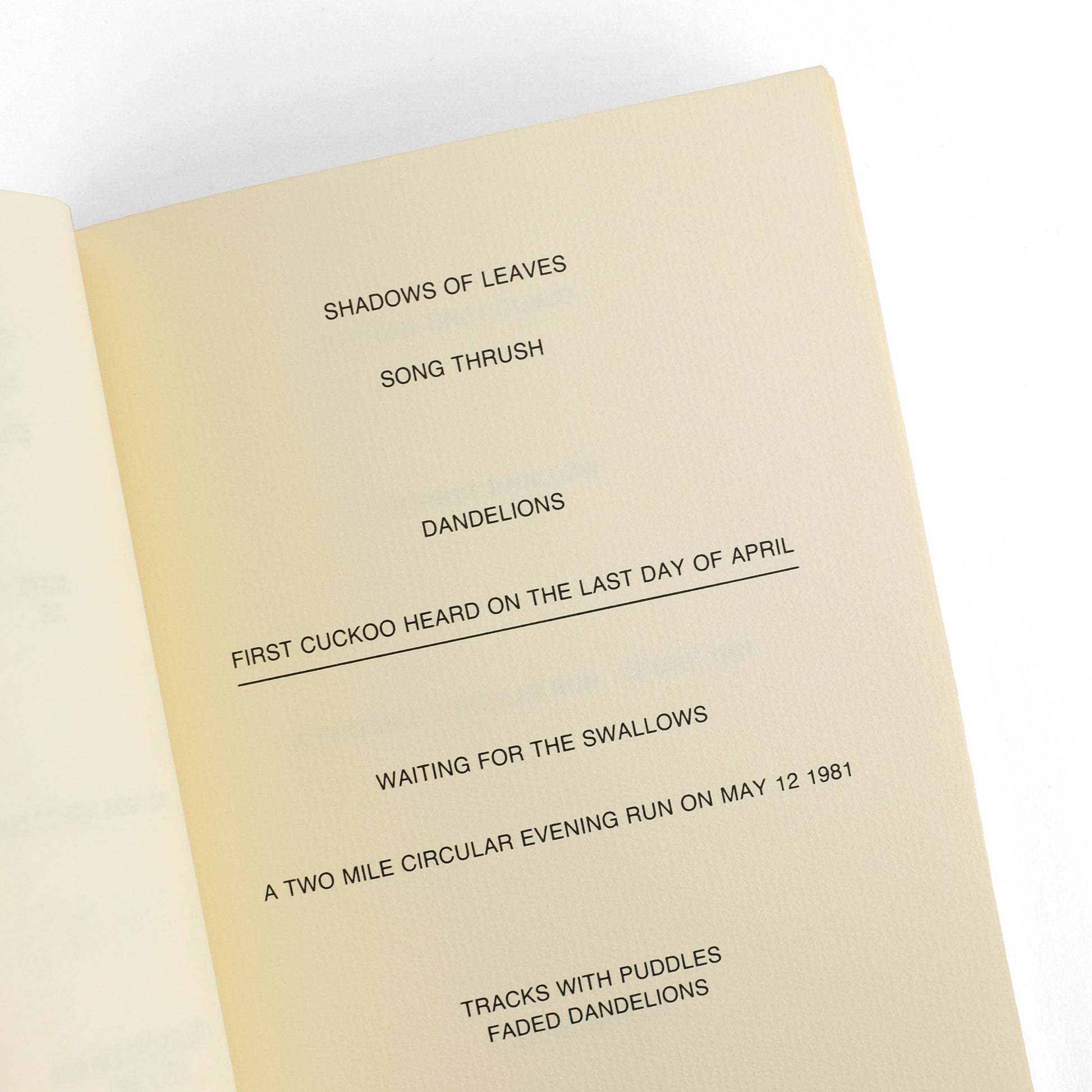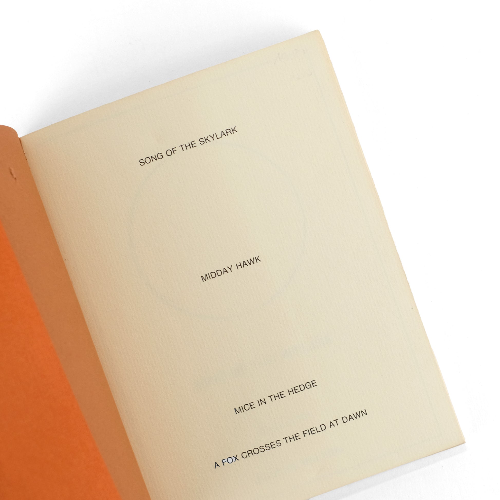 [London]: Coracle Press, 1982. [39] leaves, printed rectos only. Small 8vo. Textured orange French wraps. Small dent at base of front cover, else fine. Text-based artist's book documenting, through fragmented visual language, a series of countryside sojourns taken in England between 1979 and 1982 by English walking artist Hamish Fulton (b. 1946). With dates and locations noted in each entry. Has become somewhat uncommon in the trade.