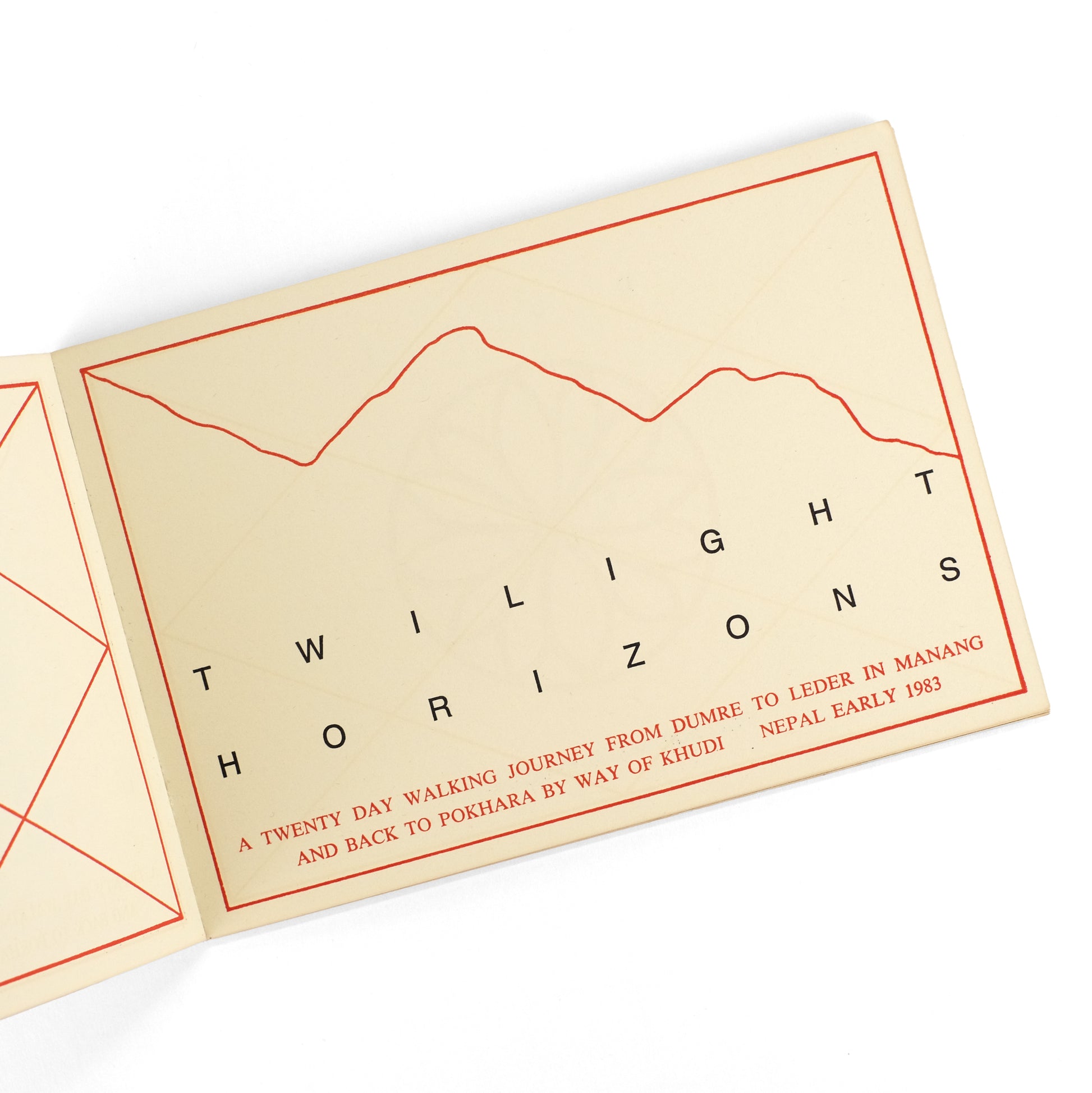 Artist's book by English walking artist Hamish Fulton (b. 1946) documenting a twenty-day walking trip in Nepal, “from Dumre to Leder in Manag and back to Pokhara by way of Khudi.” Pairs minimal drawings and text, printed throughout in red, black, and gray; a lovely production.