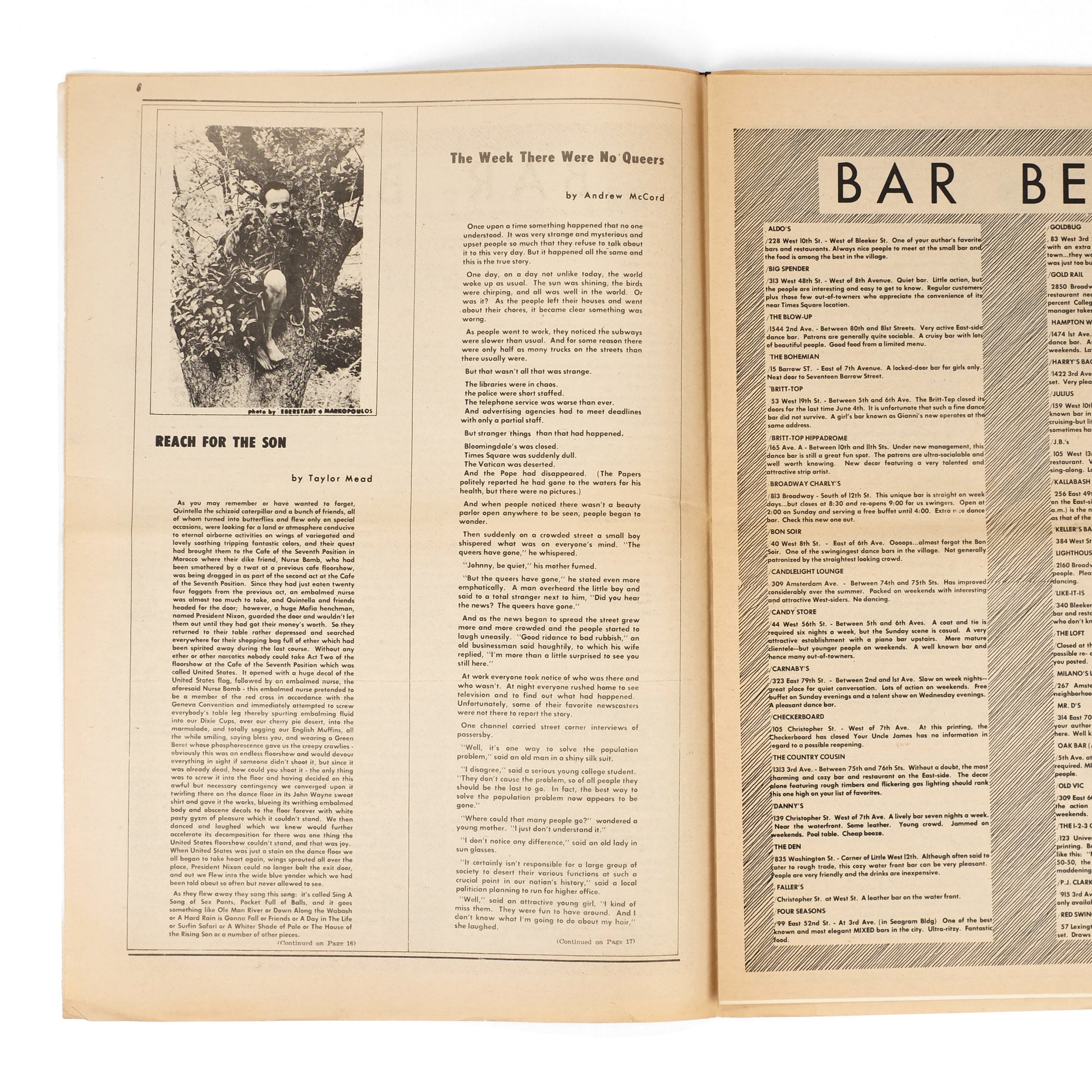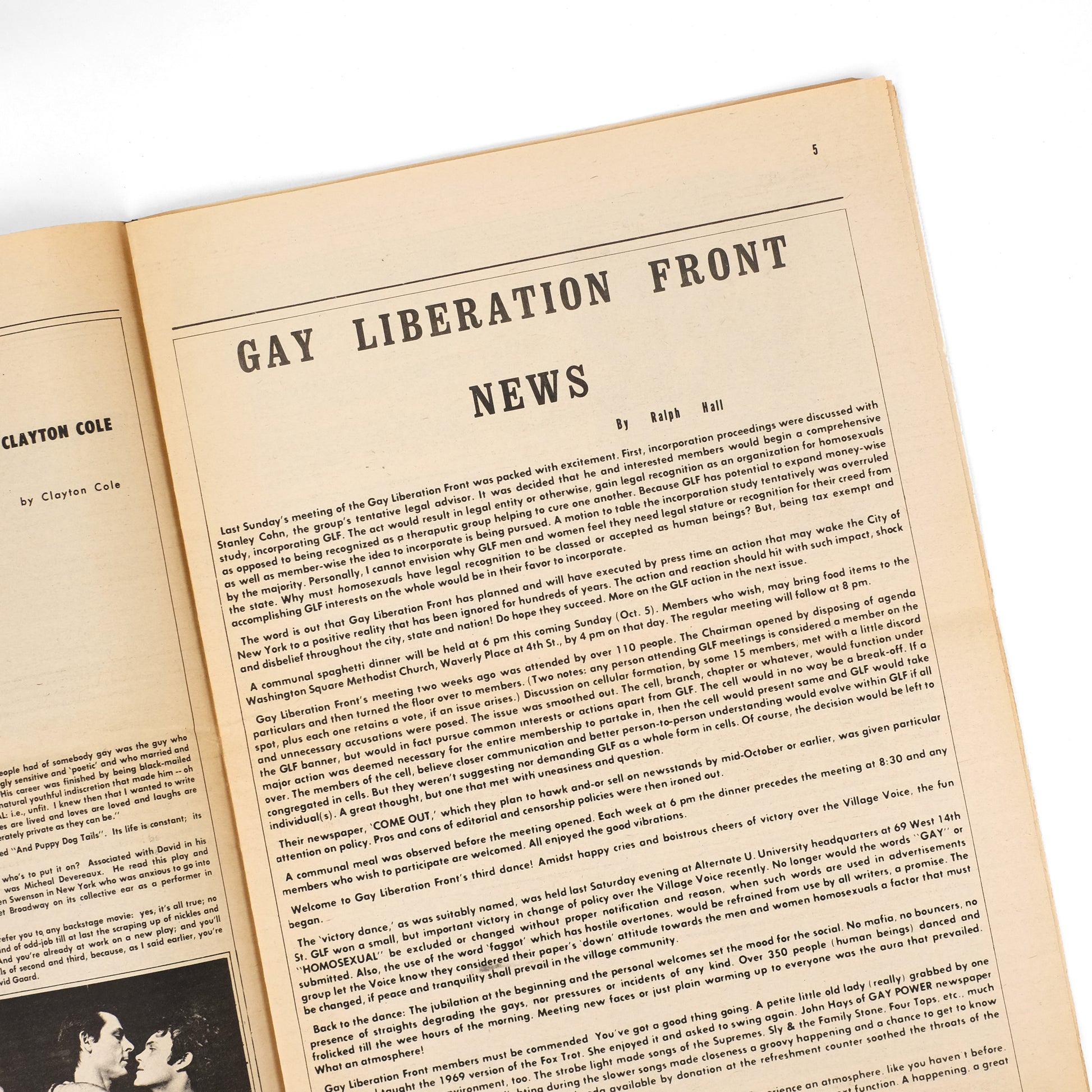 Single issue of this seminal gay periodical, first published in the immediate aftermath of the Stonewall uprising, and billing itself as "New York's First Homosexual Newspaper." Contents include "David Gaard talking with Clayton Cole"; "Gay Liberation Front News" by Ralph Hall; a column by writer and Warhol-associate Taylor Mead; "The Week There Were No Queers," by Andrew McCord; "Bar Beat," a list of New York gay bars; Student Homophile League news; a drawing by Claes Oldenburg; poems by Sappho; an astrology column by Walter Breen; "The Gay Films of Yesterday" by Marion Z. Bradley, etc. Illustrated throughout in black-and-white, with several nudes, including centerfold. Edited by now Berlin-based filmmaker and actor John Heys (b. 1954), a close friend and frequent subject of photographer Peter Hujar. Publisher Joel Fabricant also notable as publisher of the East Village Other and Kiss.
