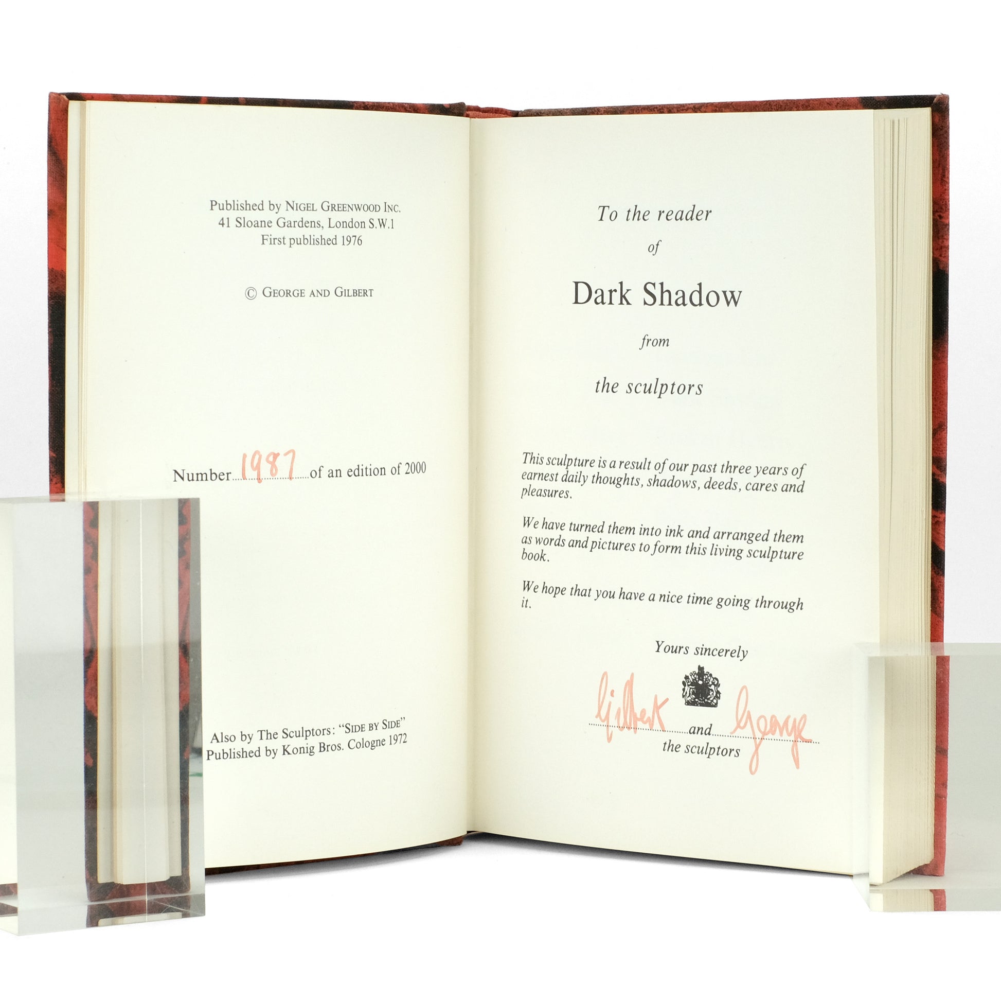 First edition of Gilbert & George's epochal photographic artist's book, described on the dedication page as a "living sculpture book" encompassing the "past three years of earnest daily thoughts, shadows, deeds, cares and pleasures." Eight chapters pairing 128 titled black-and-white images (rectos) with accompanying prose anecdotes and observations (versos), each presented as a uniform block of justified-margin text. Witty, conceptual, bibulous, and ekphrastic; an enduring classic, a 50th anniversary edition of which was published (somewhat anachronously) in 2024. Parr & Badger, The Photobook v2, p. 153.