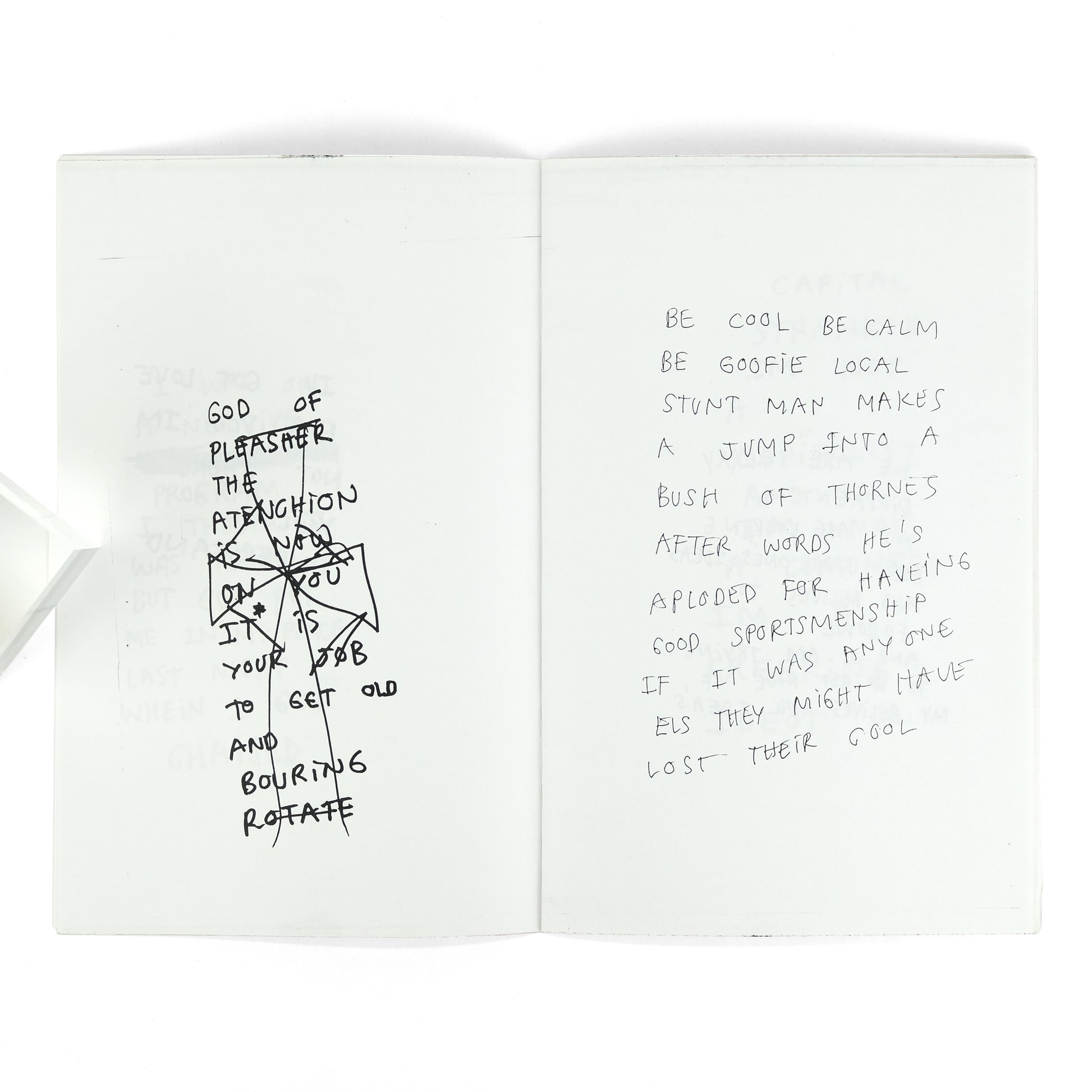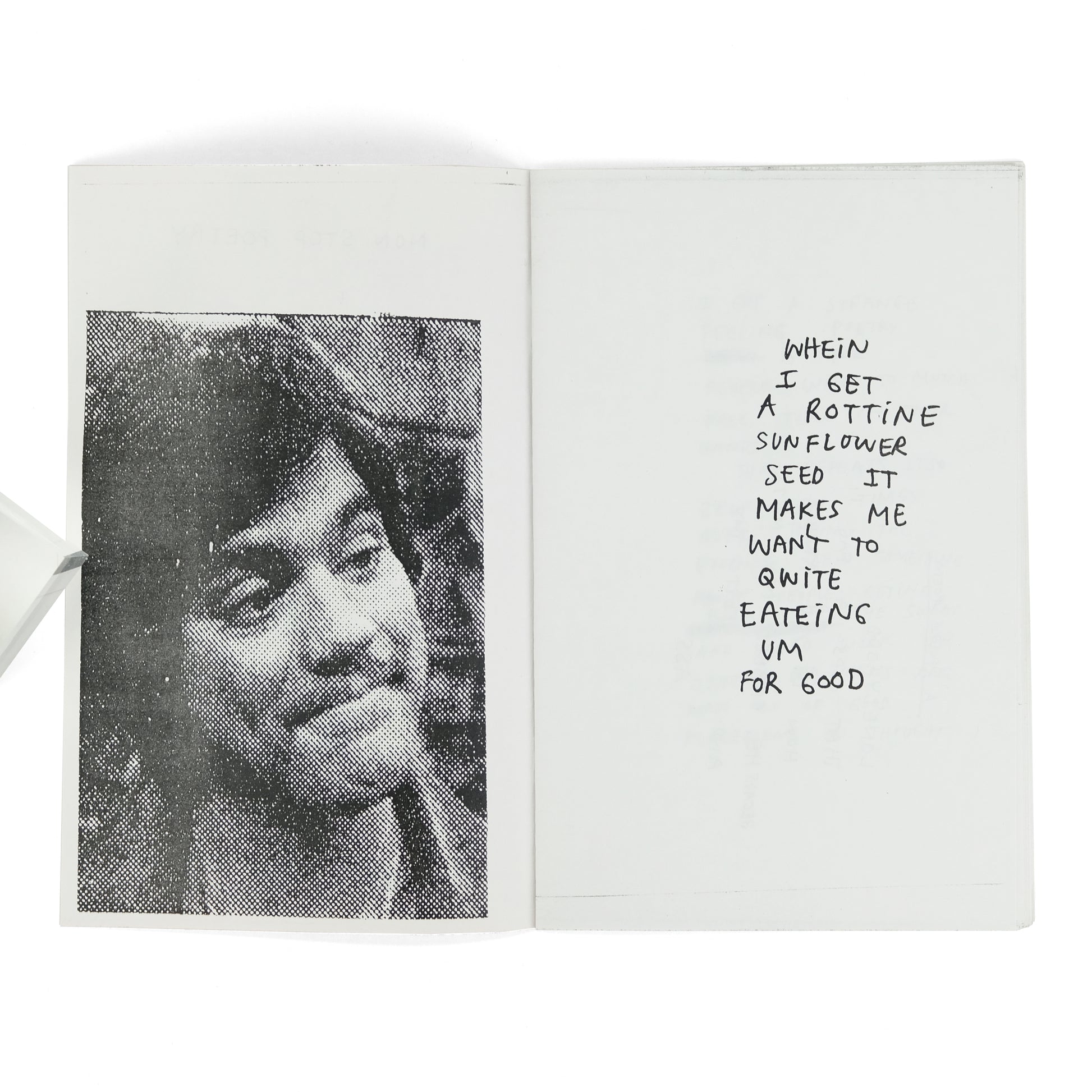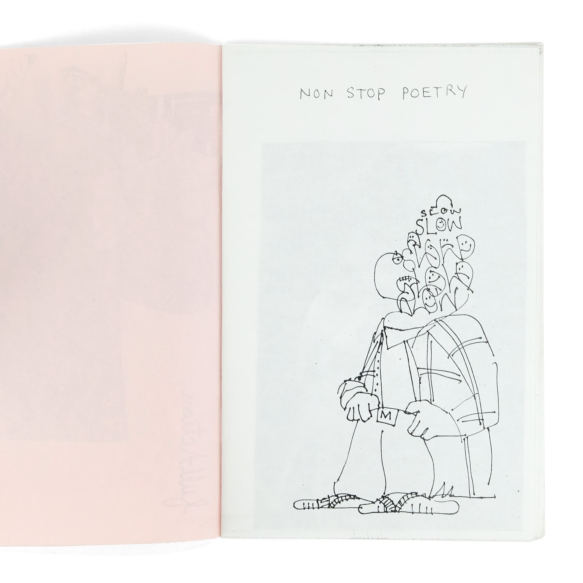 Single issue of skateboarding legend Mark Gonzales's celebrated zine series Non Stop Poetry. Contents a mix of reproduced holograph poems, along with black-and-white illustrations and photo-collages. Often made in collaboration with friends and fellow artists, issues of Non Stop Poetry were produced in small numbers beginning in the 1990s; issues were later anthologized in Non Stop Poetry: The Zines of Mark Gonzales (Printed Matter, 2014).