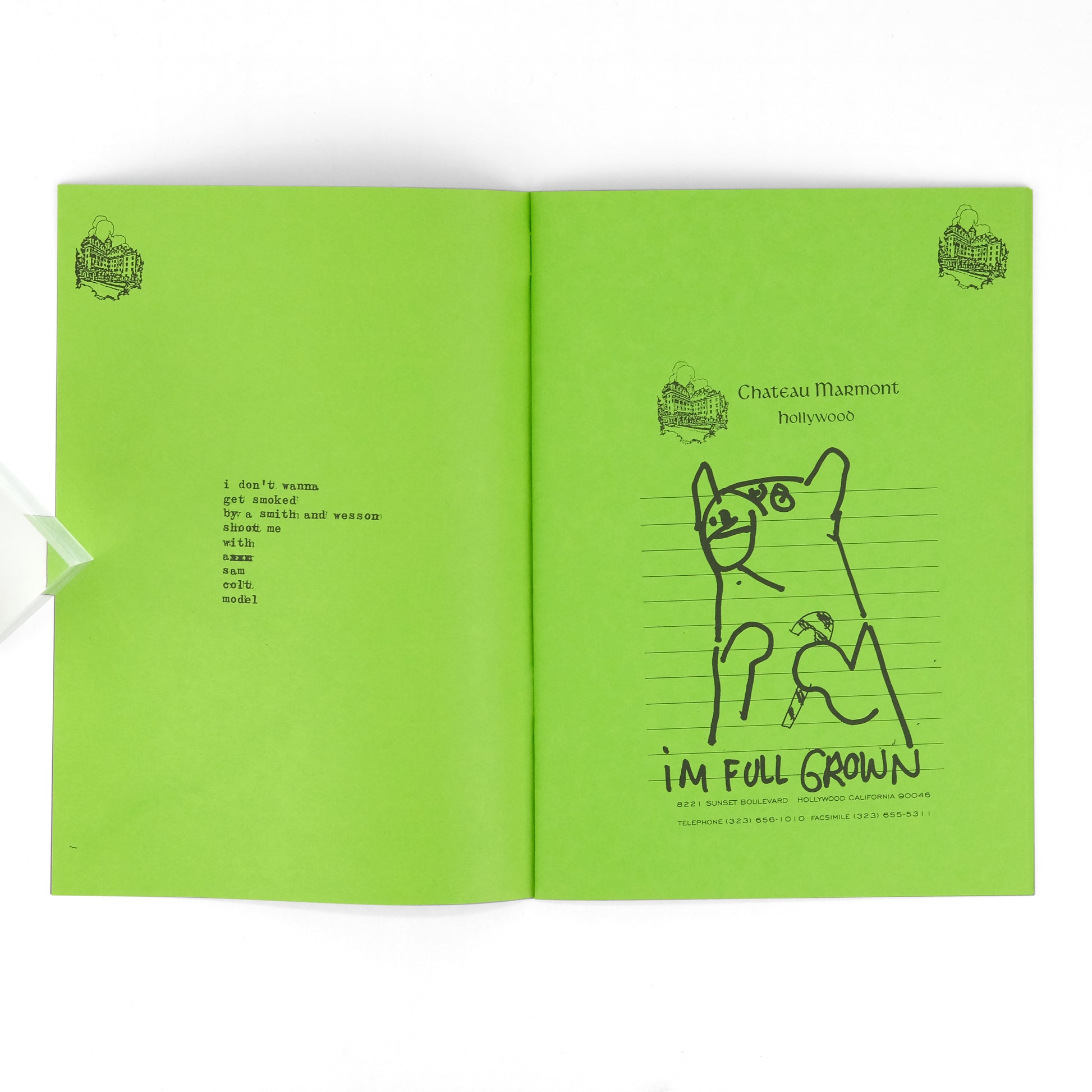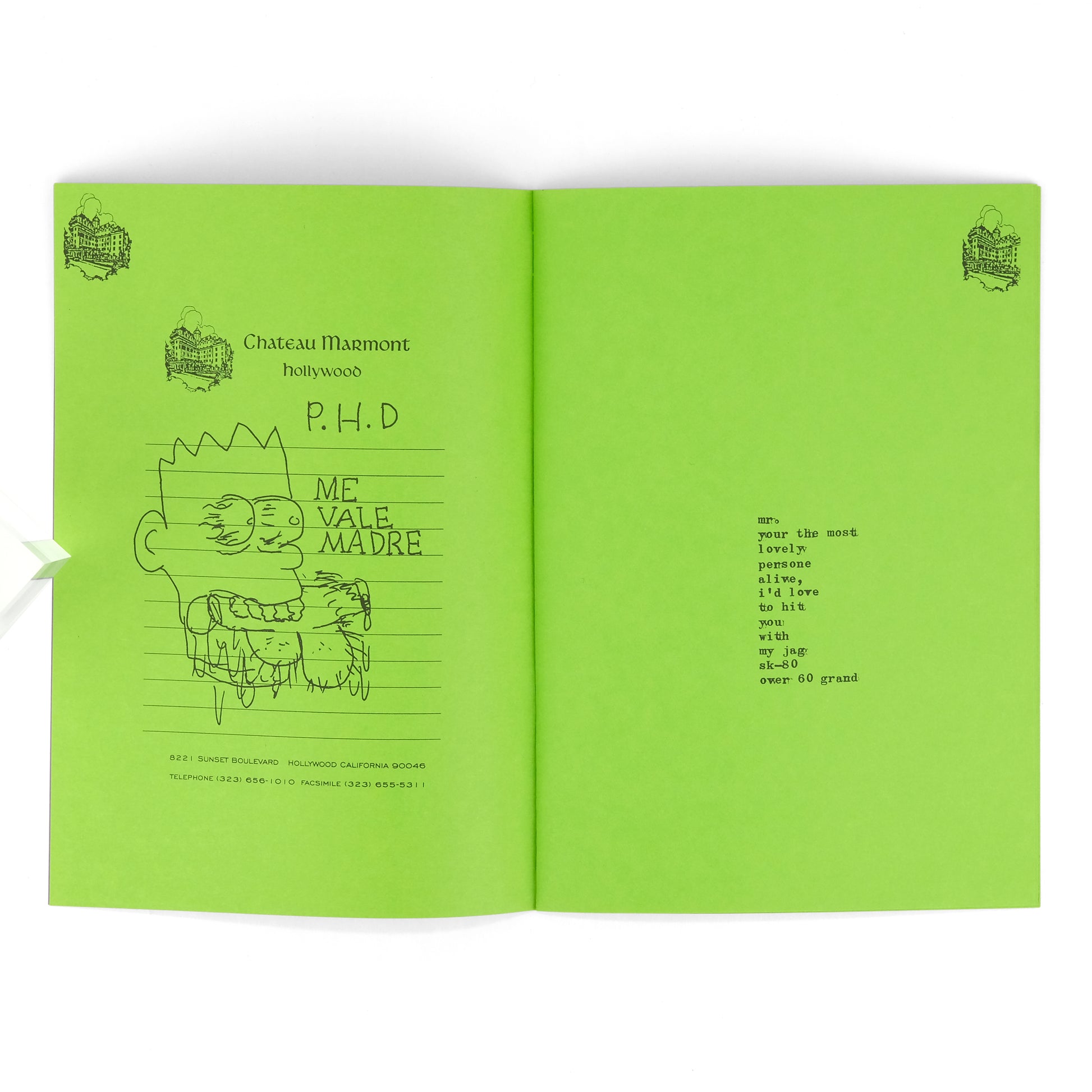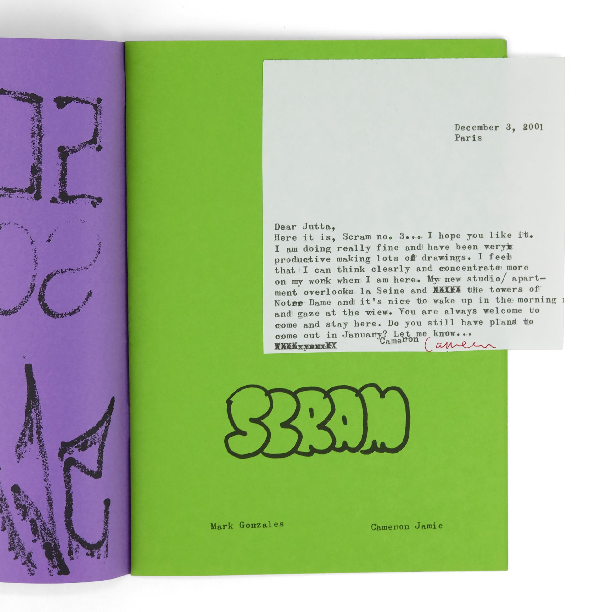 One of several collaborative zines by professional skateboarder and artist Mark Gonzales (b. 1968) and American visual artist Cameron Jamie (b. 1969); a typically insouciant combination of art and poetry, each of the pages having been originally composed on hotel stationary. With centerfold and rear cover art by Jeffrey Vallance. This copy with quarter-size TLS from Jamie, dated December 3, 2001, in which he presents the zine to artist Jutta Koether and updates her about his life and work in Paris. A nice association copy of an expectedly scarce work.