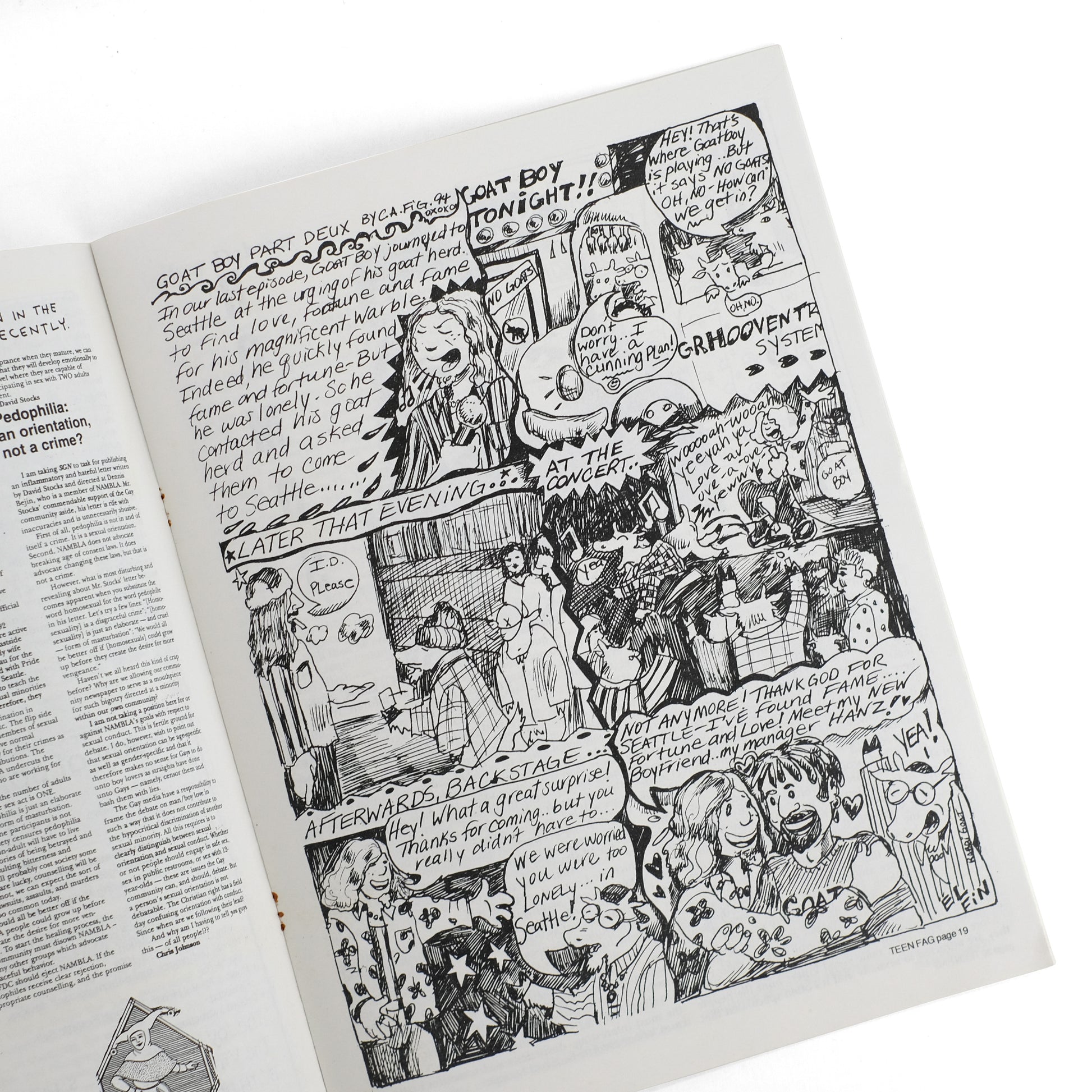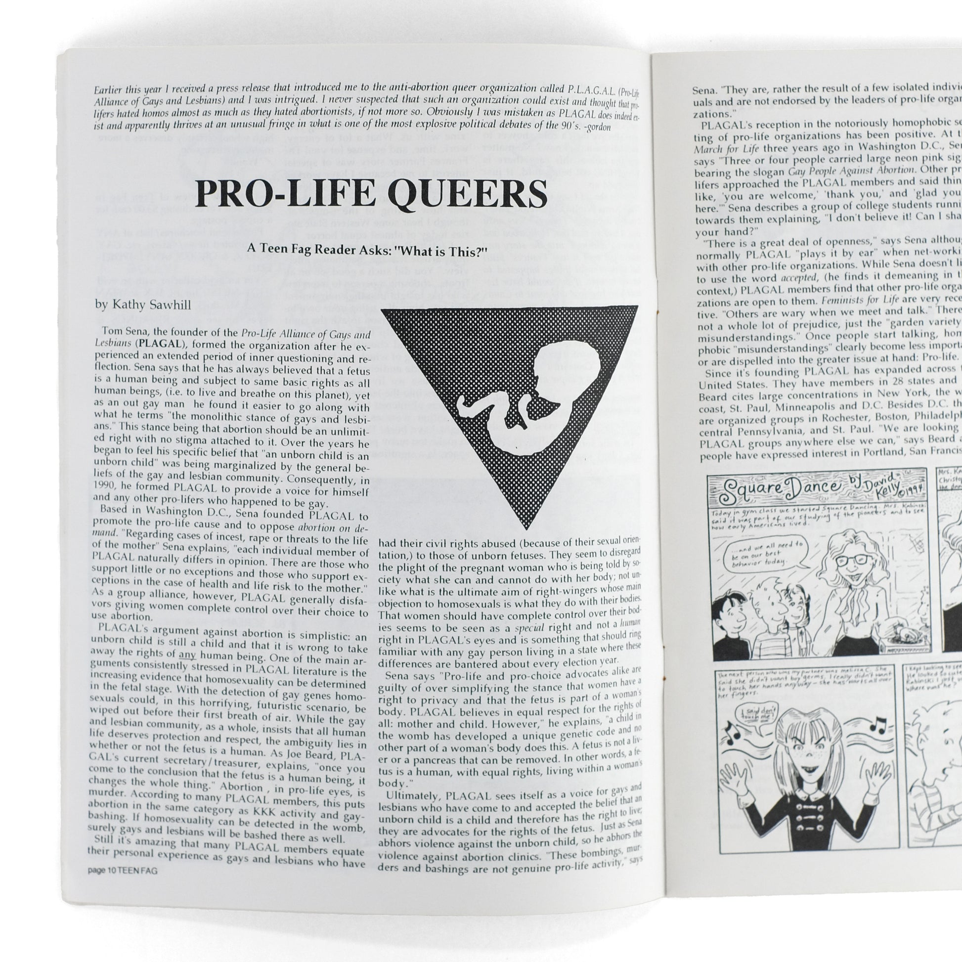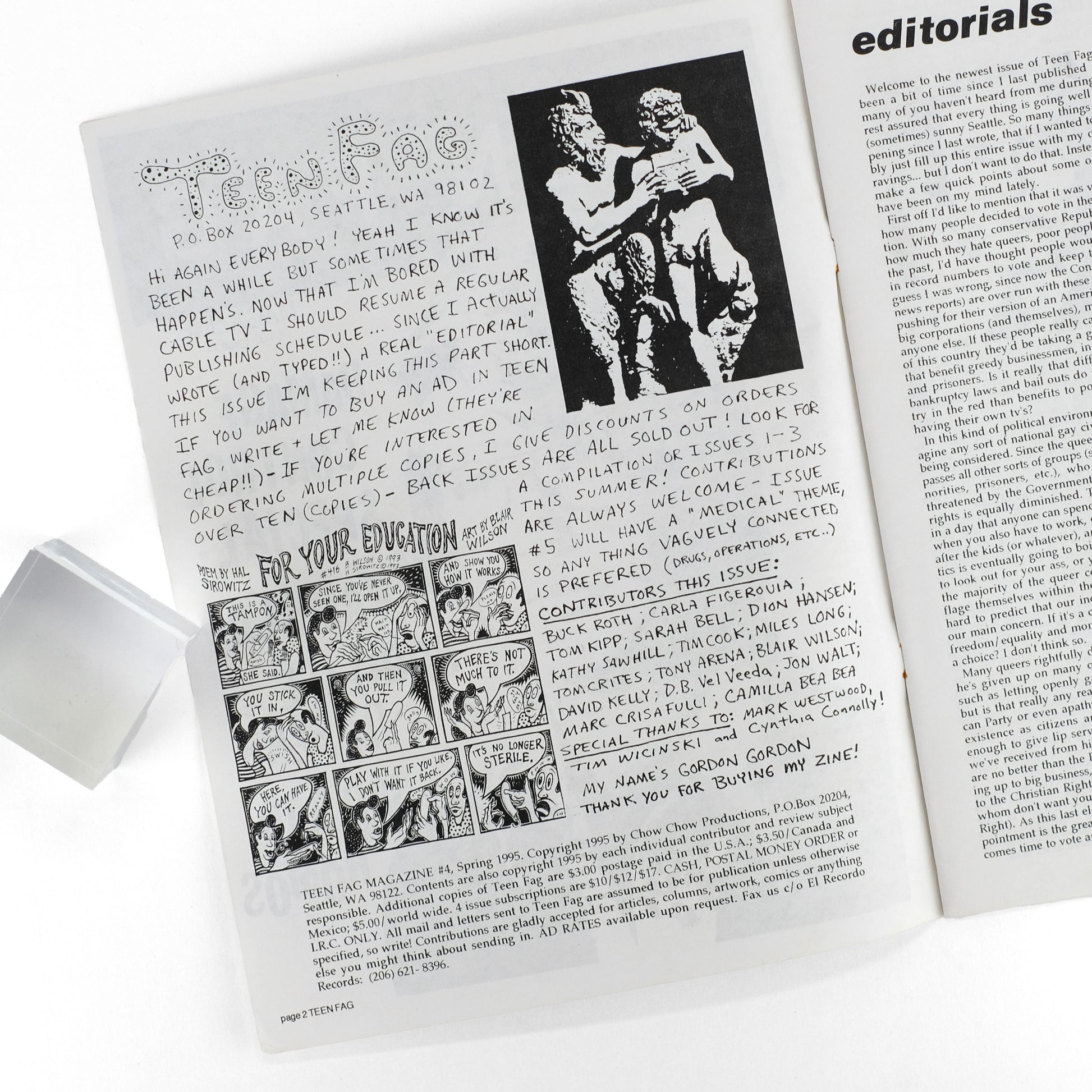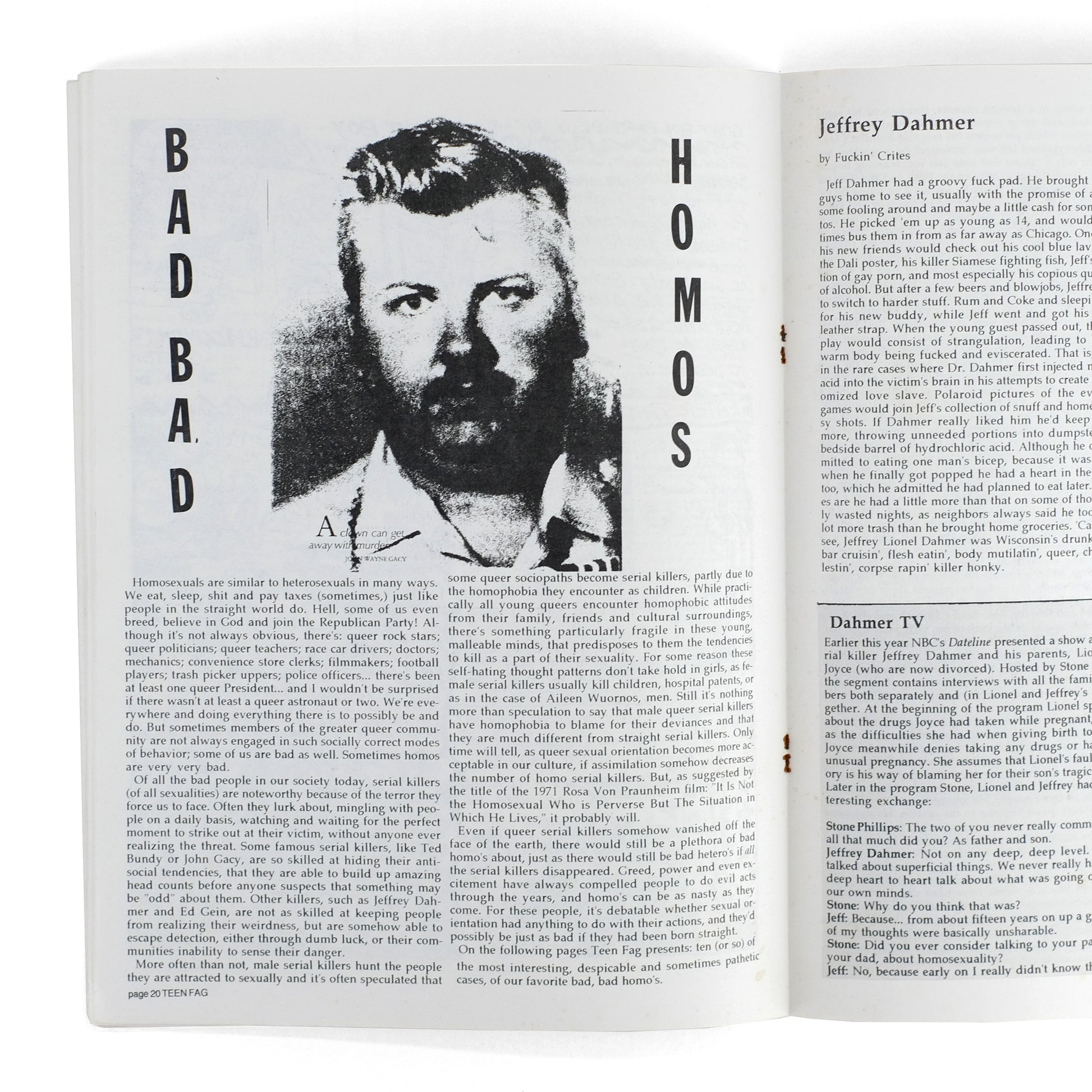 Fourth issue of this queer zine centered on Seattle and the Pacific Northwest. Contents include a critique of Camille Paglia; critical profiles of gay Republicans; an article about the Pro-Life ALliance of Gays and Lesbians (PLAGAL); a substantive and intelligent interview with Bill Andriette, editor of the NAMBLA Bulletin; a feature about "bad homos," including profiles of Jeffrey Dahmer, Roy Cohn, Jhon Wayne Gacy, Aileen Wuornos, et al; zine, music, and comic reviews; reader letters; editorials; etc. Illustrated throughout with black-and-white comic strips, drawings, and photographs. Contributors to this issue: Buck Roth, Carla Figerouia, Tom Kipp, Sarah Bell, Dion Hansen, Kathy Sawhill, Tim Cook, Miles Long, Tom Crites, Tony Arena, Blair Wilson, David Kelly, D. B. Vel Veeda, John Walt, Marc Crisafulli, and Camilla Bea Bea.