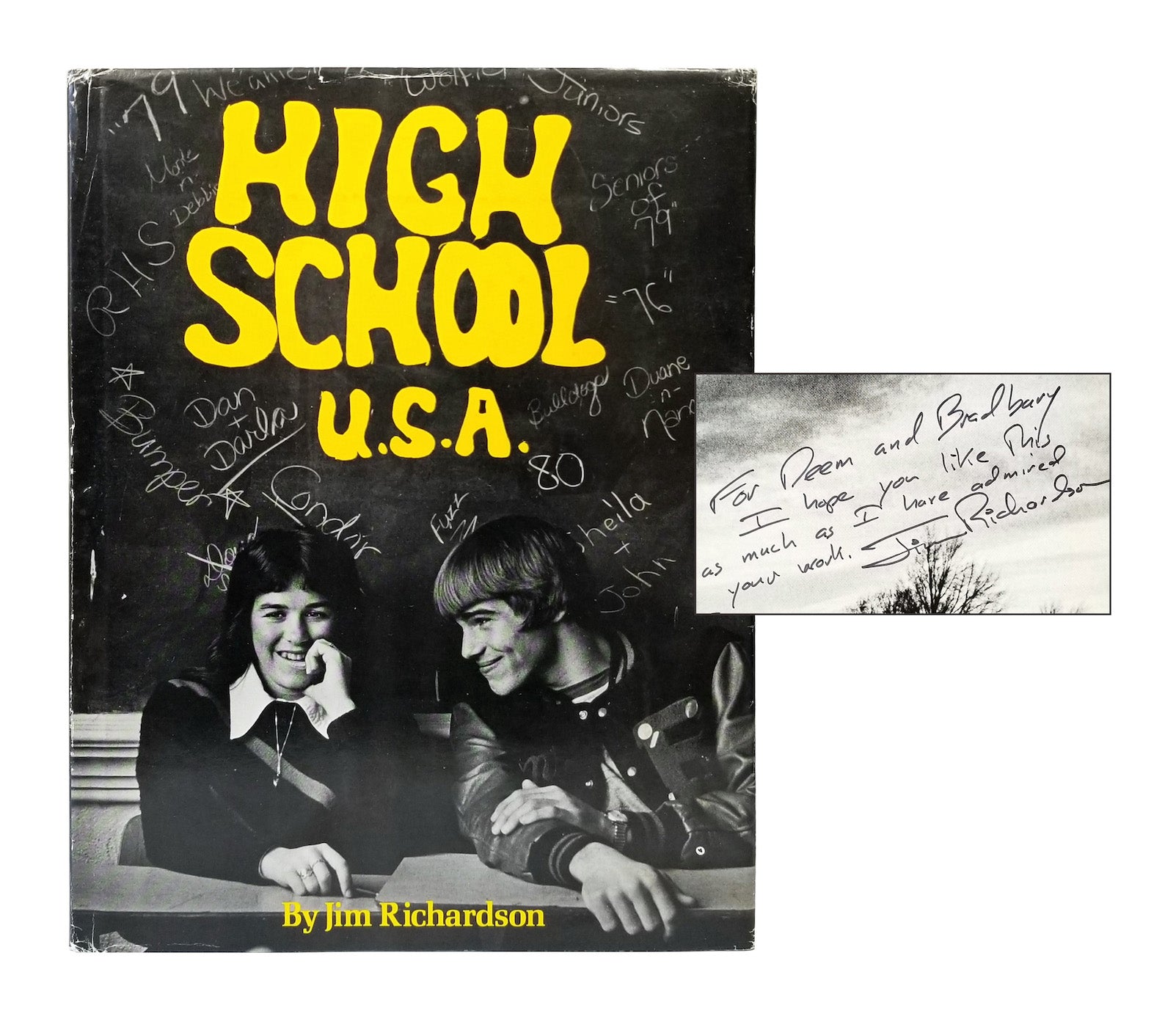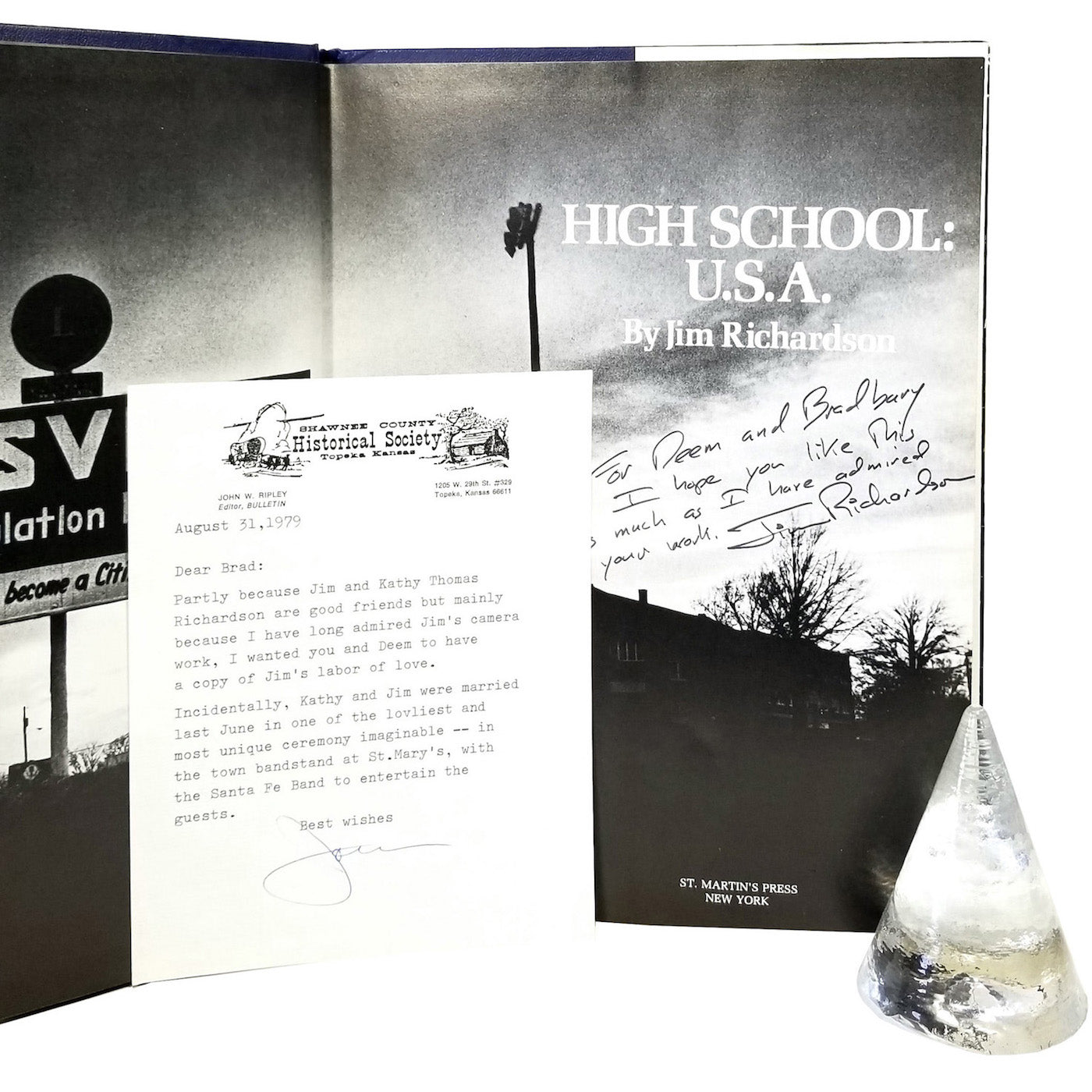 Presentation copy of Richardson's iconic photo-documentation of daily life at Rossville High School in Rossville, Kansas, as inscribed by him to noted American graphic designer J. Bradbury Thomspon—himself a native Kansan—and his wife: "For Deem and Bradbury / I hope you like this as much as I have admired your work." Also laid in is a typed note to "Brad" from John W. Ripley, editor of the Shawnee County Historical Society Bulletin, who recommends both Richardson and his book, while also making reference to Richardson's recent marriage, "one of the lovliest and most unique ceremony [sic] imaginable." We have been unable to determine whether "Deem," as written by RIchardson, was indeed a nickname of Mrs. Thompson's, or whether Ripley had elsewhere made a mistake that Richardson then repeated.