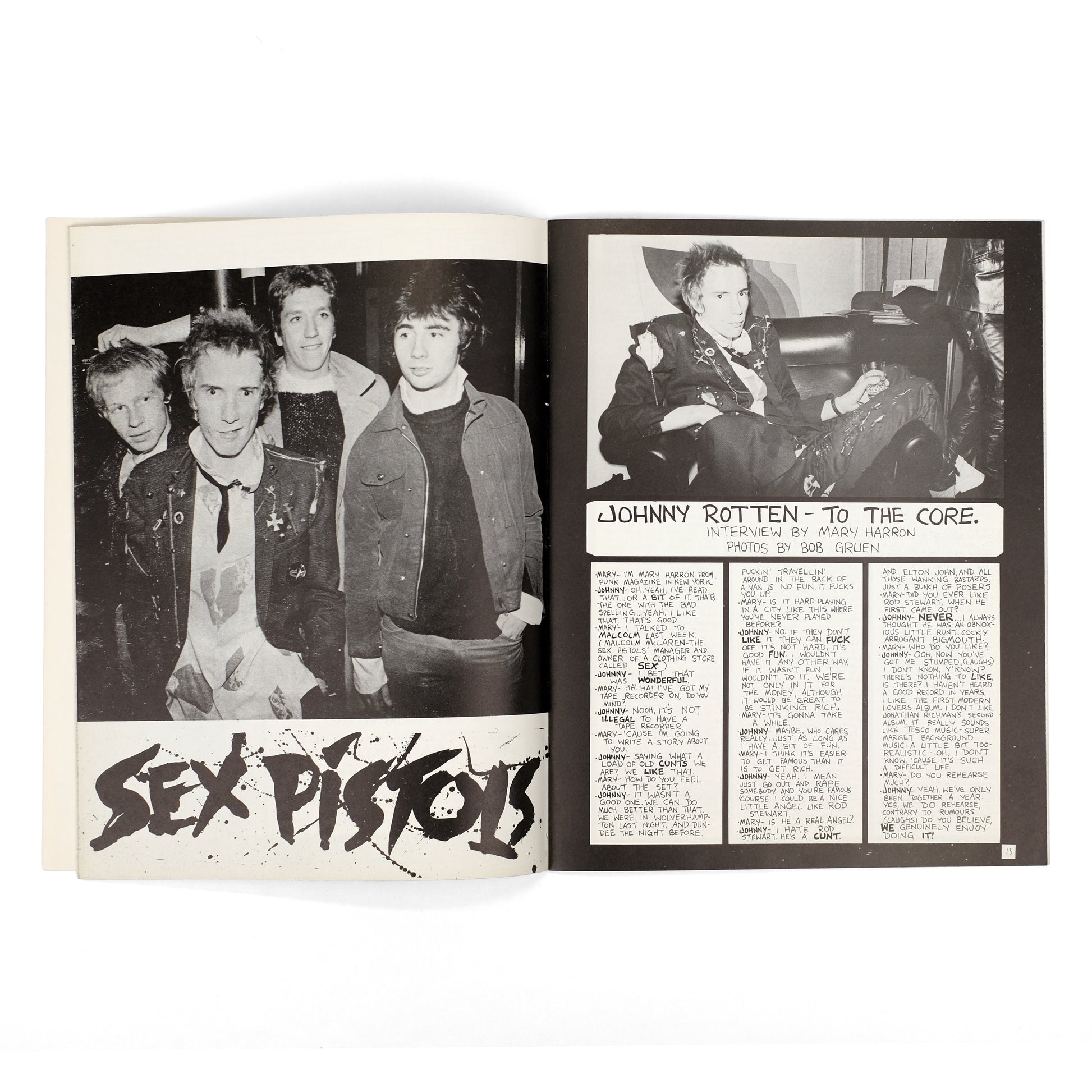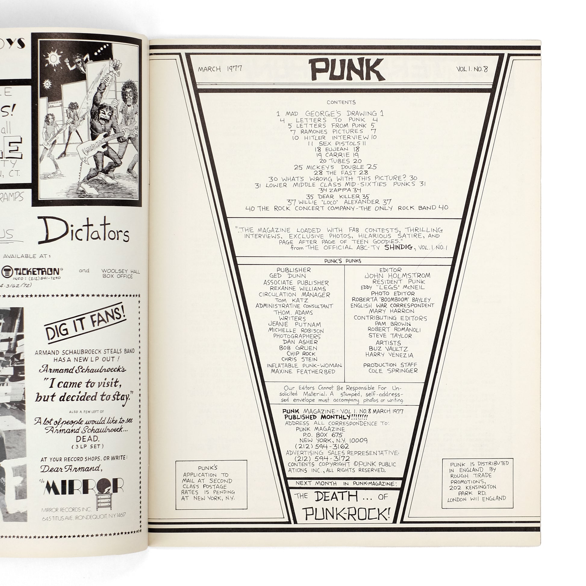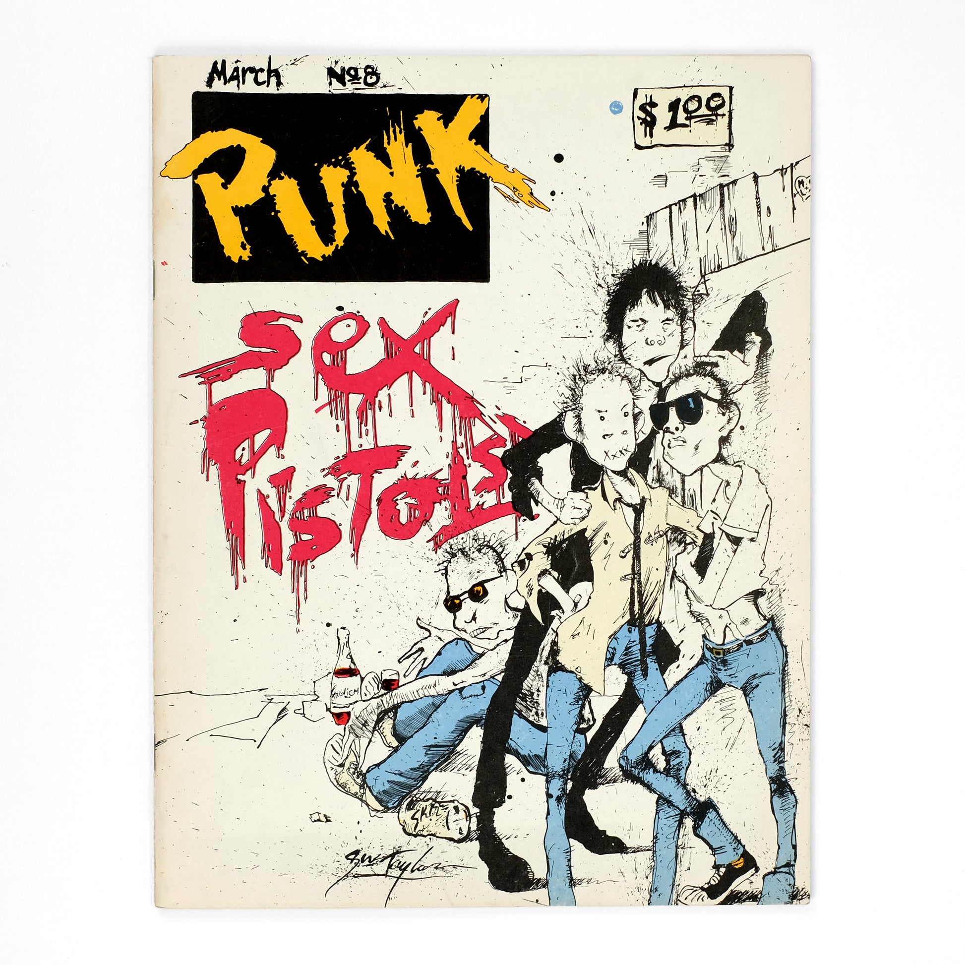 Nice copy of the eighth of fifteen total issues of this seminal punk magazine, founded by cartoonist John Homlstrom and music journalist Legs McNeil in 1975. Contents include a six-page interview by Mary Harron with the Sex Pistol's Johnny Rotten; a four-page interview by Michelle Robison with The Tube's singer Fee Waldo Waybill; a photo-feature on the Ramones; a one-page profile by Ram Brown of singer Willie Alexander; a farcical interview with Adolf Hitler; comic strips; reader letters; etc. Illustrated throughout with black-and-white illustrations and photographs, including many by Bob Gruen.