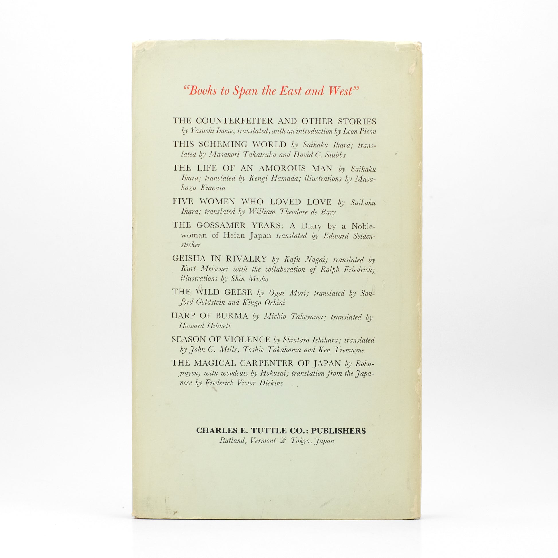 Rutland, Vermond: Charles E. Tuttle, 1967. Third printing. Octavo, 8-1/2 x 5 in. White cloth boards blind embossed on front panel; red spine lettering; in dust jacket. 74pp. Signed and inscribed in Japanese by Inoue on the front free end paper. With Mydan's ownership stamp on the opposite pastedown. Light bumping to top corners. Some rubbing/smearing to red spine lettering. Small tear to cloth in rear hinge where a sharp edge of what looks like internal adhesive has rubbed through. Price-clipped jacket with a detached but 2 x 1 in chip at top of front panel, re-attached via tape on interior. Slight loss at spine ends. Moderate edge and corner wear. Altogether near fine in a very good (-) jacket. An uncommon example of the Japanese writer's signature.