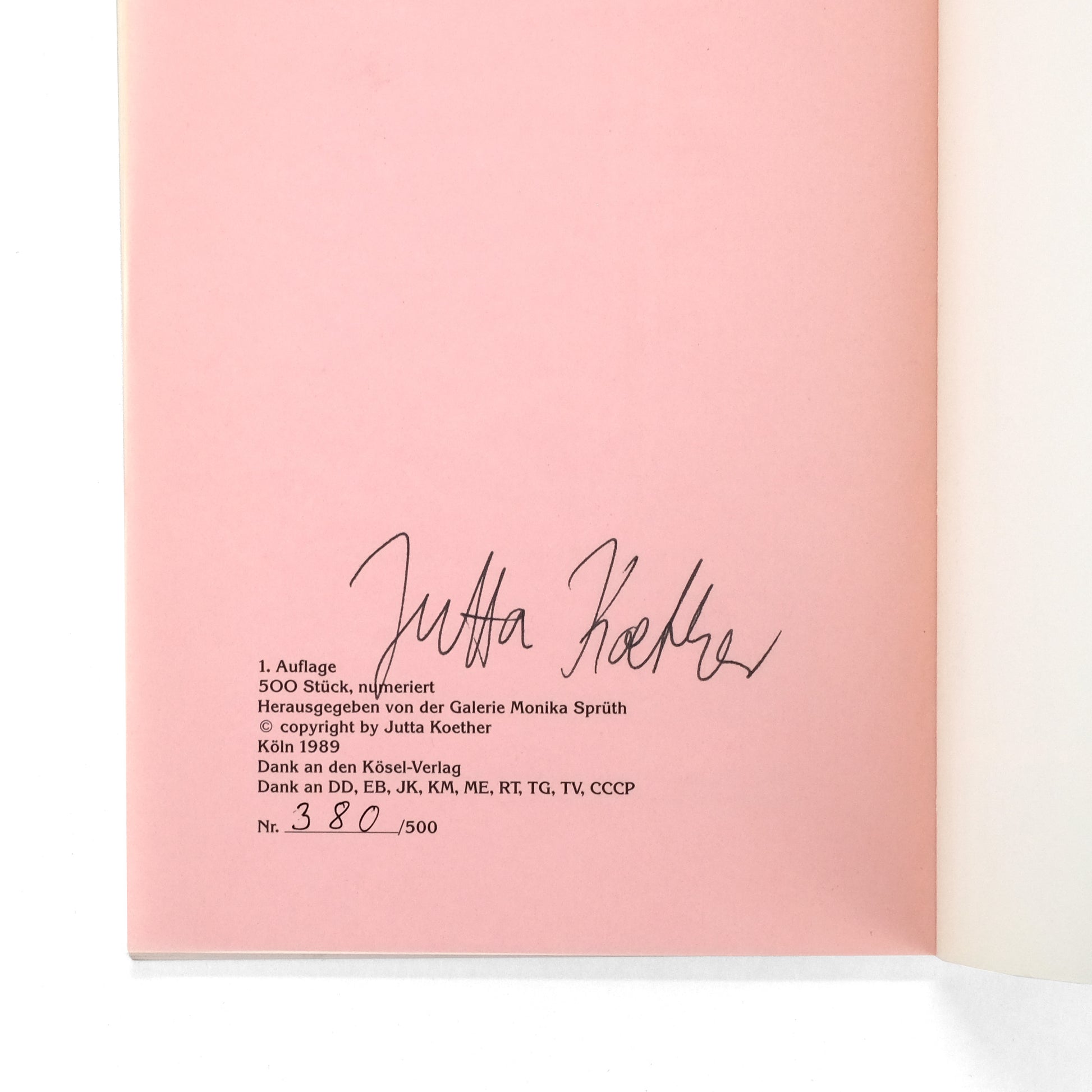 Köln: Galerie Monika Sprüth, 1989. No. 380 of 500 copies, signed by Koether to limitation page at rear. [232]pp; blank white leaves alternating with pairs of printed pink tissue paper; illus. Wraps. Light wear and rubbing to wraps; near fine.