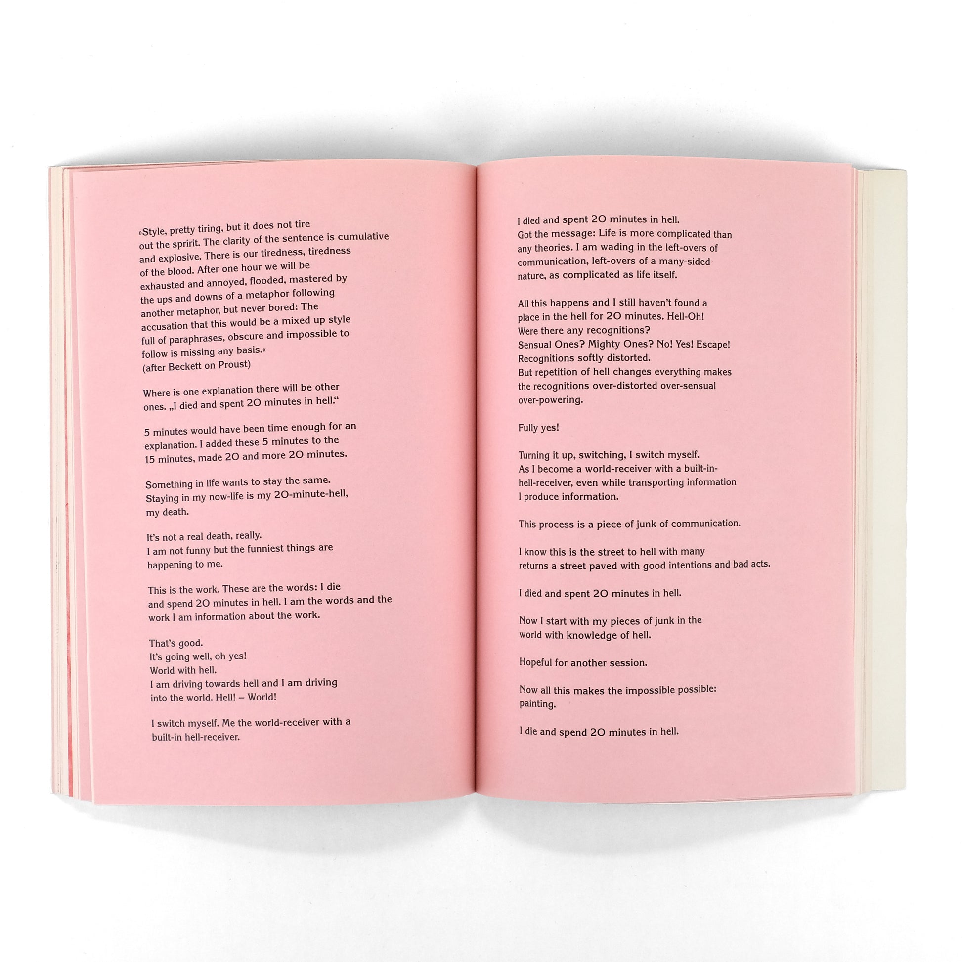 Early artist's book compiling drawings and texts by German artist, musician, and critic Jutta Koether (b. 1958). Drawings executed in black ink and red wash; some drawings with incorporated holograph text. Also the long titular poem, beginning "I died and spent 20 minutes in hell," printed in both German and English.