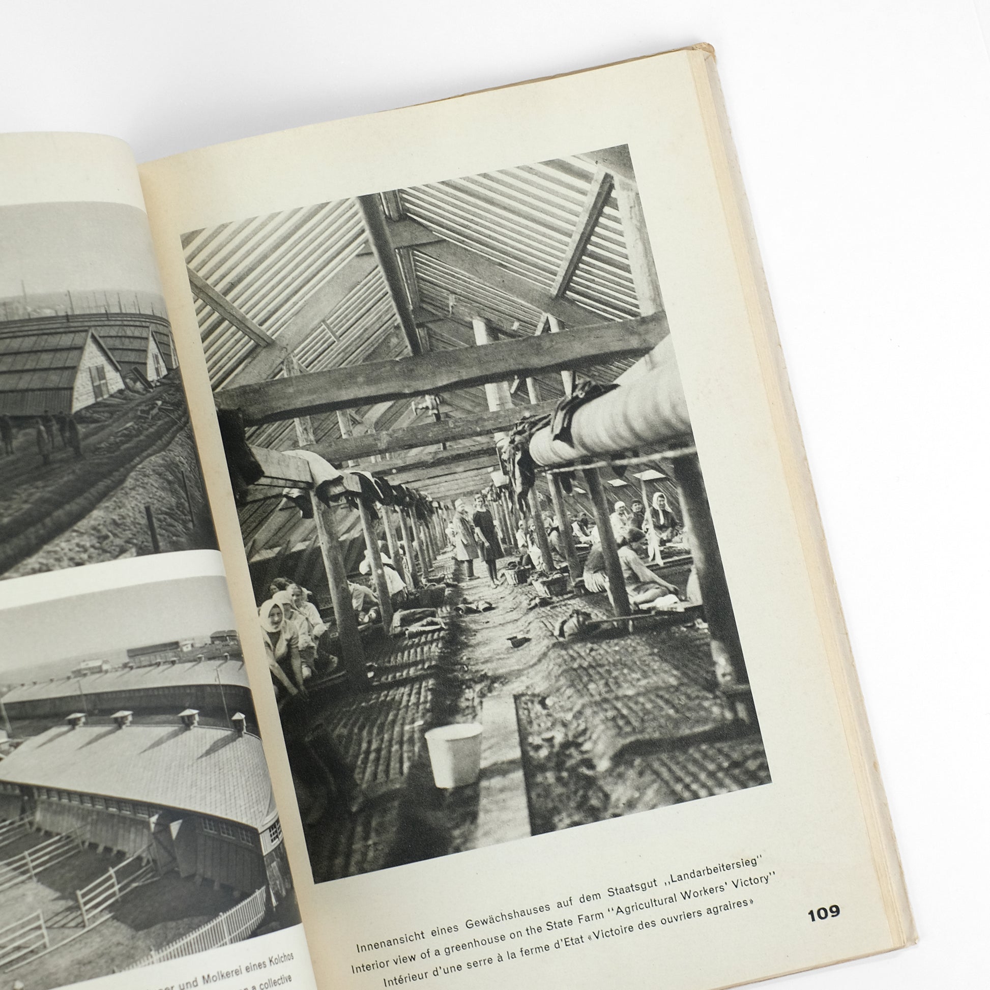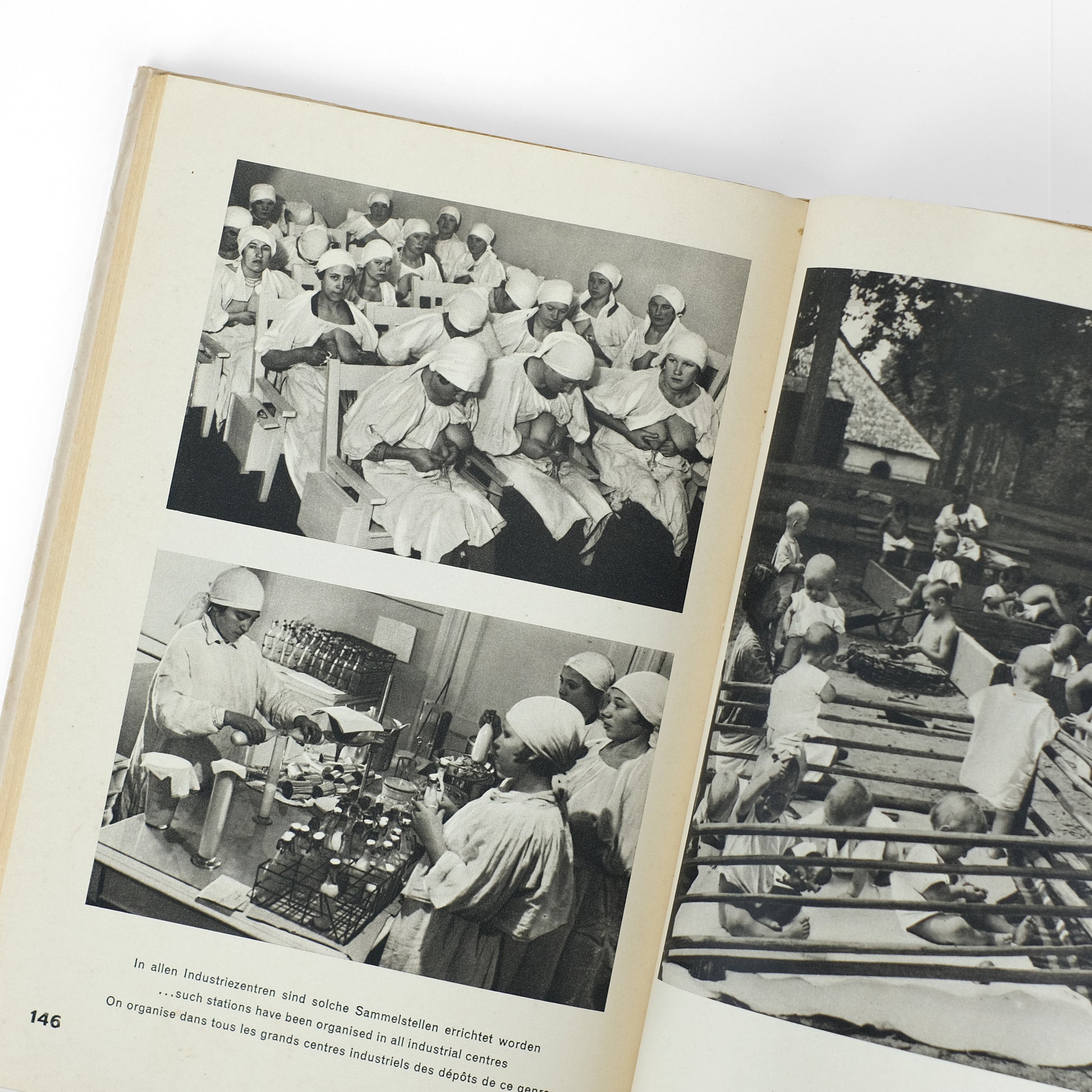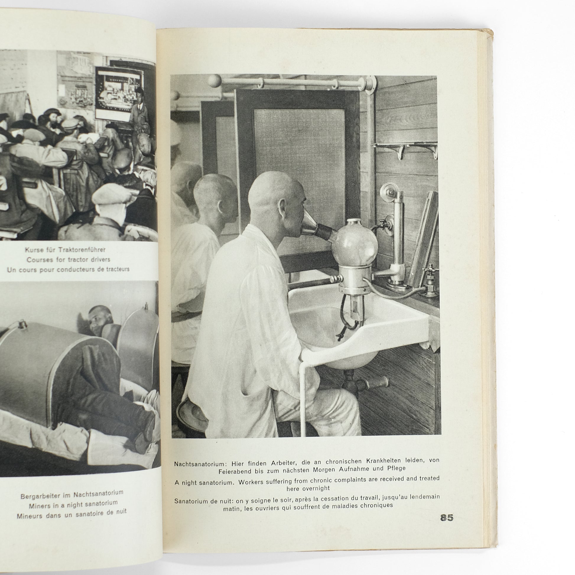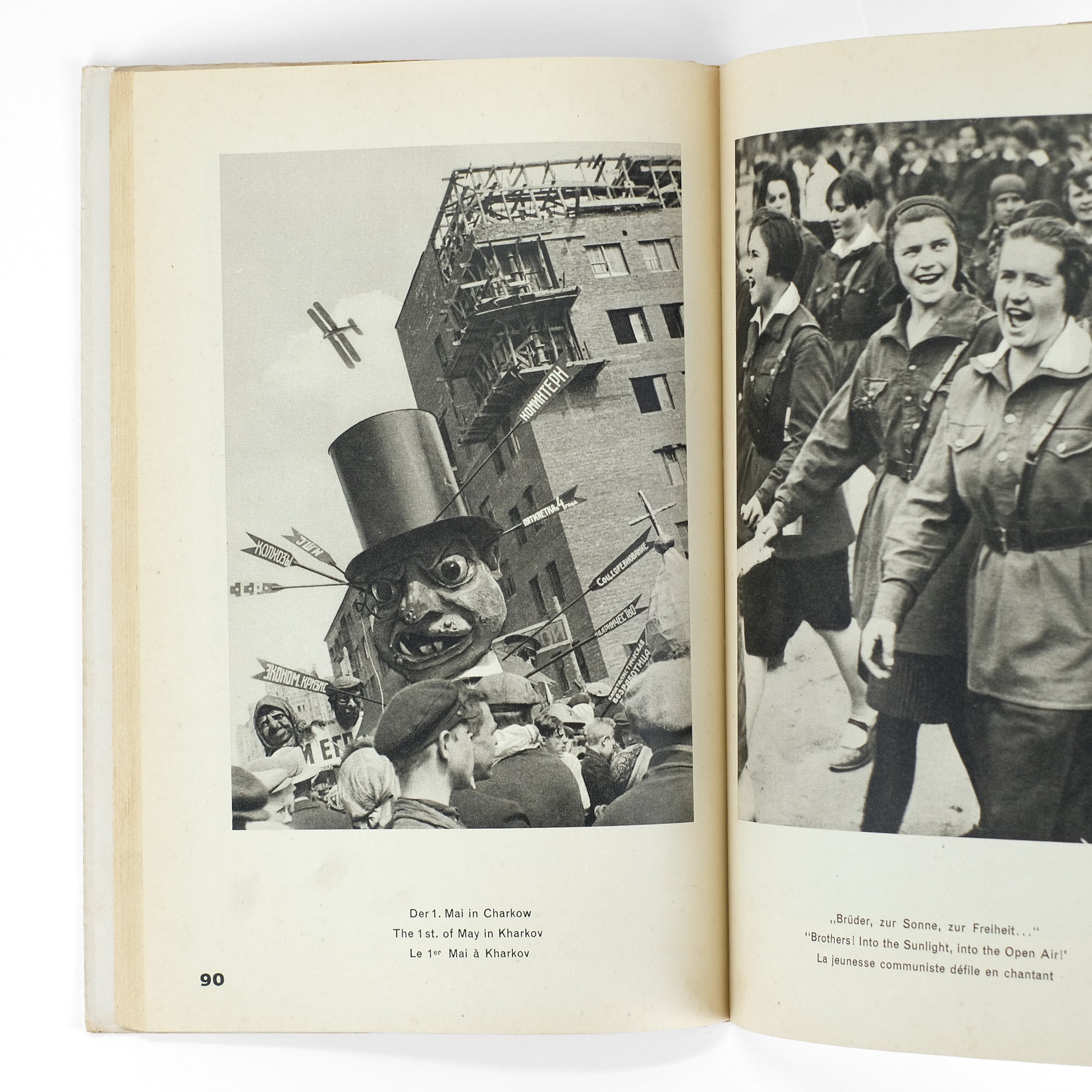 Photobook of strikingly black-and-white images depicting various facets of a Russia still in the giddy early years of its Communist experiment, as selected by Ernst Glaeser and F. C. Weiskopf from over 5,000 documents provided by Moscow's Ogonjok magazine, and Berlin's Unionbild. Images grouped according to theme, and with descriptive captions in German, French, and English. Foreword in French only. This French edition preceded by the German of 1931, Der Staat ohne Arbeitslose.