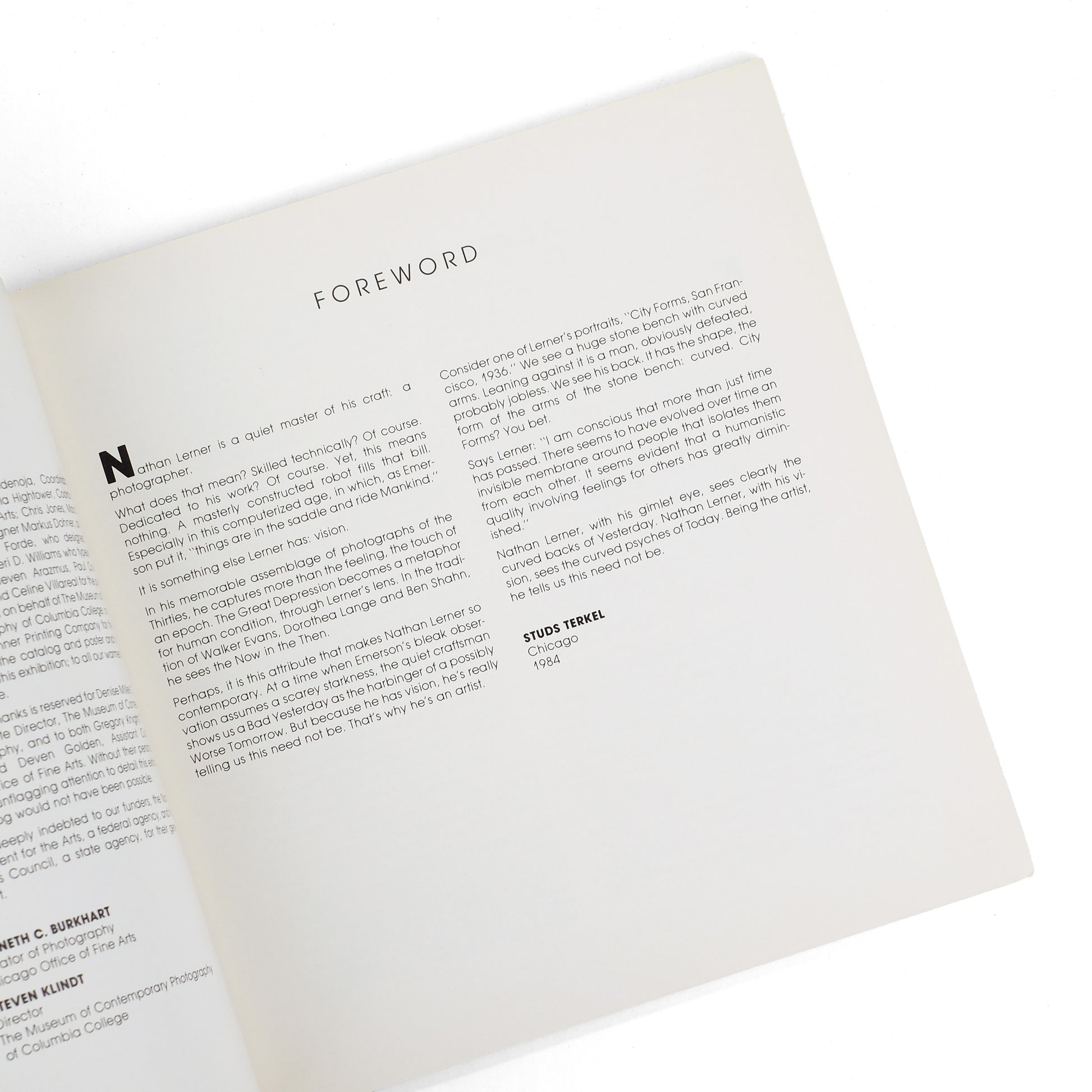 Catalog for a 1984 exhibition of work by American photographer Nathan Lerner (1913-1997) at the Chicago Public Library. Foreword by Studs Terkel. Introduction by Harry Bouras. 35 black-and-white, and six color plates, with lists of previous exhibitions, public collections, and checklist at rear.