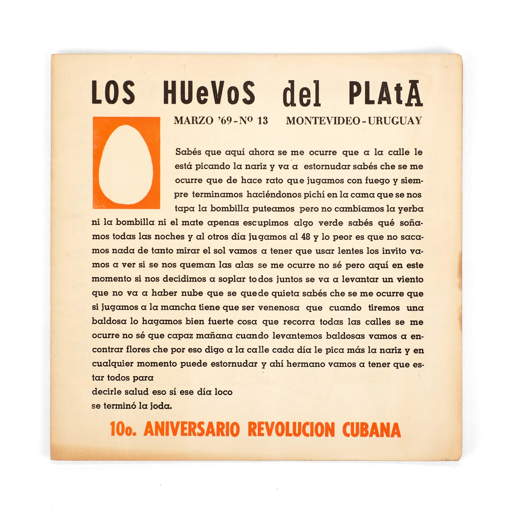 Montevideo: Los Huevos del Plata, 1969. [24]pp; b&w illus. Square 8vo. Wraps. Soft vertical creases to both covers near spine; toning to covers and textblock; crimping and closed tears to edges of most leaves. Else clean and complete; good.