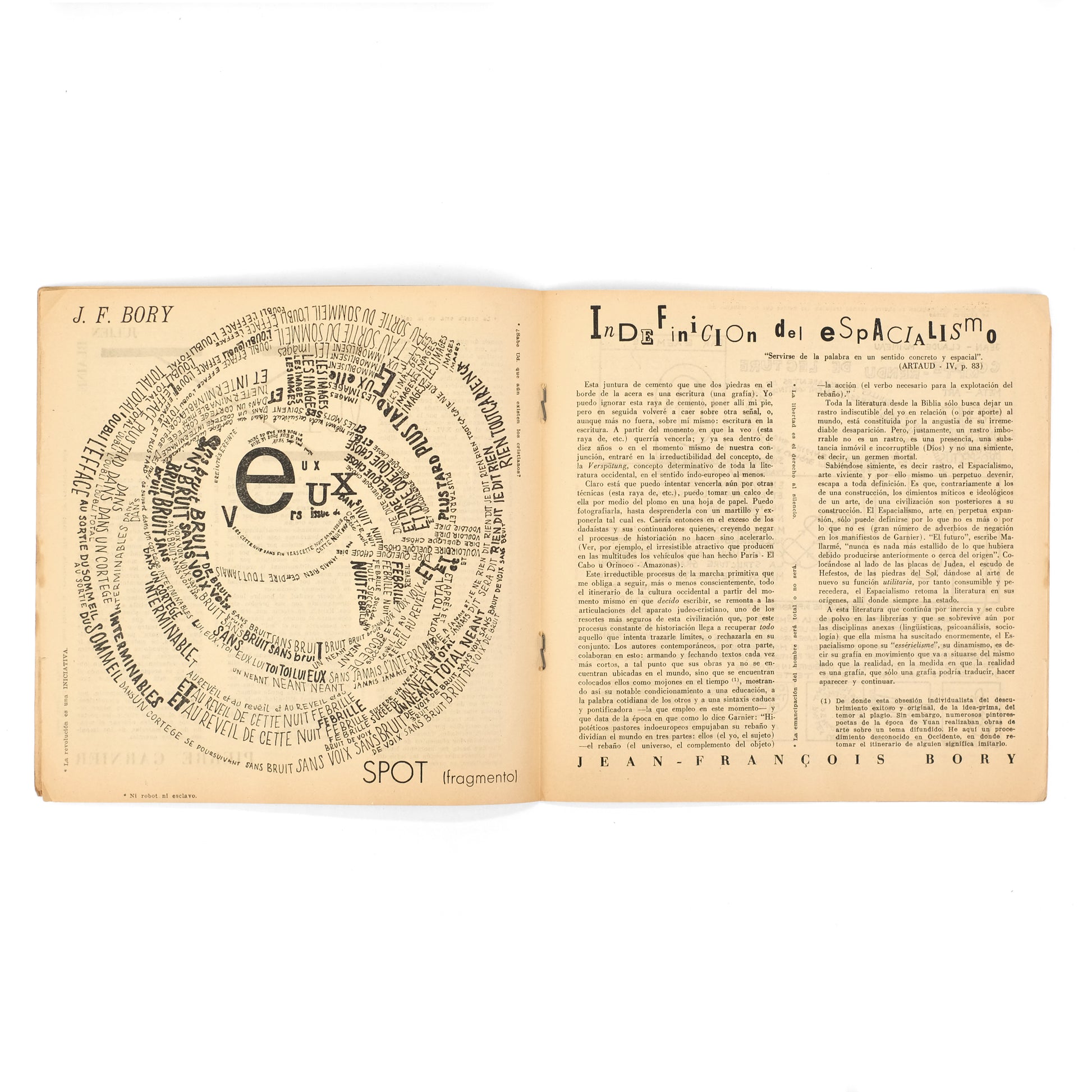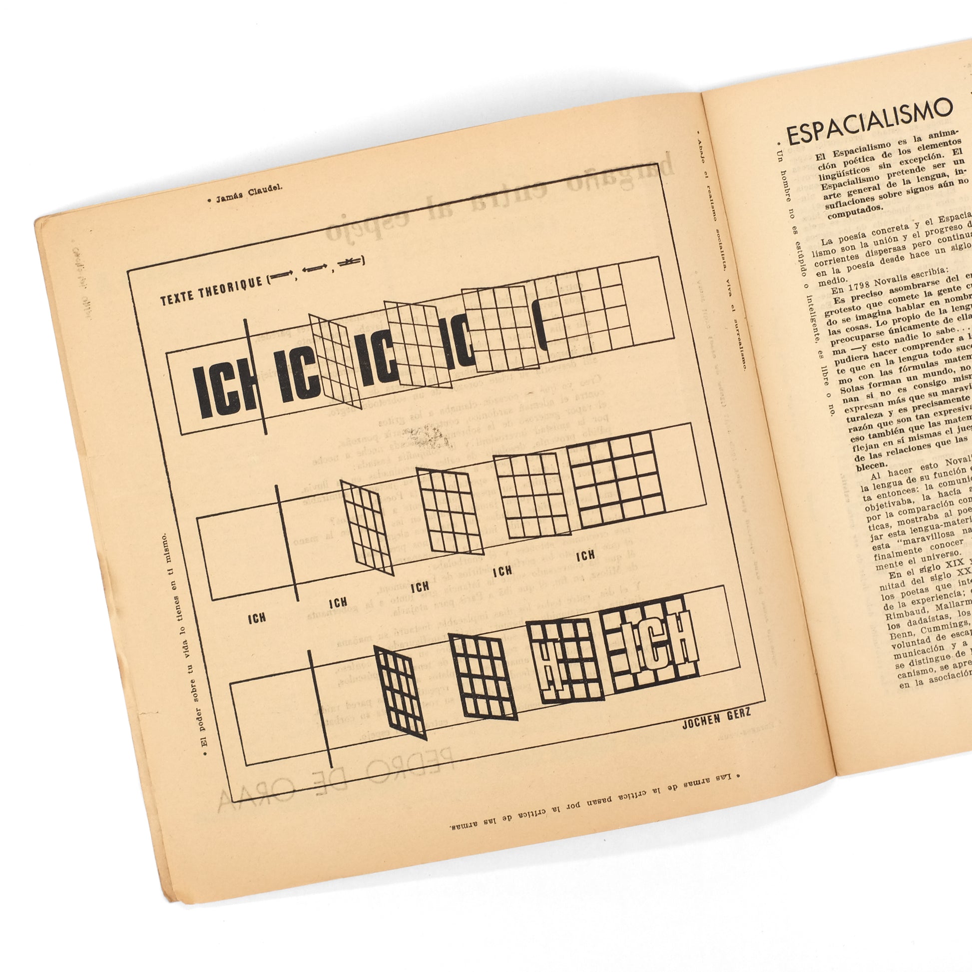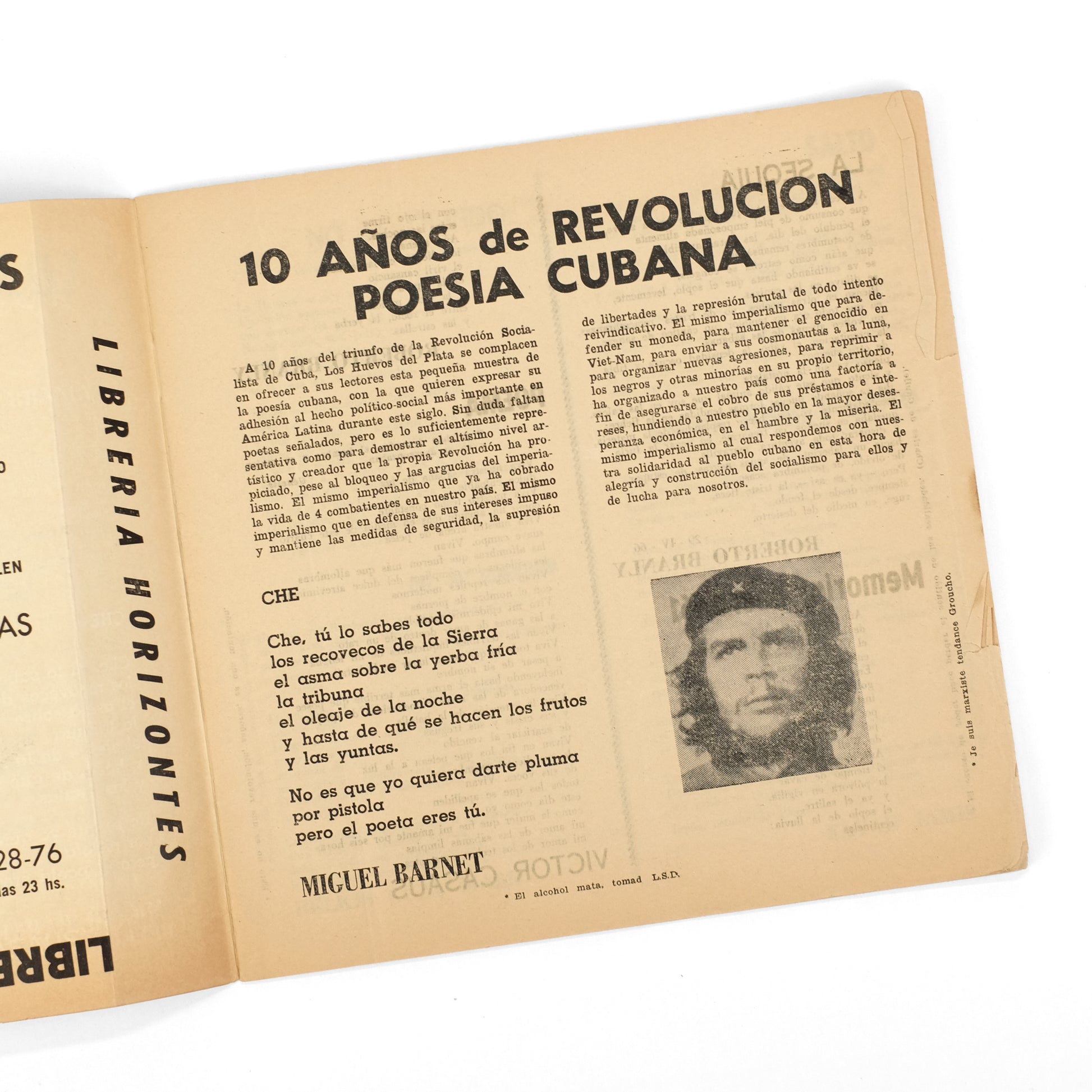 Penultimate issue of this Uruguayan journal of poetry—predominantly concrete—edited by poet and artist Clemente Padin (1939-2025). This issue with a feature on the 10th anniversary of the Cuban revolution, with conventional verse by various Cuban poets (Miguel Barnet, Roberto Branly, Victor Casaus, Belkis Cuza Male, Fayad Jamis, Guillermo Rodriguez Rivera, Pablo Armado Fernadez, et al.). Also numerous articles about, and examples of, concrete poetry, including work by Jochen Gerz, Ilse and Pierre Garnier, Julien Blaine, J. F. Bory, Jean-Claude Moineau, Carlo A. Sitta, Hugo Mund Jr., et al. OCLC locates only microfilm holdings of this scarce periodical.