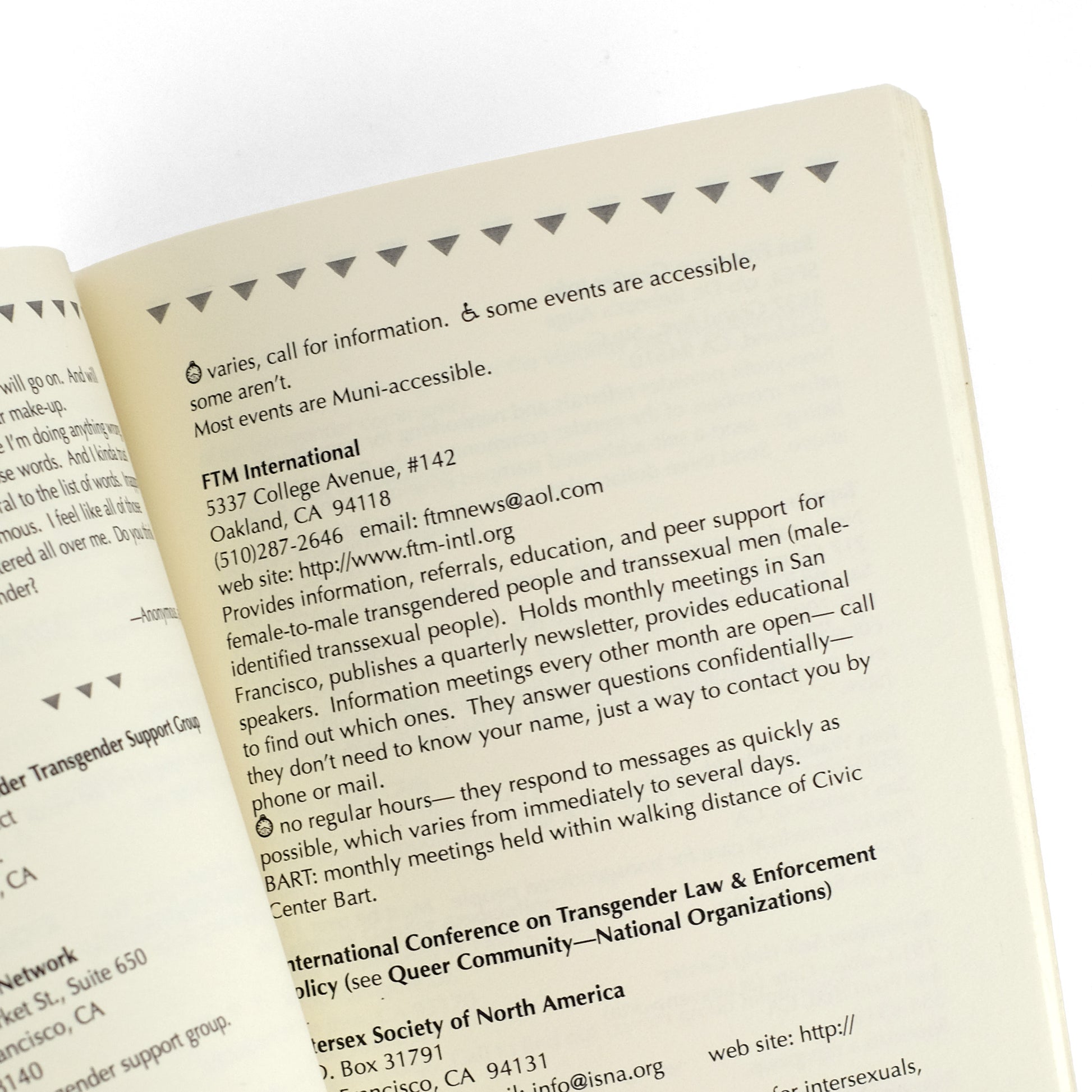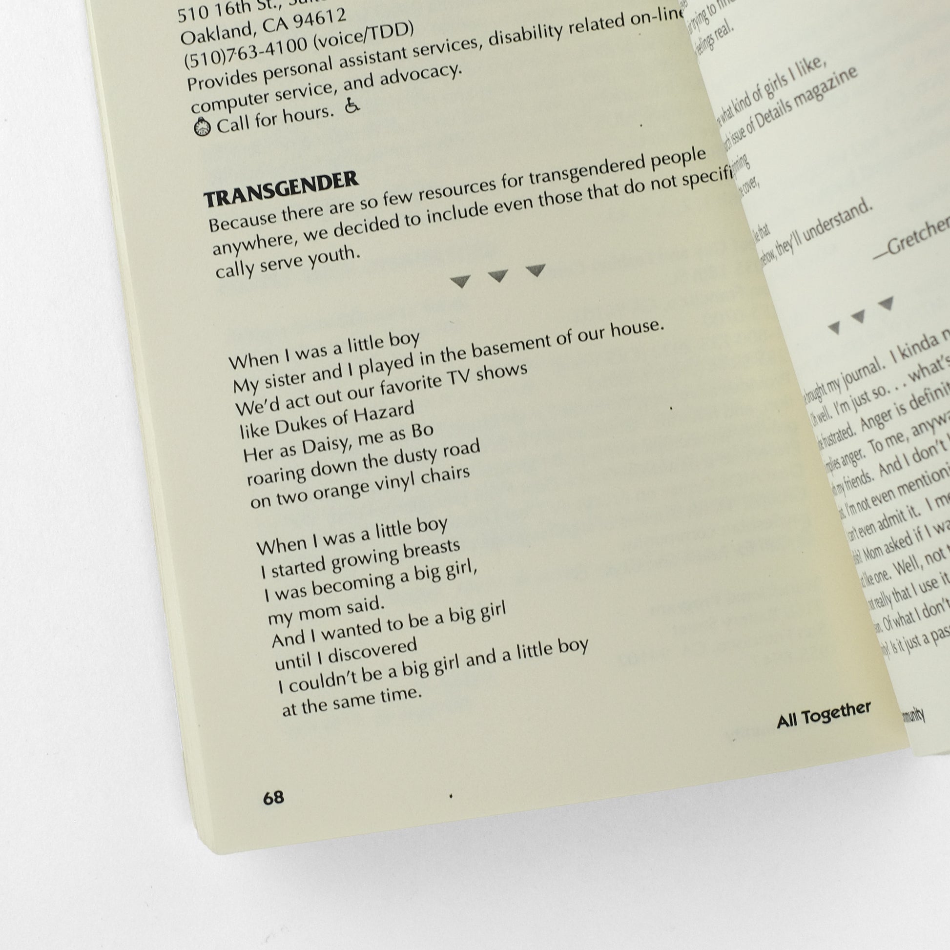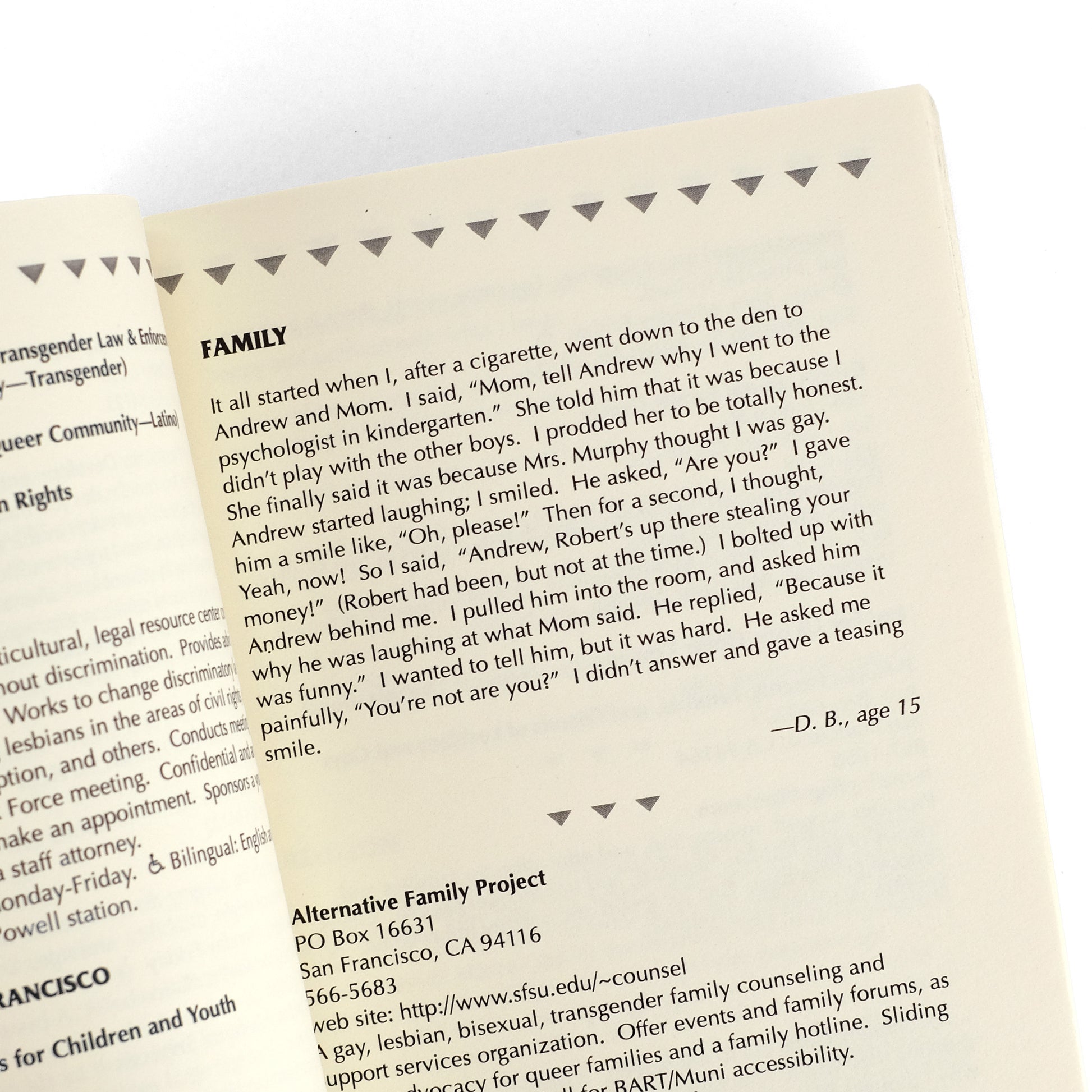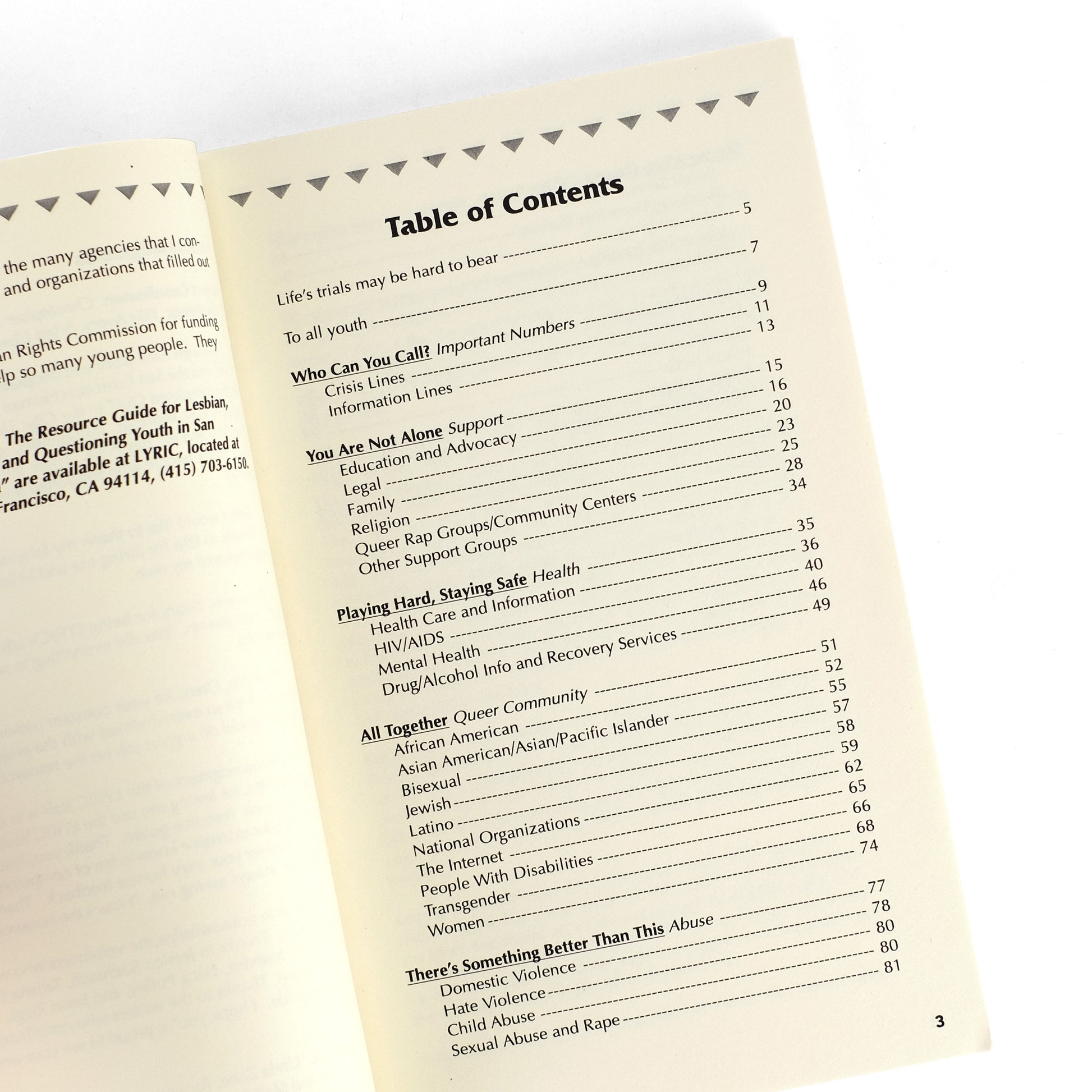 LGBTQIA+ resource guide published by a Bay Area youth services organization; entries arranged in sections, including education and advocacy, legal aid, healthcare (including HIV/AIDS support), BIPOC queer groups, runaway/homeless shelters, transgender support, etc., with contact information and brief descriptions of each organization. With poems and personal testimonies from queer youth throughout. Uncommon; OCLC locates five holdings, most of which repeat an unsupported publication date of 1992.