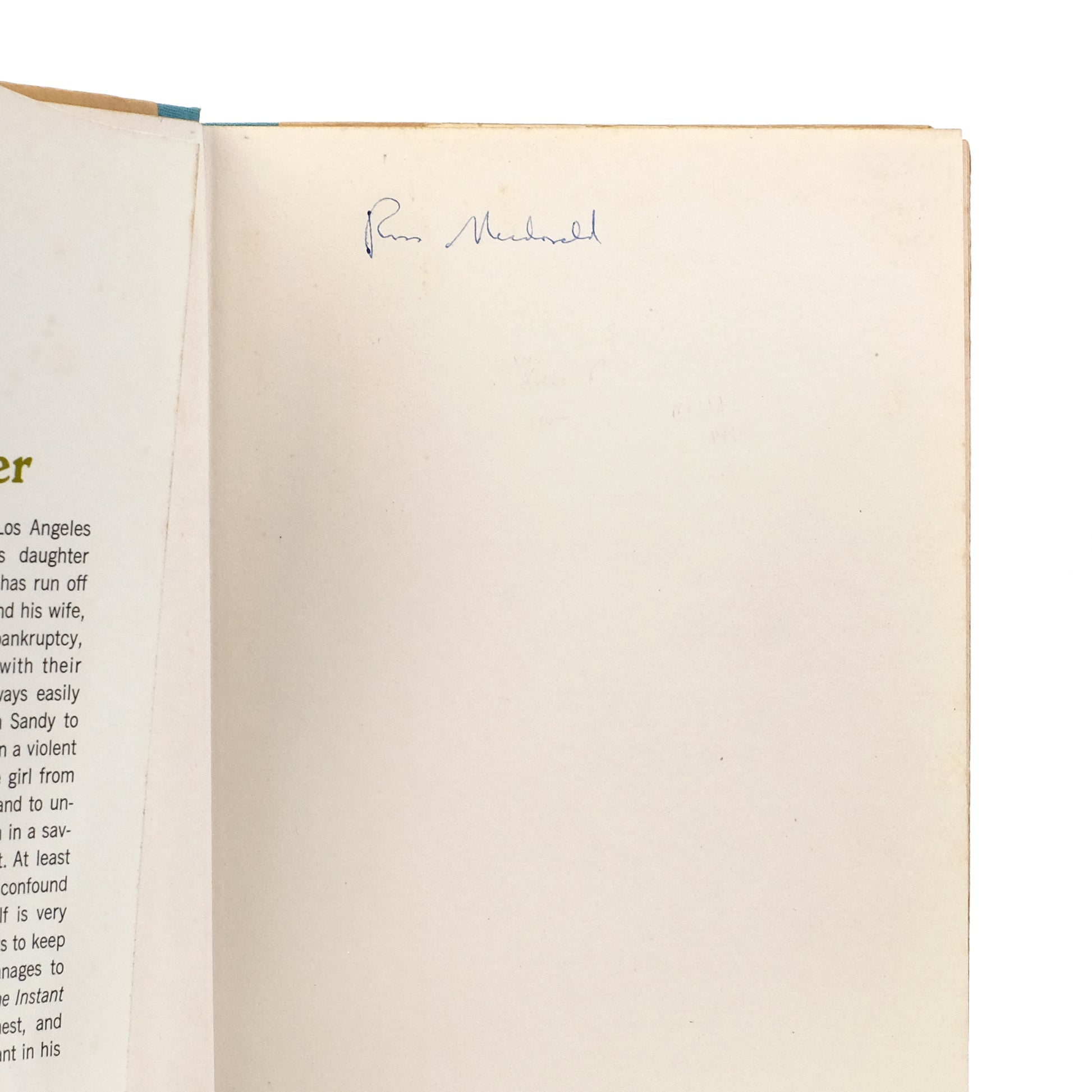 The 14th entry in the Lew Archer series of hardboiled mystery novels by Ross Macdonald, the primary pseudonym of American-Canadian writer Kenneth Millar (1915-1983). This copy signed by Millar (as Macdonald) at the front free endpaper.