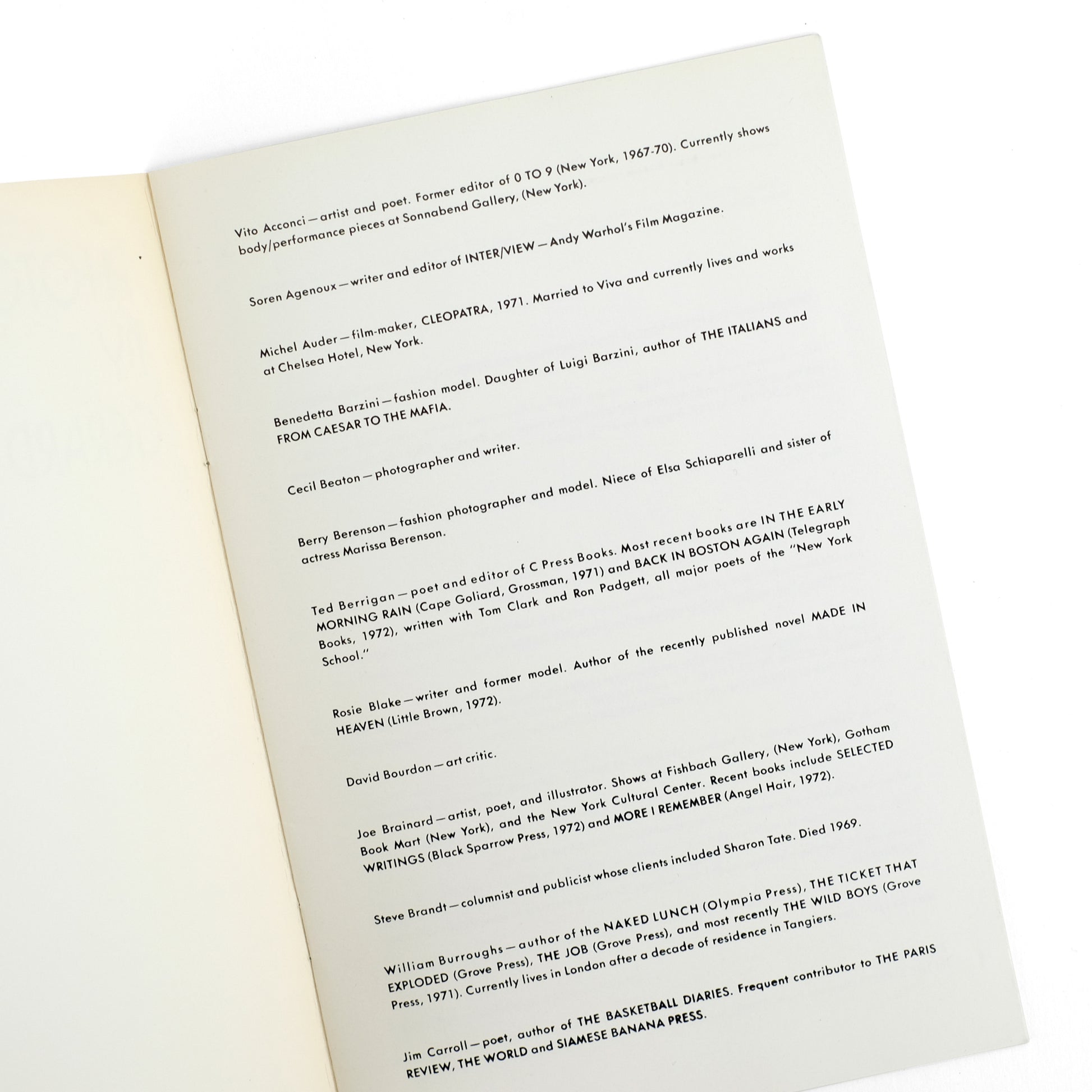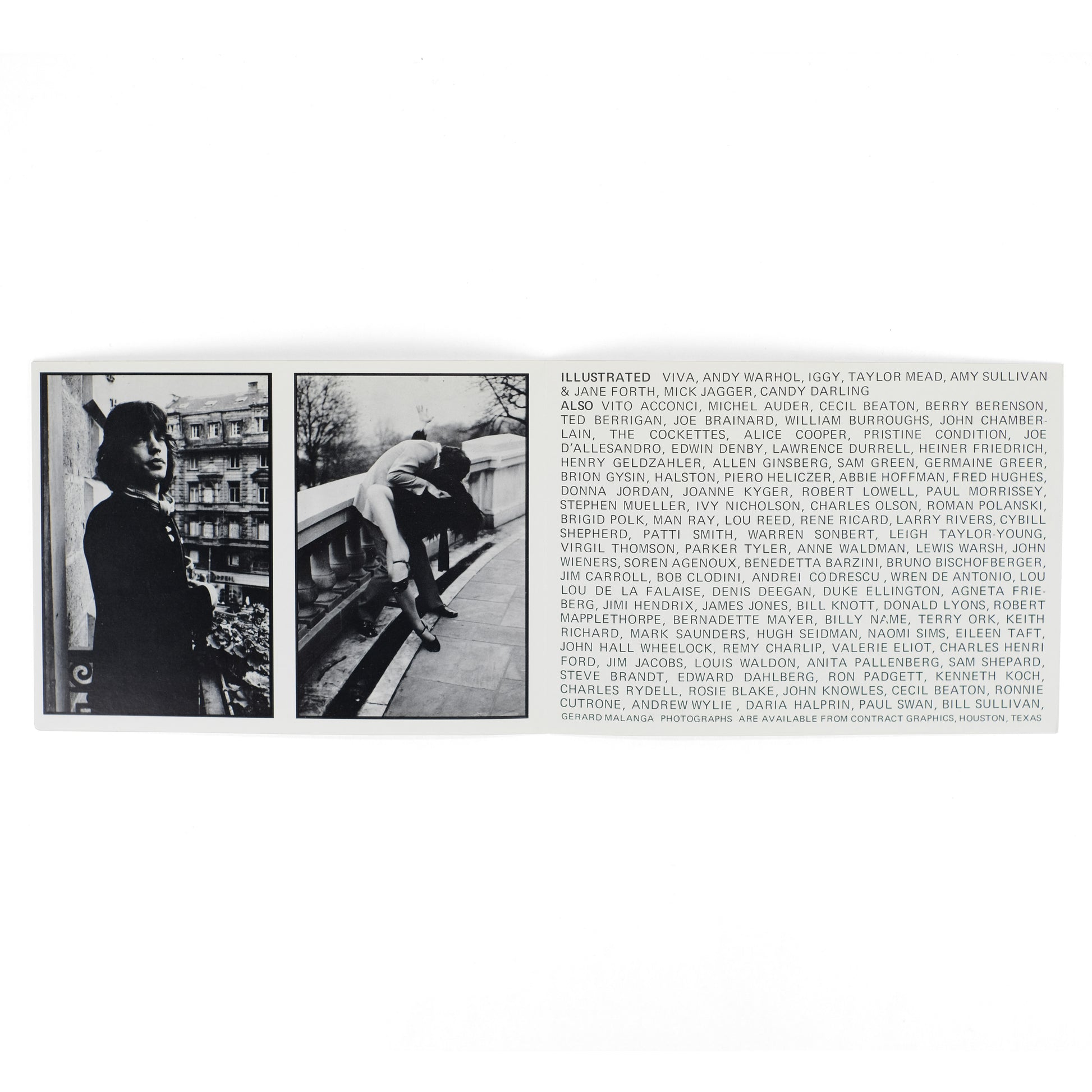 A catalog and announcement brochure for an exhibition of photographs by American writer, photographer, and Warhol-associate Gerard Malanga (b. 1943) at the Rice University Institute for the Arts, September 9 - October 28, 1972. The larger catalog consists solely of capsule biographies of Malanga's subjects. The announcement brochure lists the names of subjects and reproduces seven black-and-white portraits from the show (of Viva, Andy Warhol, Iggy Pop, Taylor Mead, Amy Sullivan and Jane Forth, Mick Jagger, and Candy Darling).