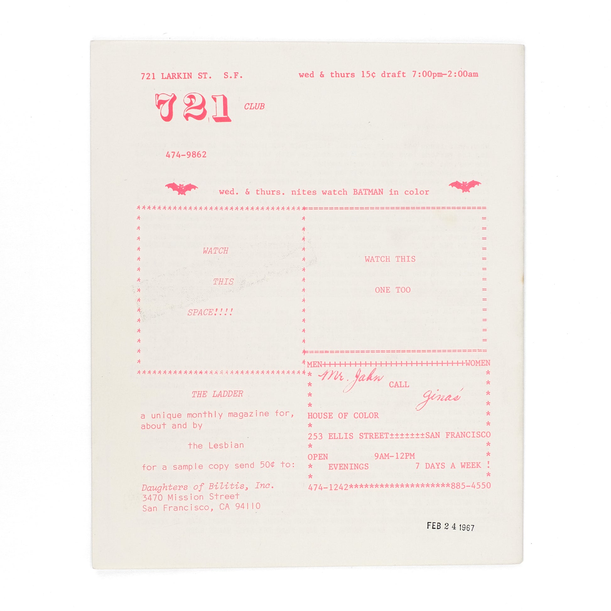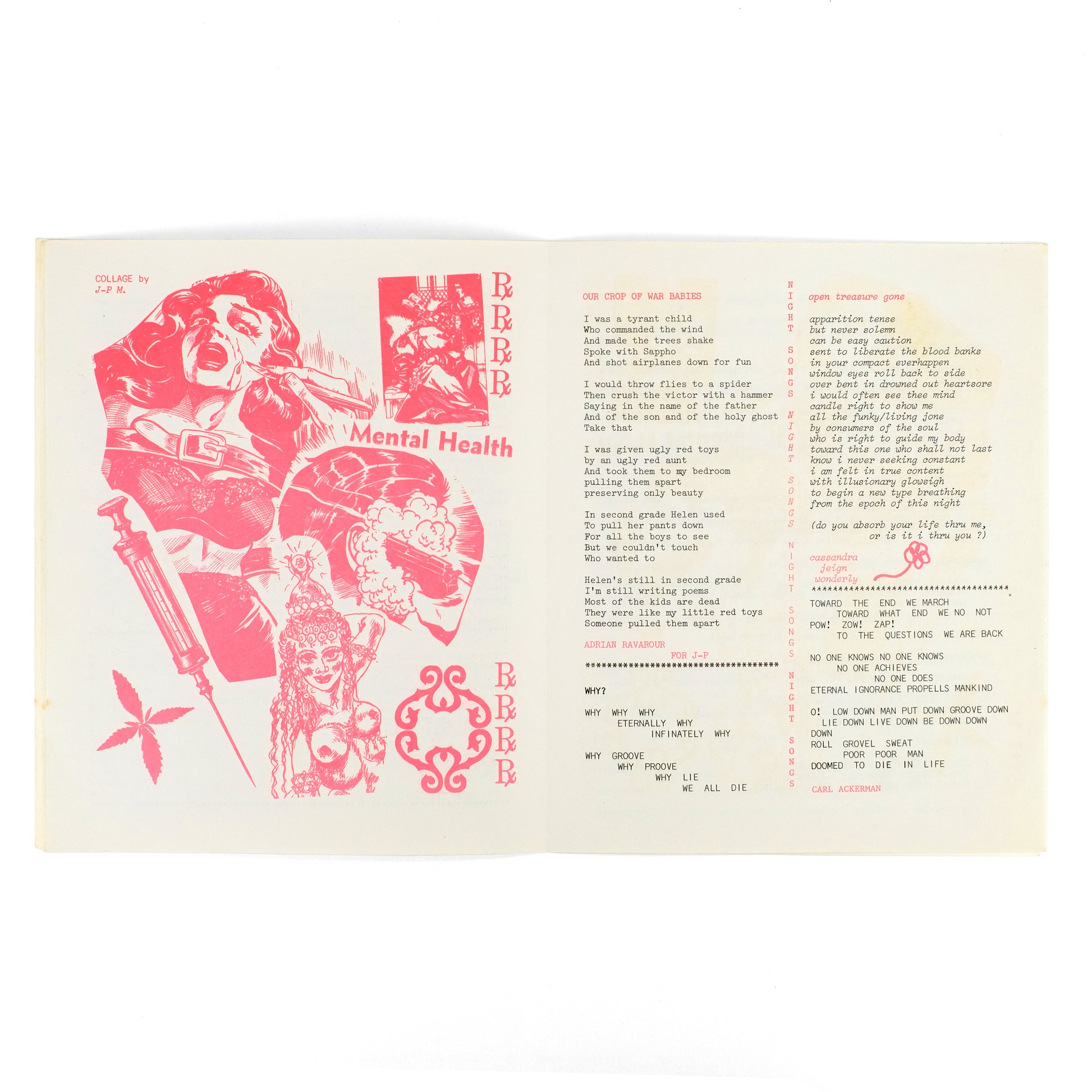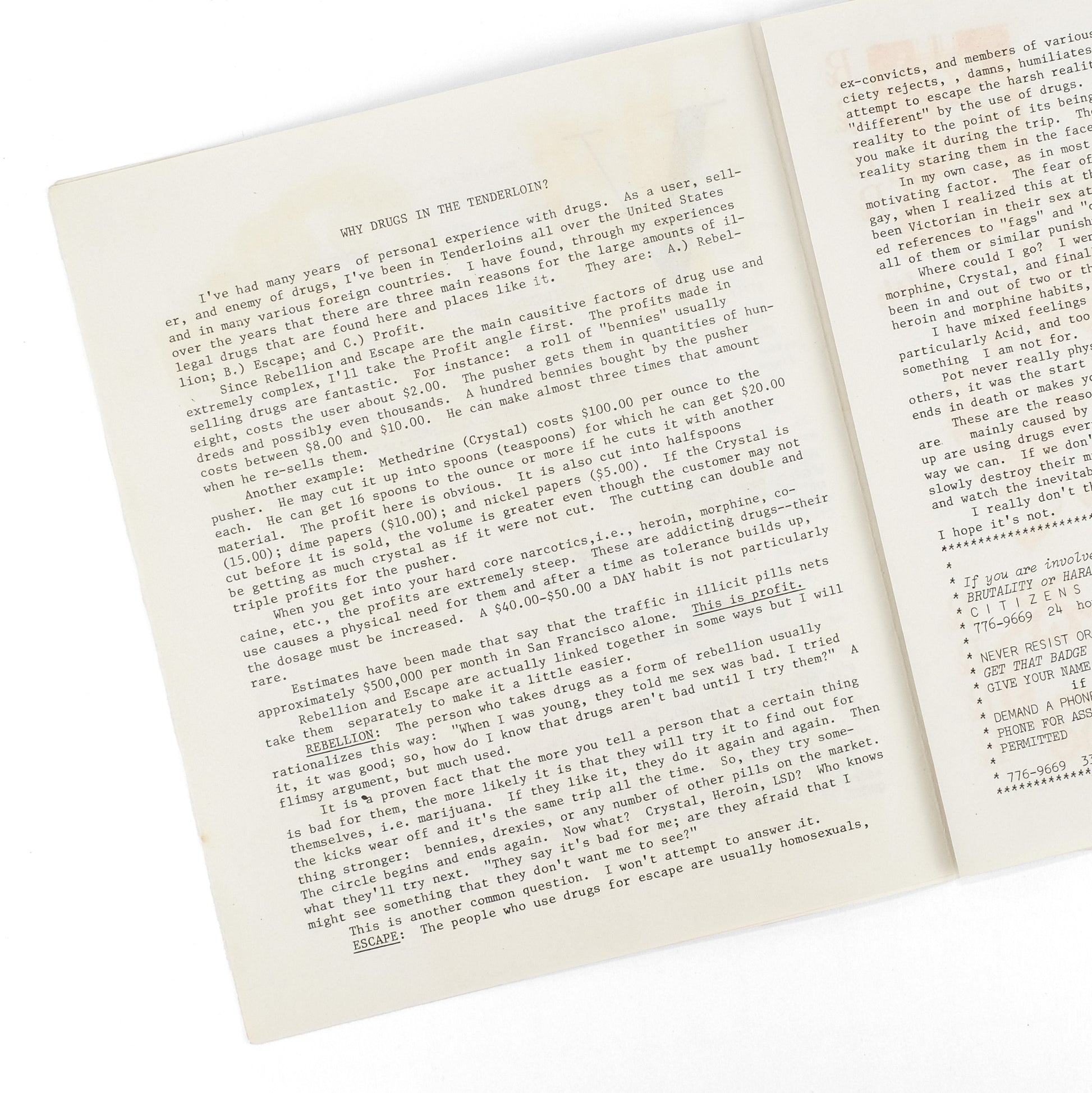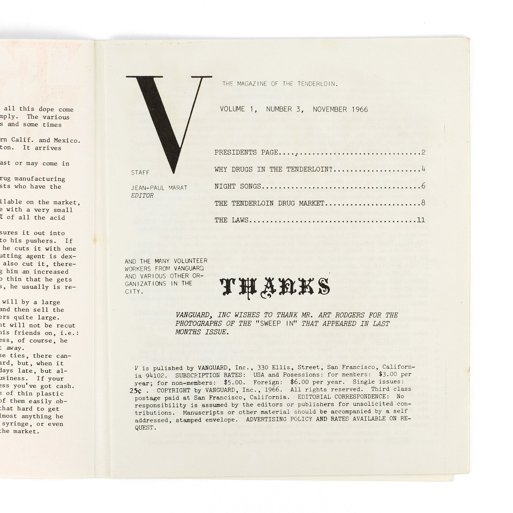 Third issue of this scarce counterculture periodical addressing in a frank and supportive manner the facts of drug use among San Francisco youth, notable for having been published by the gay rights youth organization Vanguard, of which editor Marat was the president. Contents include an opening statement on the availability and distribution of various drugs; "Why Drugs in the Tenderloin?" discussing the reasons behind the neighborhood's high rate of drug use; a collage by Jean-Paul Marat; poems by Adrian Ravarour, Cassandra Jeign Wanderly, and Carl Ackerman; a list of various drugs, including street names, dosage units, psychological effects, etc; and an editorial about the unfair persecution of Tenderloin drug users by the police. Scarce; our OCLC search efforts (for both "The Needle" and "V : The Magazine of the Tenderloin") locate only microform holdings, and no institutions with physical copies.