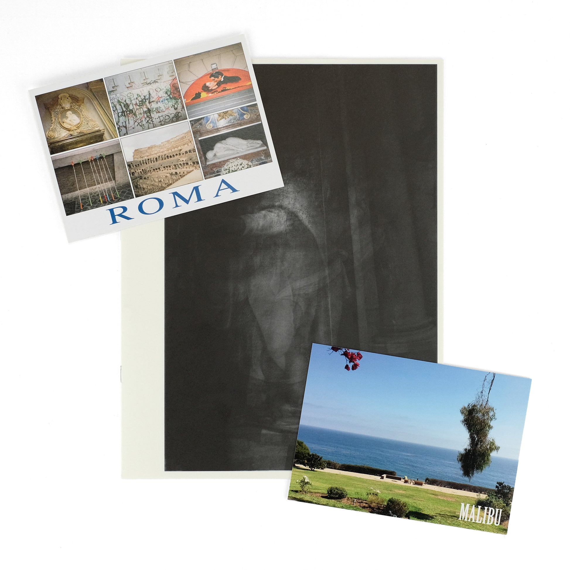 A limited edition photozine by American photographer Ari Marcopoulos (b. 1957); underexposed black-and-white photographs, many being double exposures superimposing photographs of landscapes and architectural interiors. Apparently a riff of sorts on Marcopoulos's full-length photobook Rome - Malibu (2016), as we recognize many of the images (in non-superimposed form) from that body of work—a hypothesis further supported by the inclusion here of two color postcards, "Roma" and "Malibu."