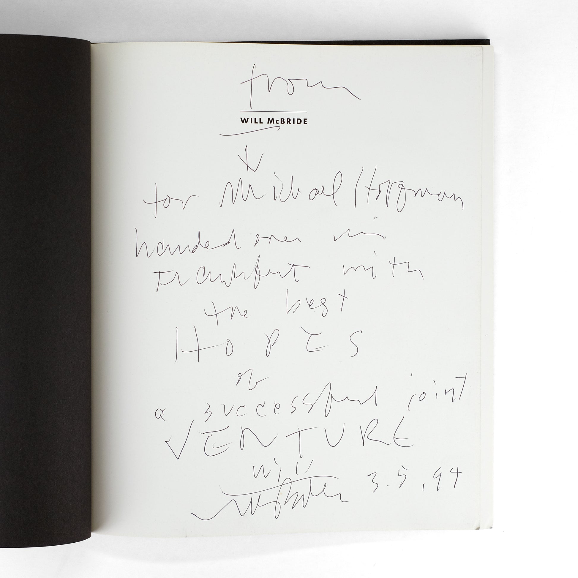Presentation copy of this monograph on the work of American photographer Will McBride (1931-2015), as inscribed by him in 1994 to long-time Aperture Foundation director Michael Hoffman: "handed over in Frankfurt with the best hopes of a successful joint venture." Aperture in 1999 published McBride's Coming of Age. An uncommon survey of work by a photographer whose work remains under-appreciated in America, in part stemming from the legal and moral controversies regarding his 1975 sex-education photobook Show Me!