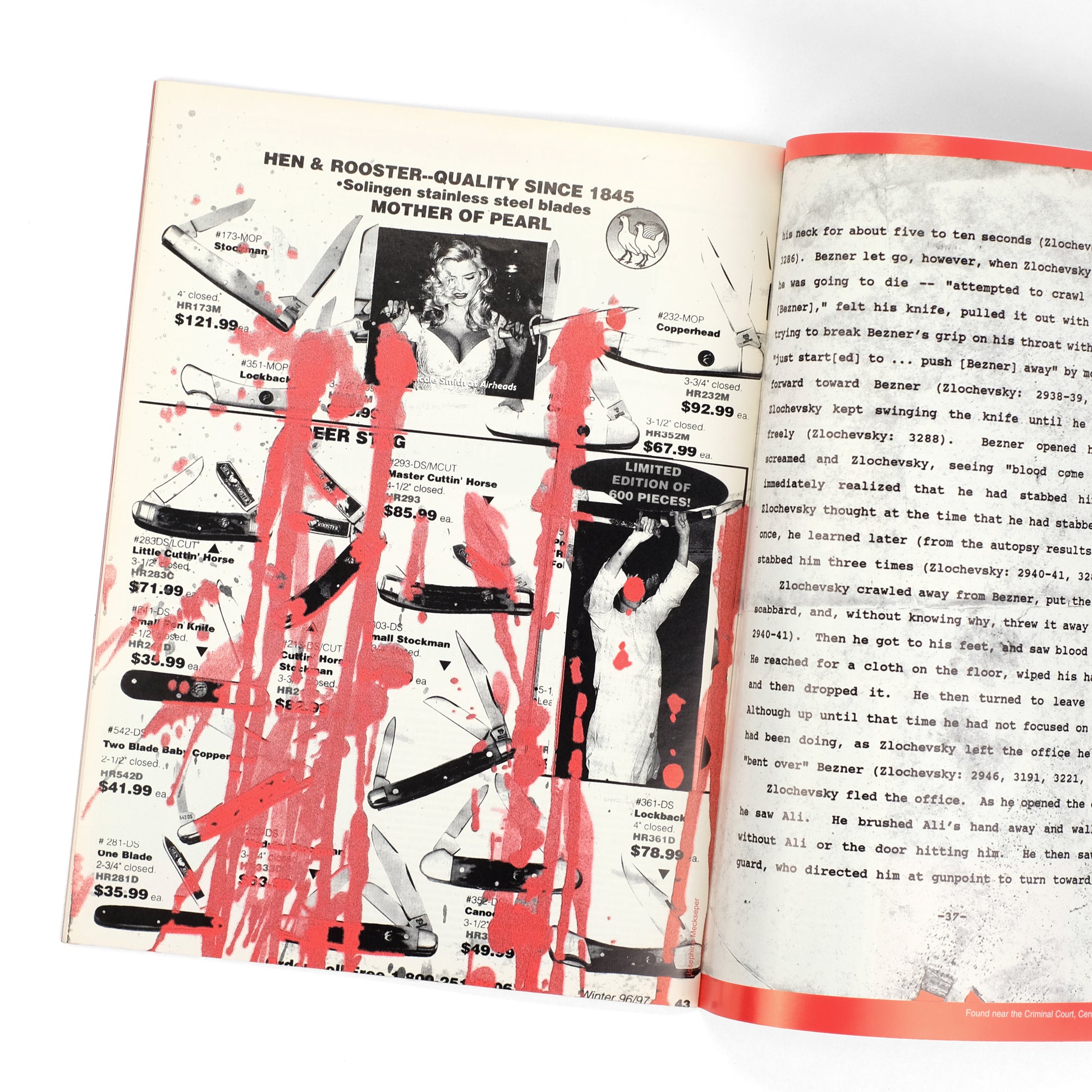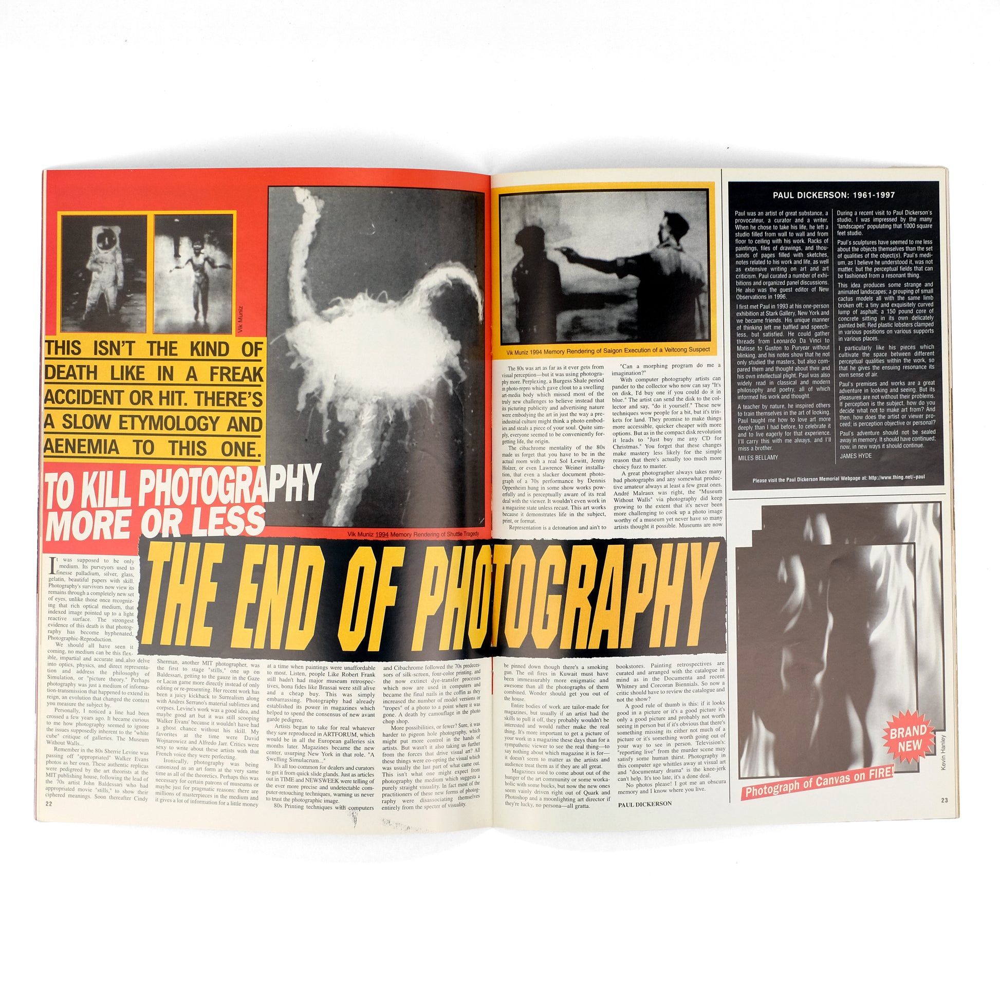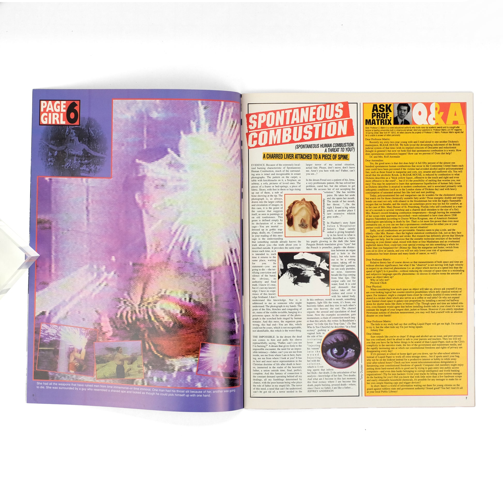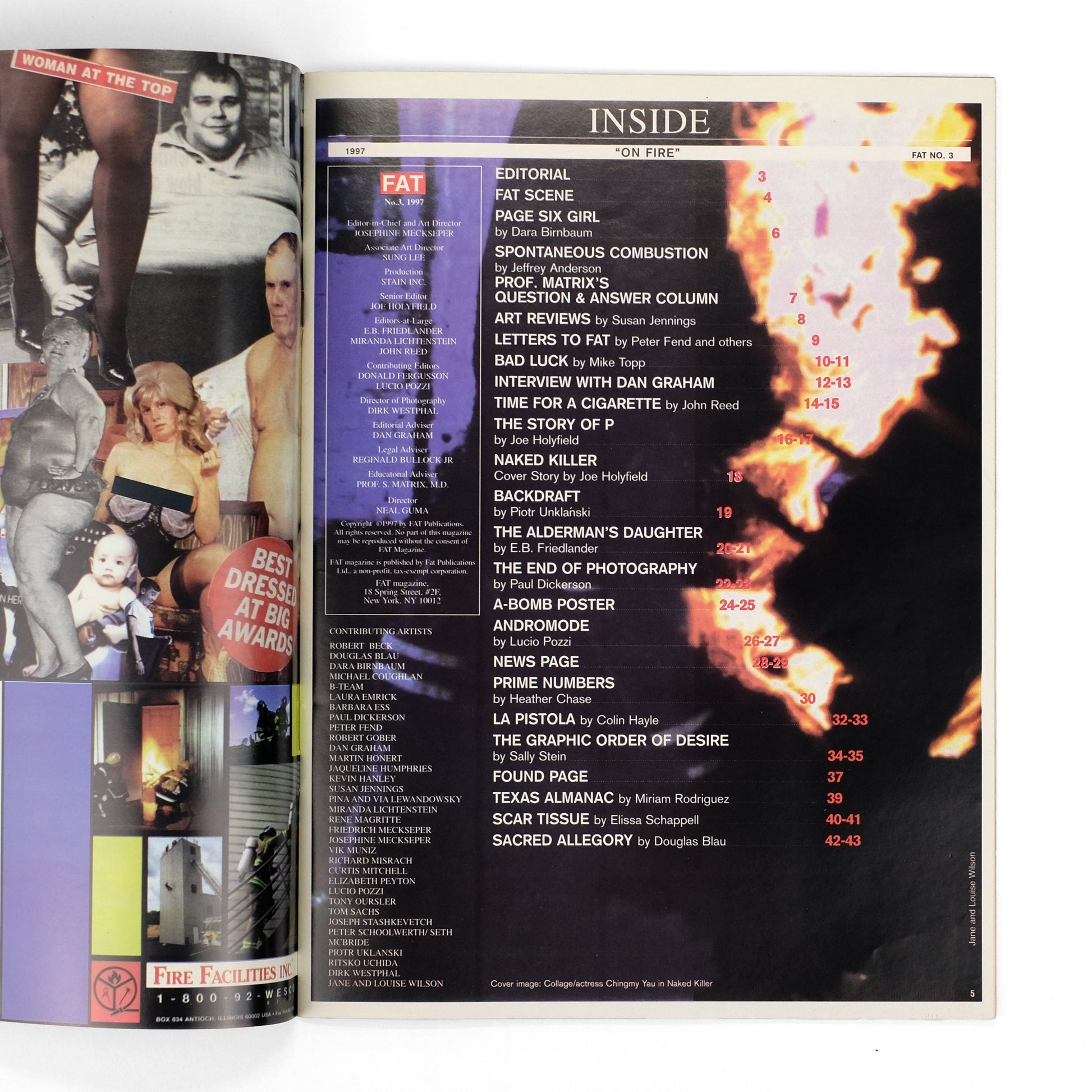 Third of five total issues of this conceptual magazine by German-born artist Josephine Meckseper (b. 1964), which took inspiration from Jean-Paul Marati's French revolutionary newspaper L'Ami du Peuple, while styling itself in the sensationalist fashion of supermarket tabloids. As Meckseper described the concept in a 2016 interview on Flash Art: "The idea was to show art works in a non-elitist, easily digestible form. Photographic reproductions and art images are subverted into a monstrous montage with representations of advertising and propaganda next to fictitious news items." This issue on the theme "On Fire," with dozens of lurid and lascivious pieces taking satirical aim at the art world. Contributors include Dara Birnbaum, Jeffrey Anderson, Susan Jennnings, Mike Topp, Dan Graham, John Reed, Joe Holyfield, Piotr Unklanski, E.B. Friedlander, Paul Dickerson, Lucio Pozzi, Heather Chase, Colin Hayle, Sally Stein, Mirian Rodriguez, Elissa Schappell, Douglas Blau, et al. Meckeseper produced four issues of FAT in its initial run between 1994-2000; a fifth issue followed in 2018. Early issues are remarkably scarce in the trade; OCLC locates holdings only at MoMA and the Smithsonian. Aarons & Roth, In Numbers, pp. 160-164.