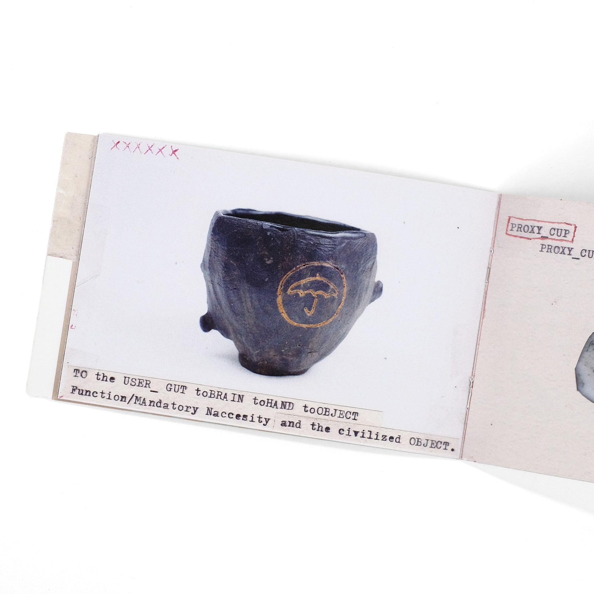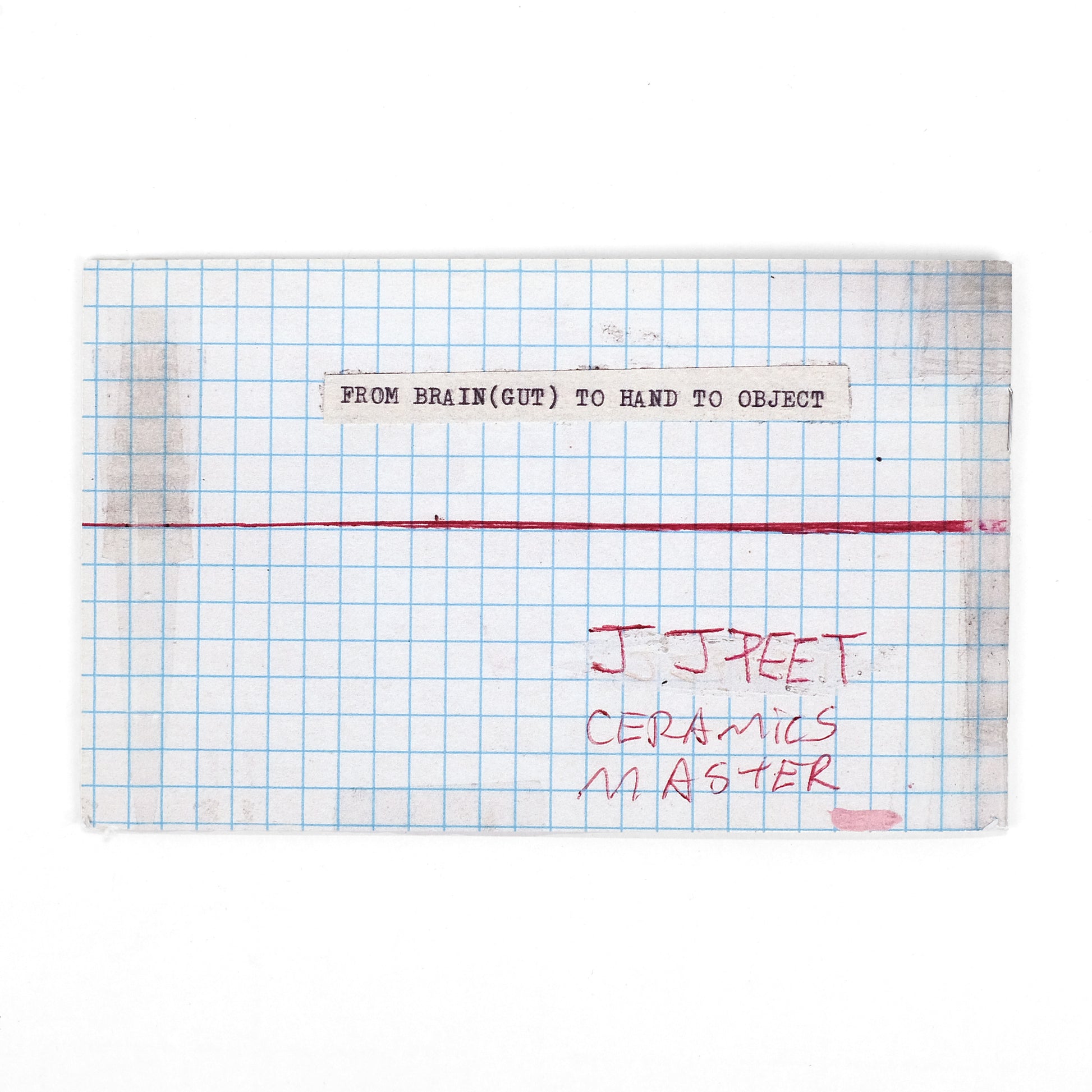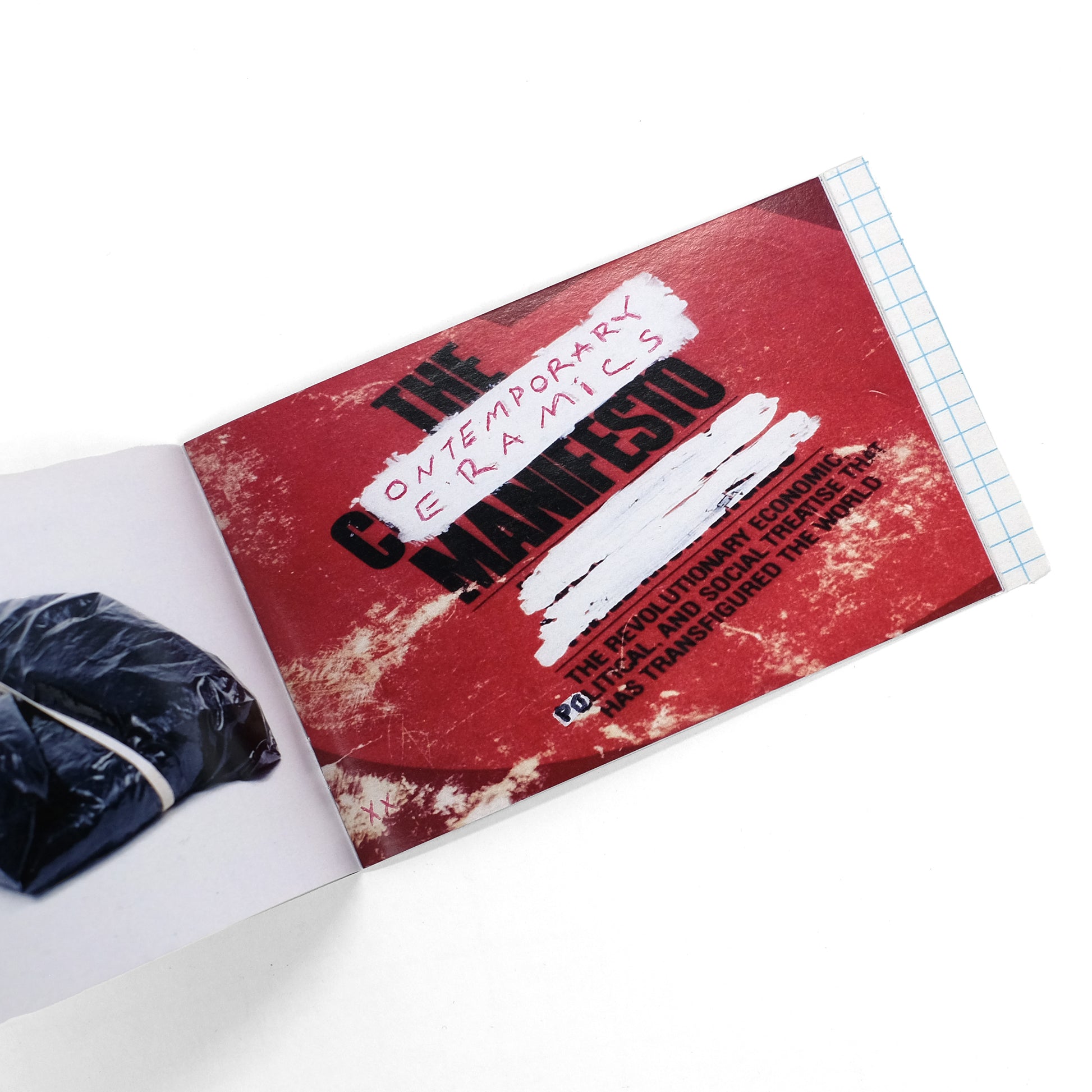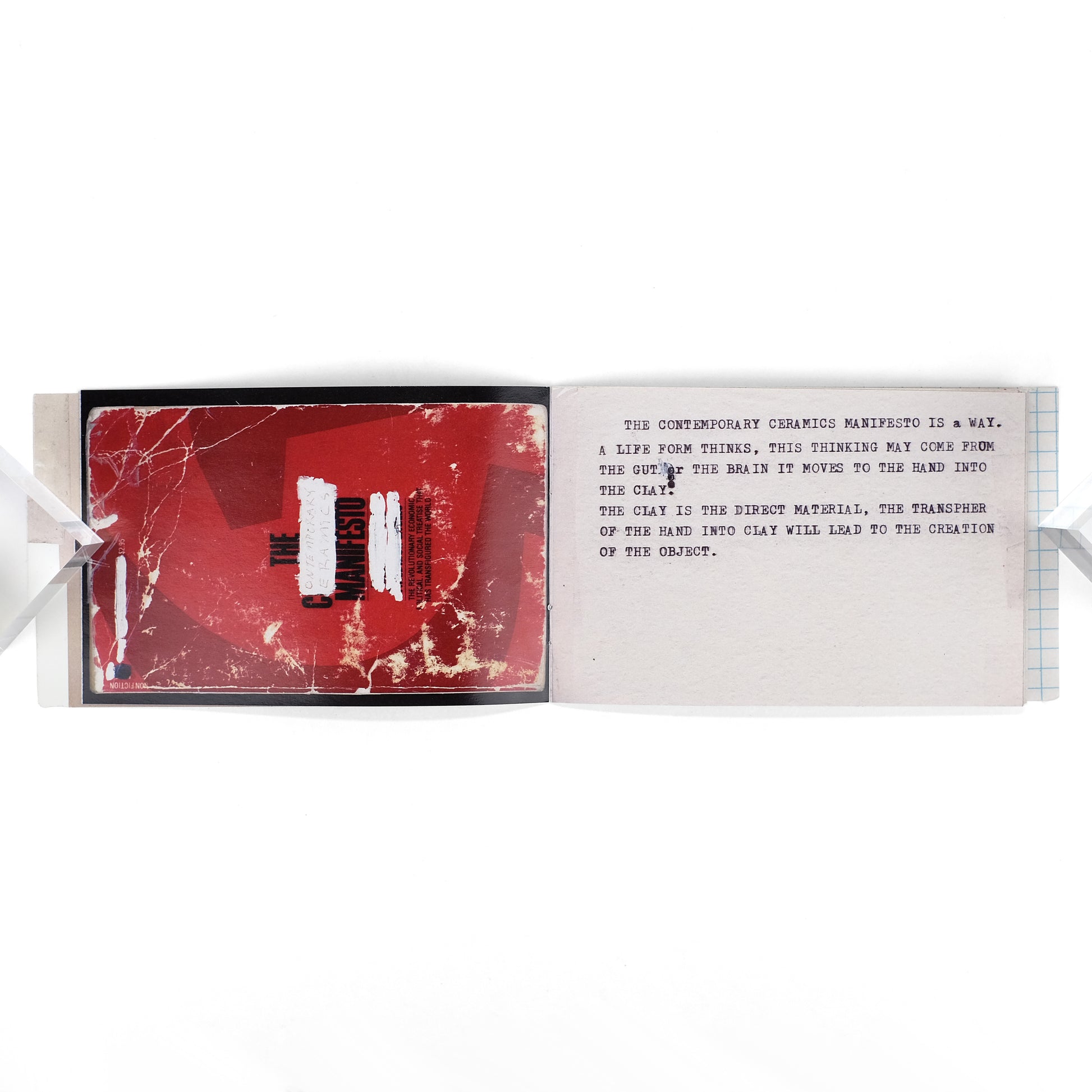 Artist's book by New York-based ceramicist JJ Peet, sharing its diminutive format with several other such works which Peet refers to as "Book Reports." Images of works collaged together with reproduced typescript and holograph elements, including the text of Peet's "Contemporary Ceramics Manifesto," as well as the object sharing that name: an altered-book copy of Marx's Communist Manifesto. That work includes the text "Brand to Hand to Object," which was also the title of a 2015 exhibition of Peet's work at the Gatehouse Gallery at the Betty and Edward Marcus Sculpture Park at Laguna Gloria, in Austin, Texas
