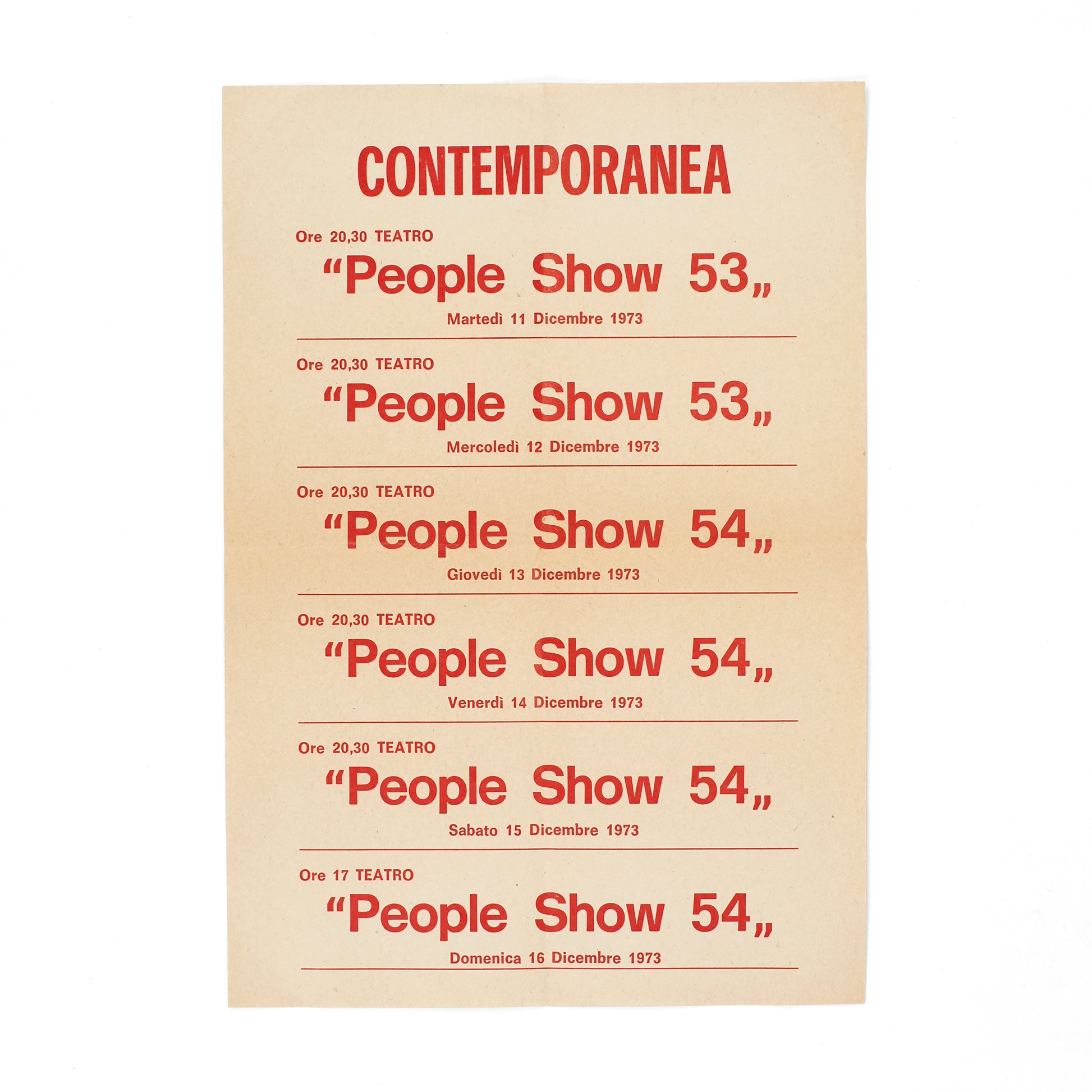 Handbill advertising six performances by UK theatre company People Show (two titled "People Show 53" and four titled "People Show 54"), staged from December 11-16, 1973 at the Contemporanea art exhibition in Rome. Formed in 1966 by polymathic poet Jeff Nuttall and others, the People Show is the longest-running UK experimental theatre troupe; core members at the time of these performances included Mark Long, Laura Gilbert, Mike Figgis and Jose Nava. Recognized as one of the most important art exhibitions of the 20th century, Contemporanea was spearheaded by Italian critic and curator Achille Bonito Oliva, and ran from November 1973 until February 1974 in the underground parking garage at the Villa Borghese. OCLC locates no holdings of this handbill.