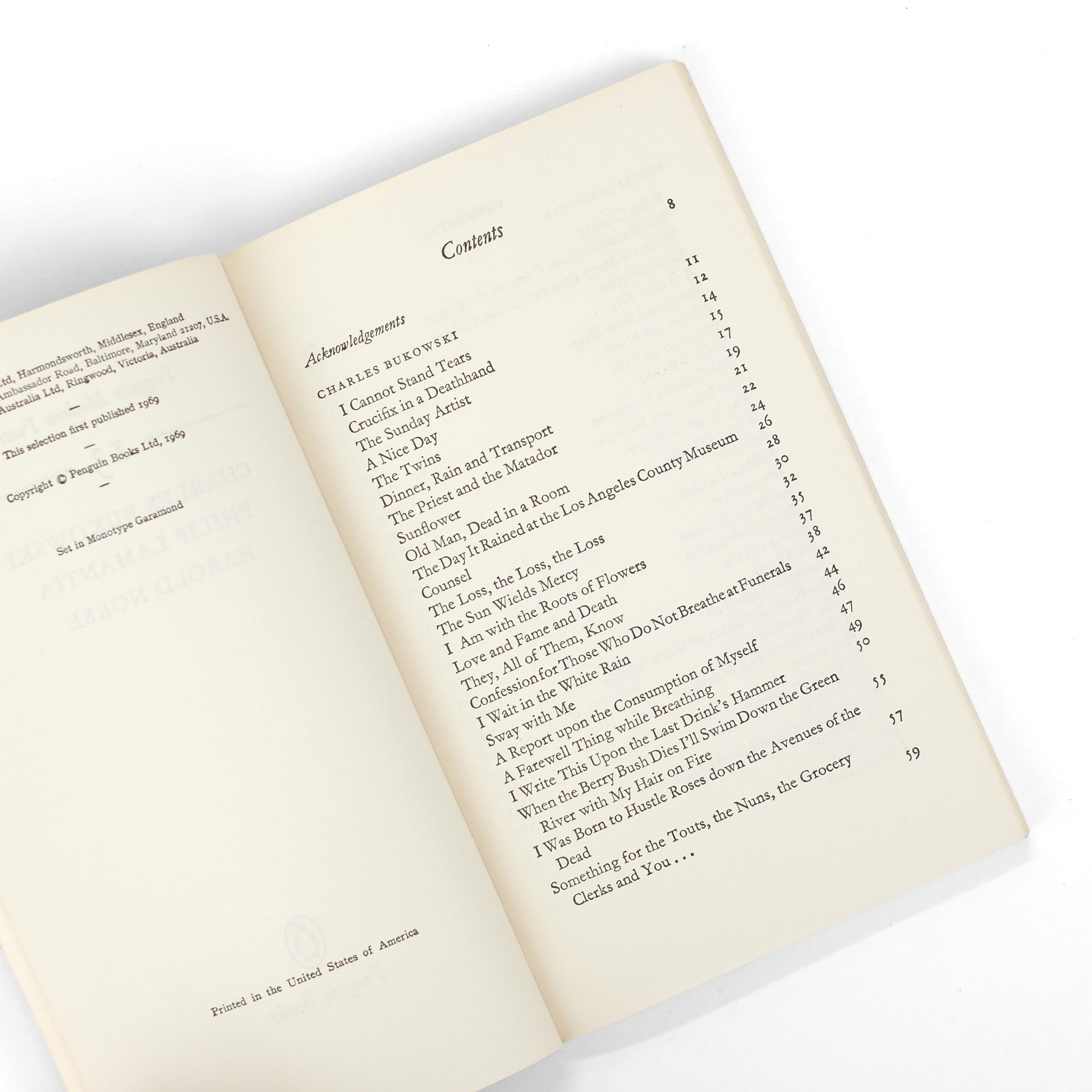 A nice copy of the thirteenth volume in the Penguin Modern Poets series, featuring a selection of verse by American writers Charles Bukowski, Philip Lamantia, and Harold Norse. Cover design by Alan Spain.