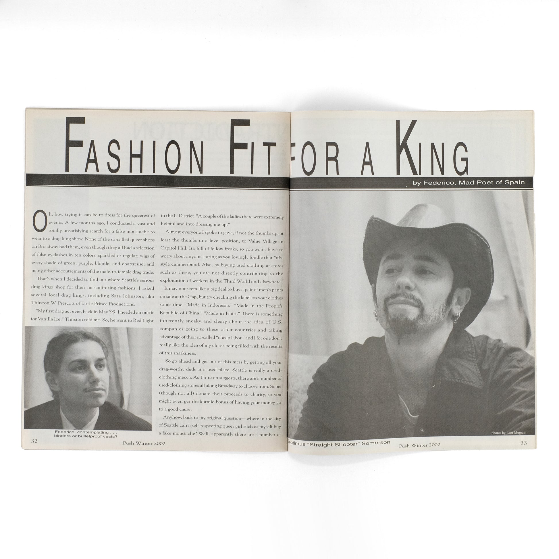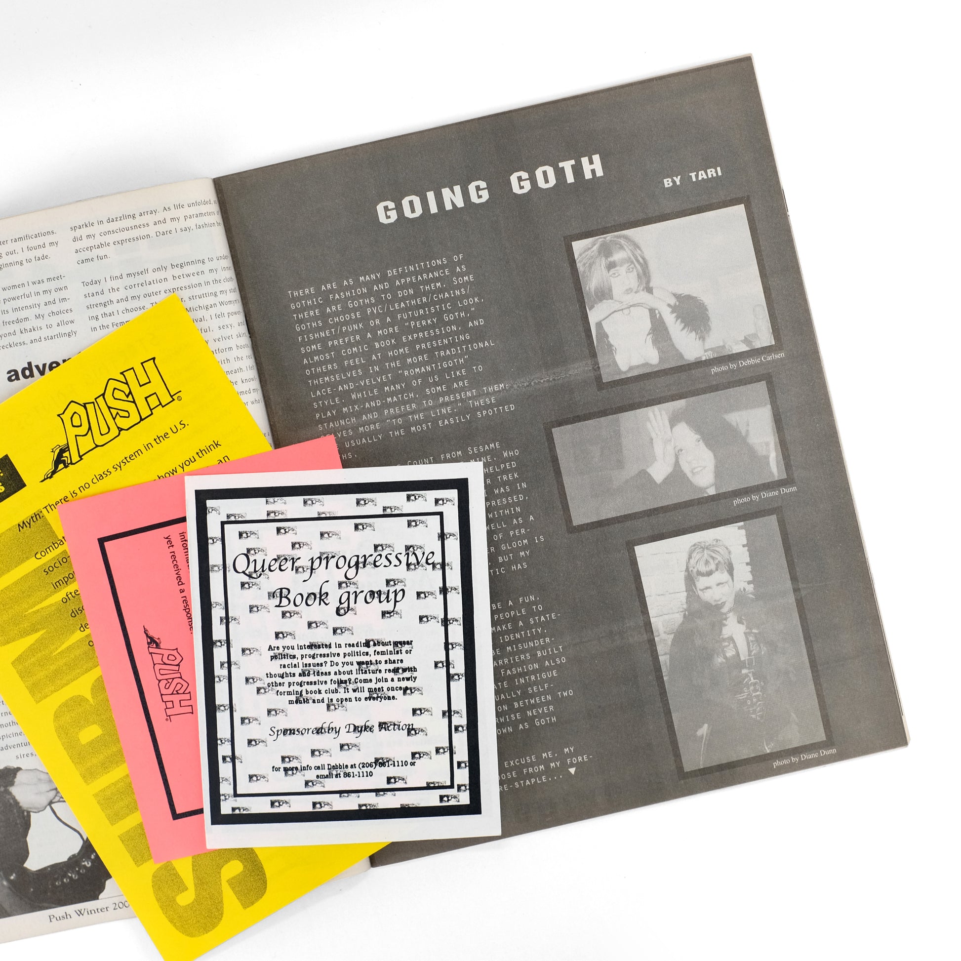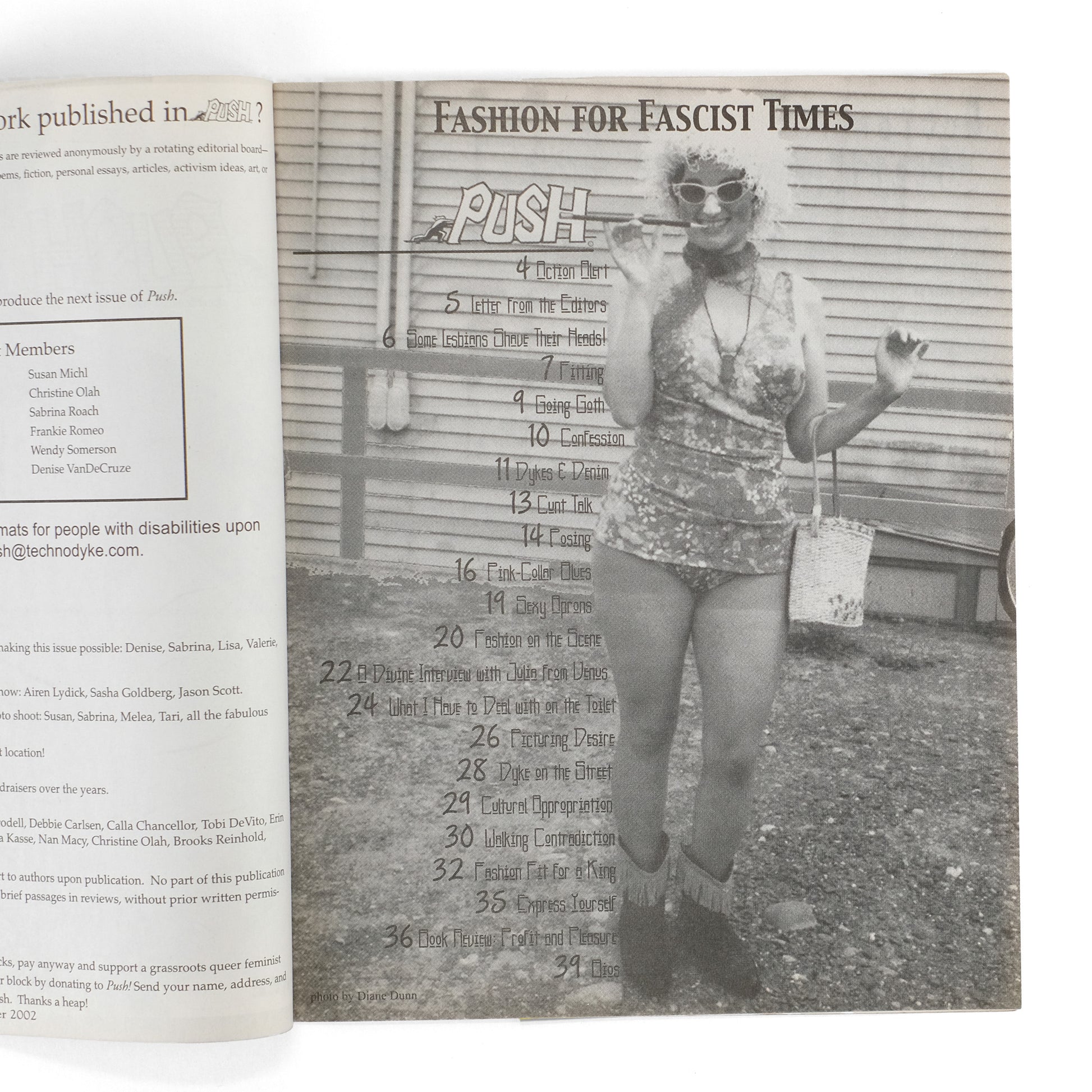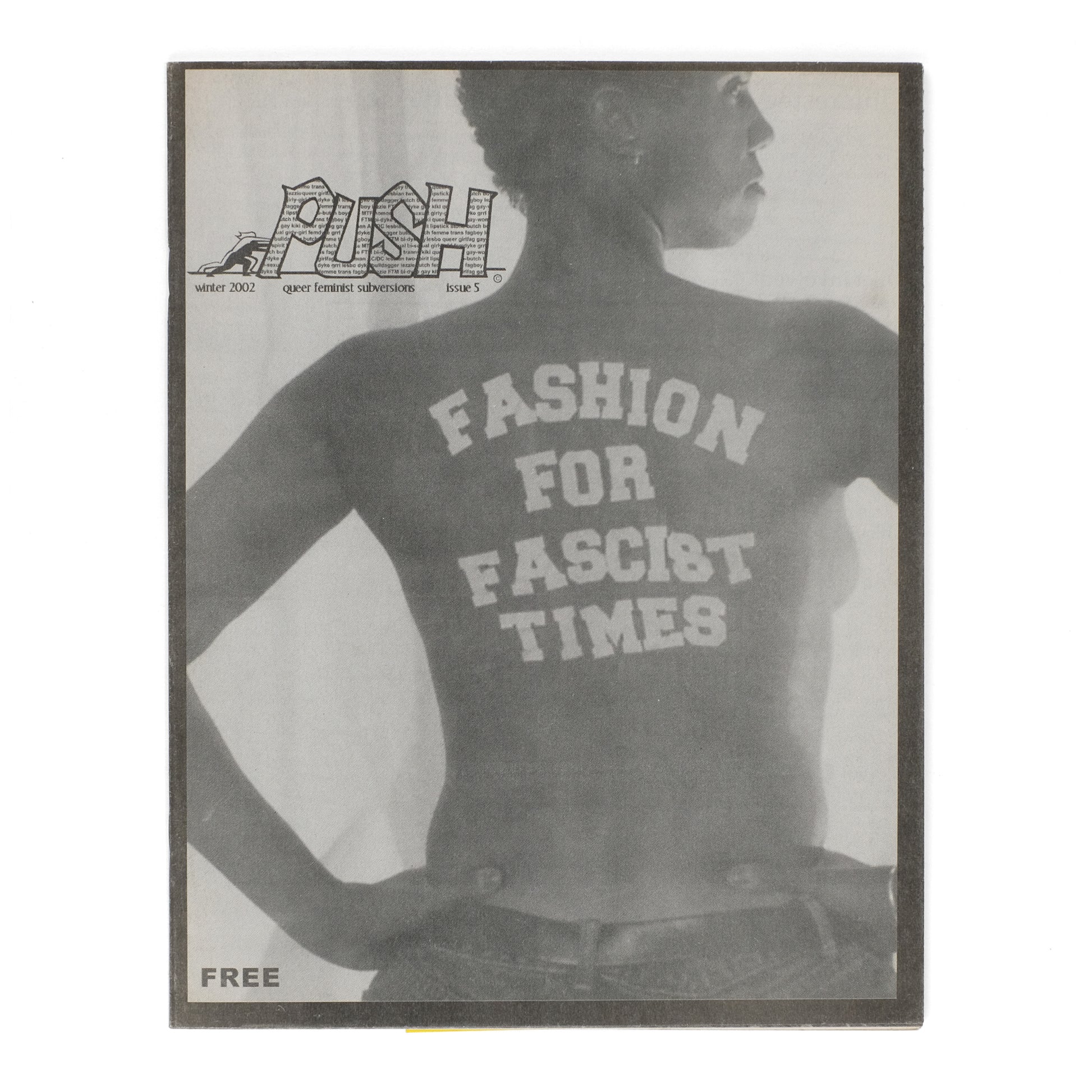 The fifth of eleven total issues of this "grassroots queer feminist" periodical, published between 1999 and 2008; subtitled "Fashion for Fascist Times," with numerous articles on this theme, including "Fitting" by S. Michl, "Going Goth" by Tari, "Dykes & Denim" by Elese Lebsack, "My Inhibitions and My Pants: How I Dropped Them" by Sabrina Dee, "Pink-Collar Blues" by Jill Moffett, "Cultural Appropriation: Fashionable White Racism," by Emily Thuma, "Fashion Fir for a King," by Federico, etc. Also poems, photographs and photospreads, book reviews, and a list of upcoming and ongoing Seattle activist events. Laid into this copy, as issued, are three handbills: one soliciting contributions for the next issue, one advertising a "queer progressive book group," and one reporting that Push's former printer dropped them for "objectionable content" after their "Sex and Genderfuck" issue. OCLC locates holdings only at Washington, Michigan, and the San Francisco Public Library.