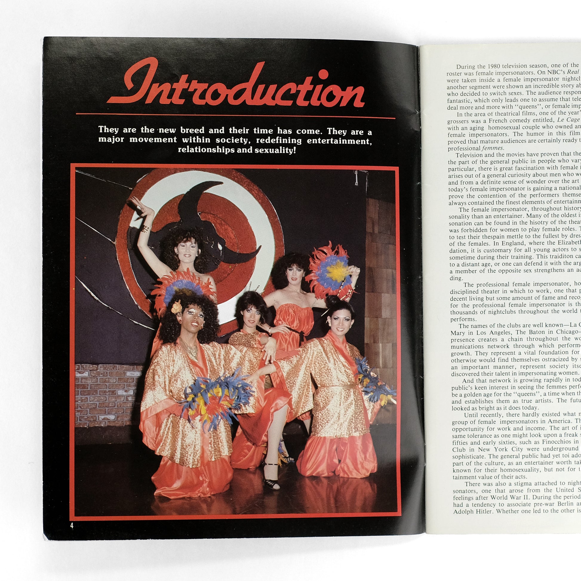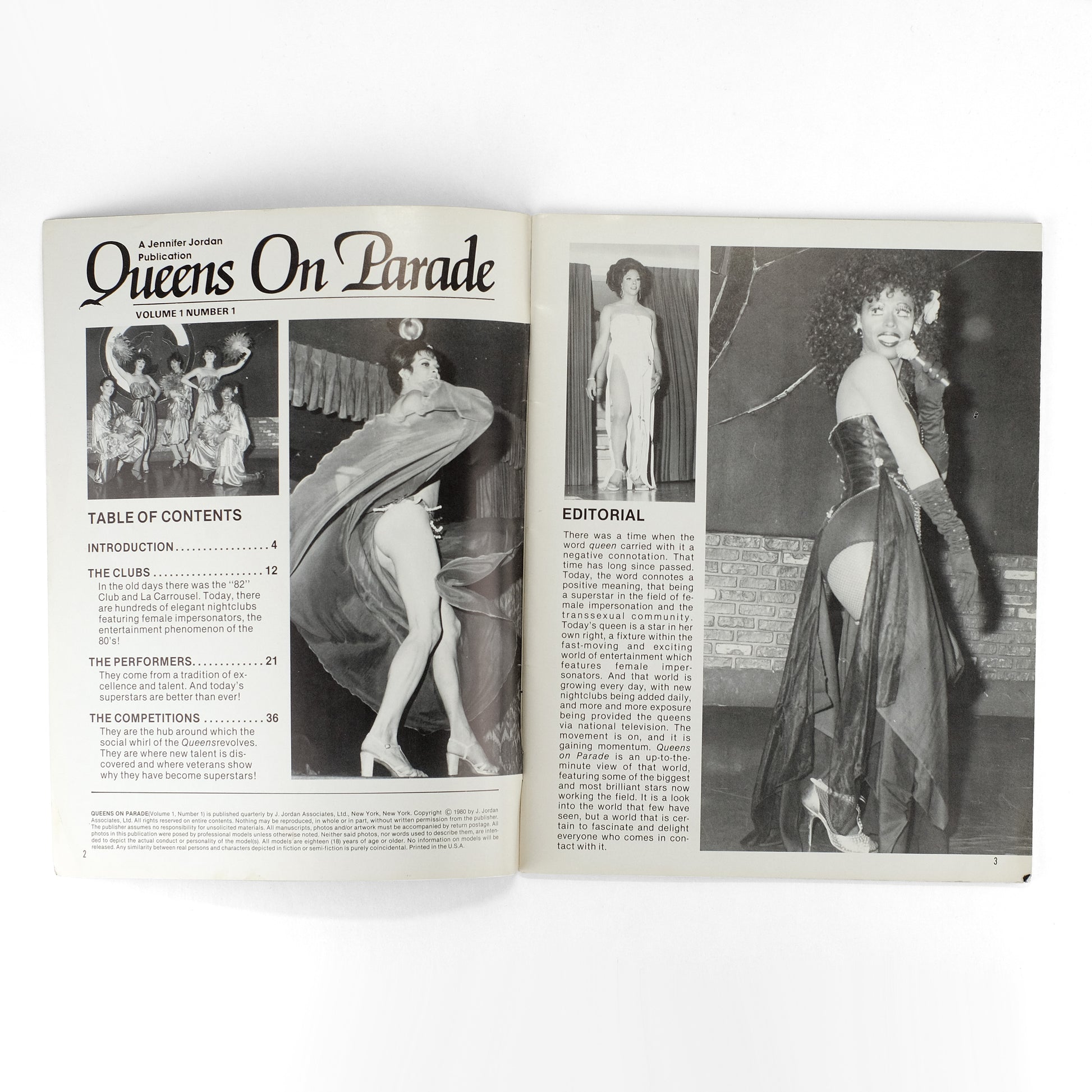 First issue of this periodical surveying the world of drag queens, with a long introduction on the appeal and (20th century) history of female impersonation, and articles on notable drag clubs, performers, and competitions. Heavily illustrated throughout in black-and-white, with a few pages in color. Mild nudity. OCLC locates four institutions holding copies of this title.